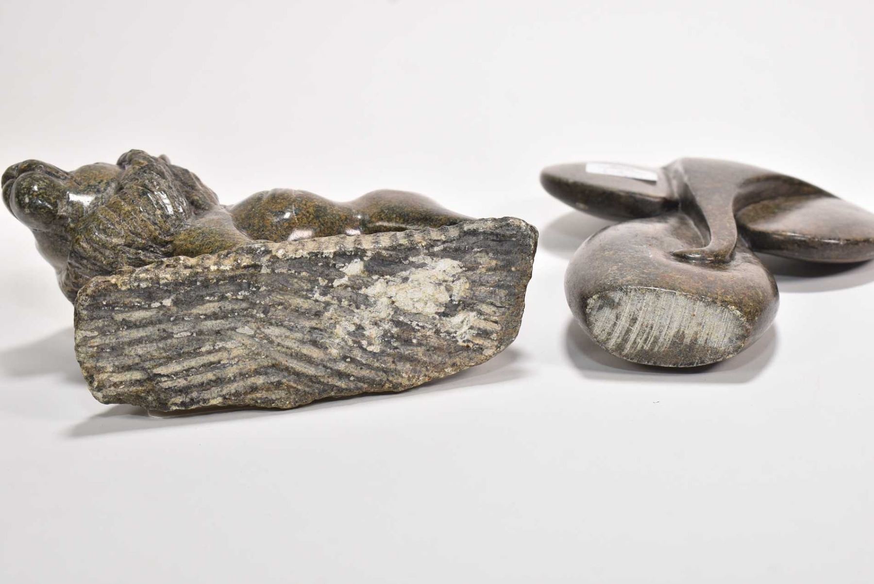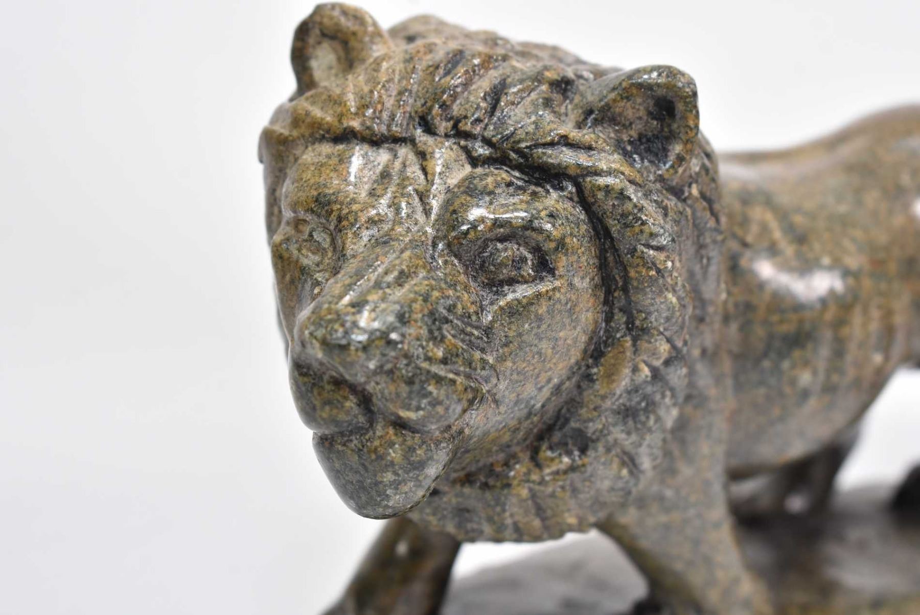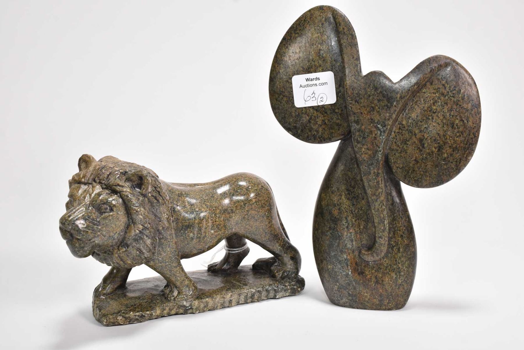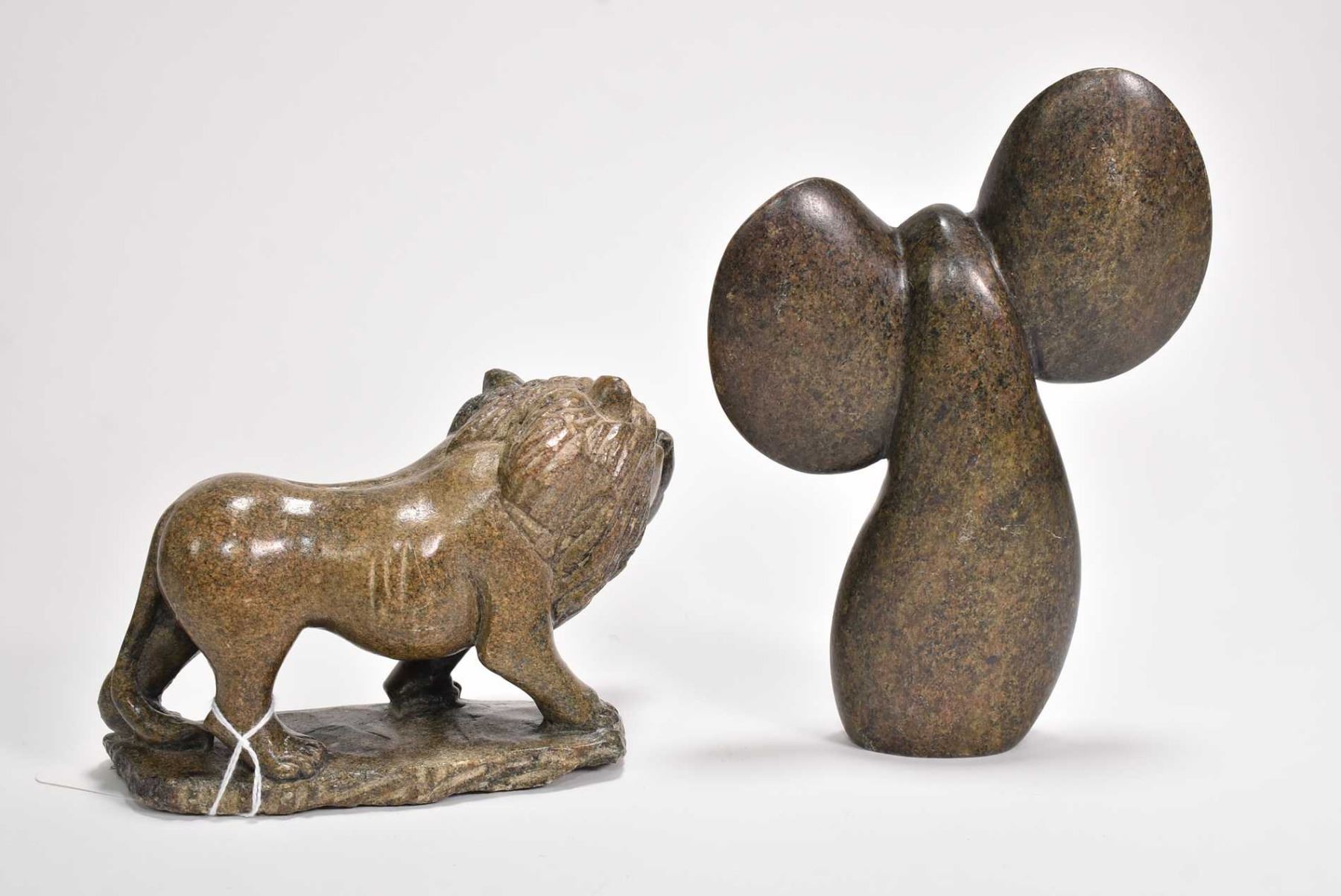 Two carved soapstone figures including a lion 5" in length and a stylized 7 1/4" elephant
