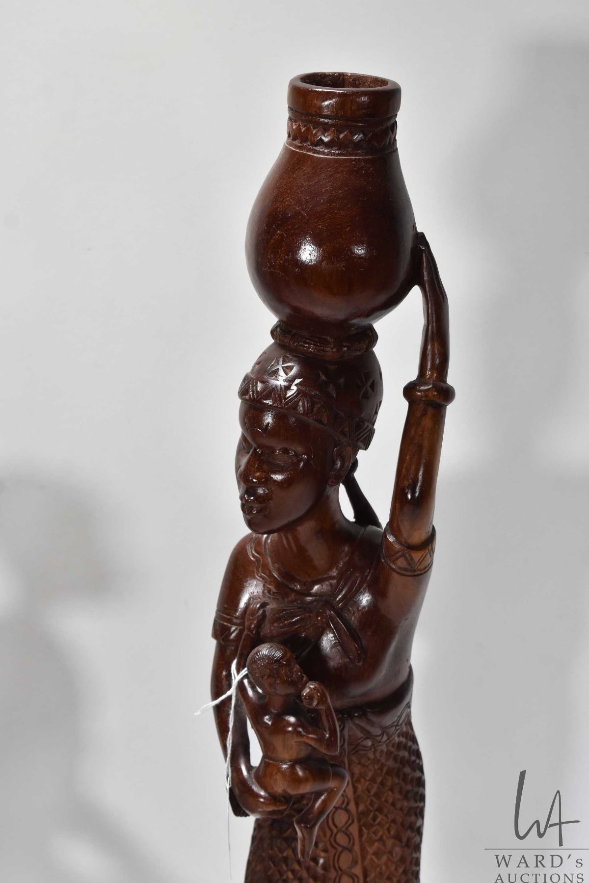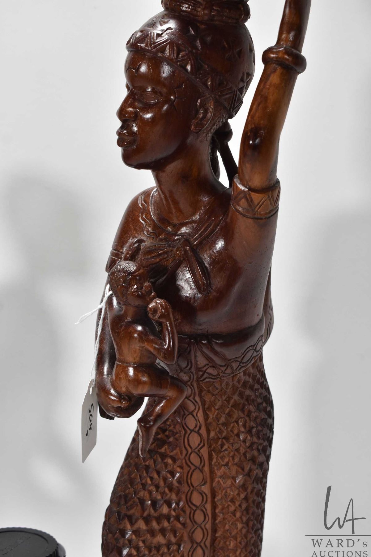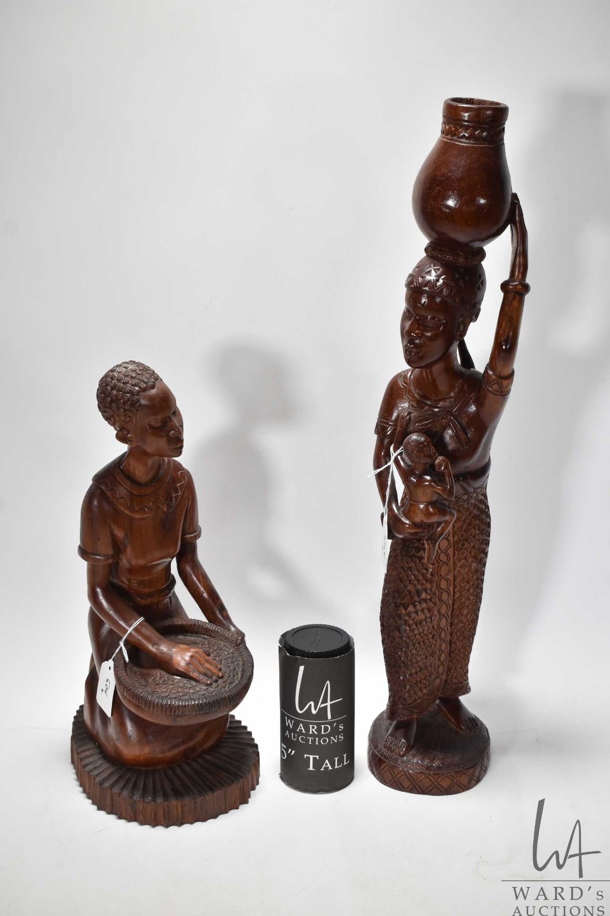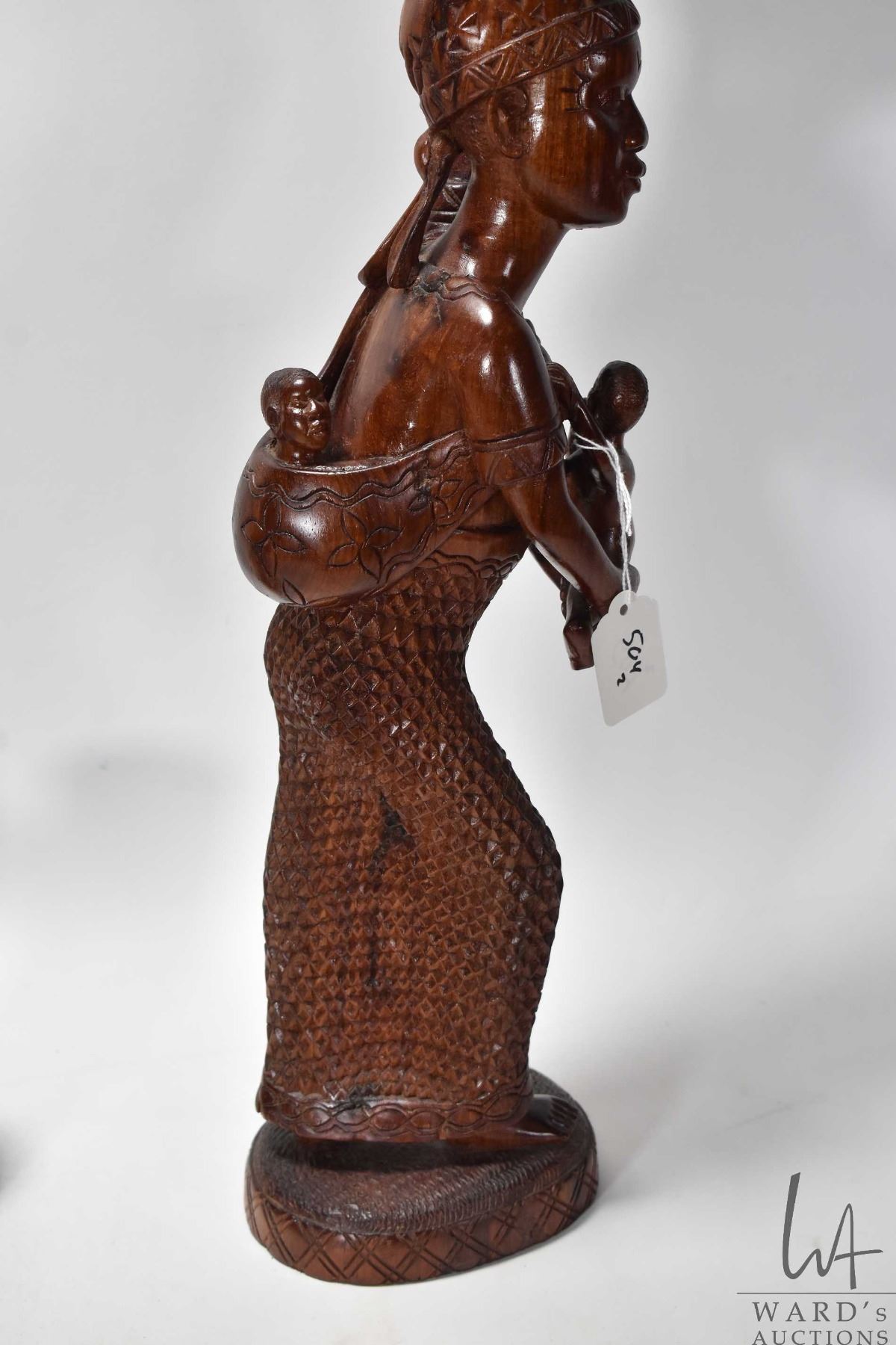 Two carved wooden figures including woman w/ two children measuring 23" high and woman w/ basket measuring 15"
