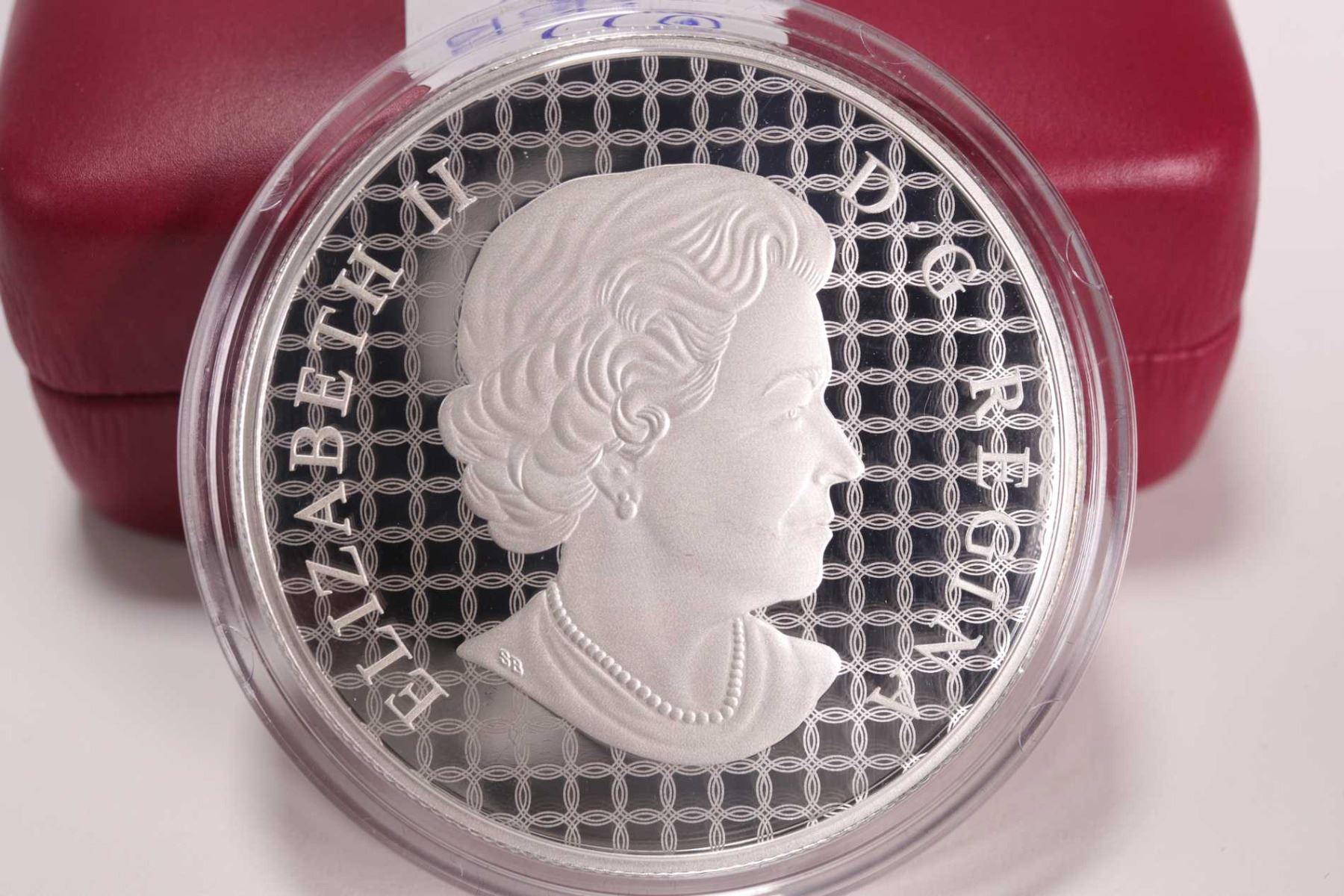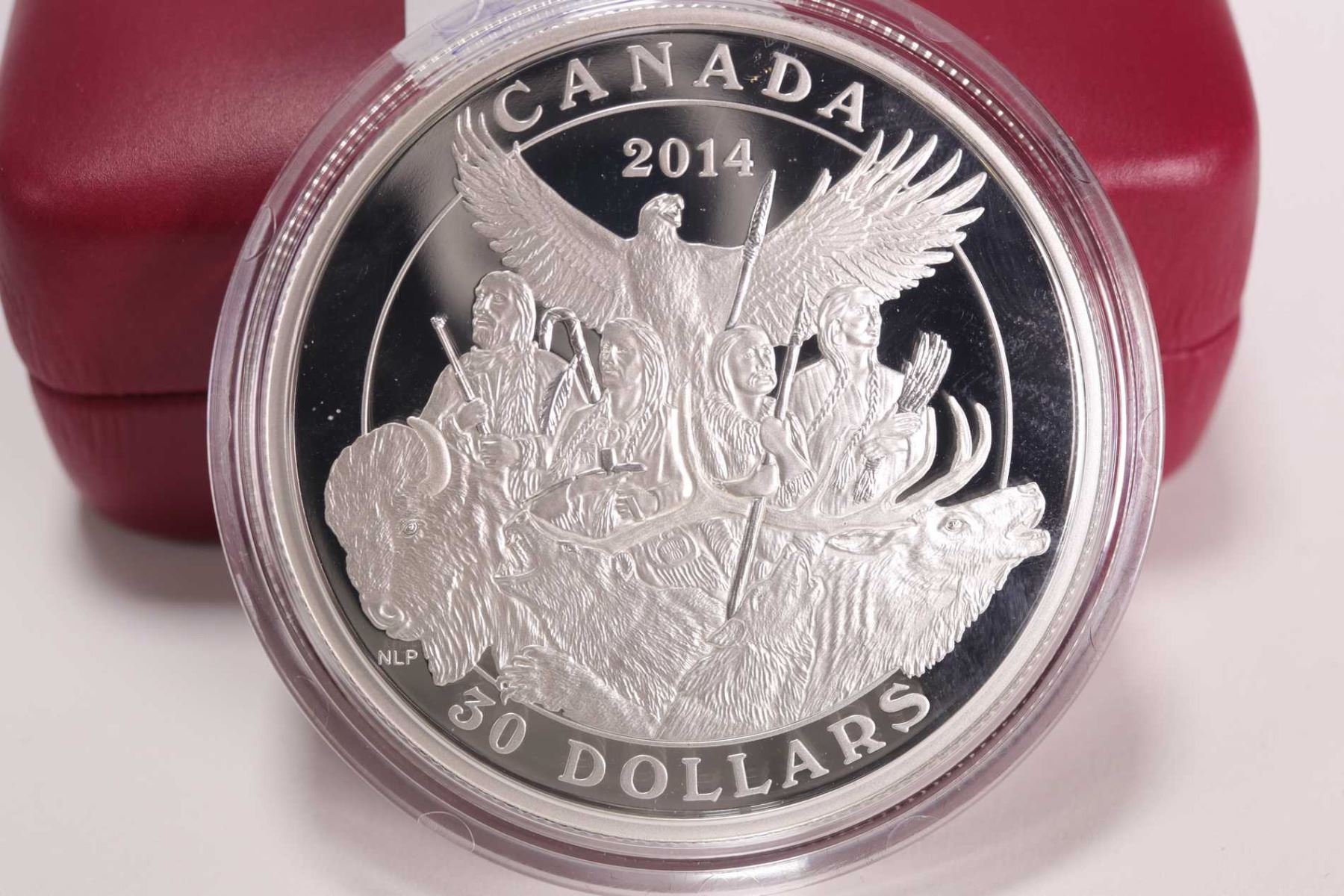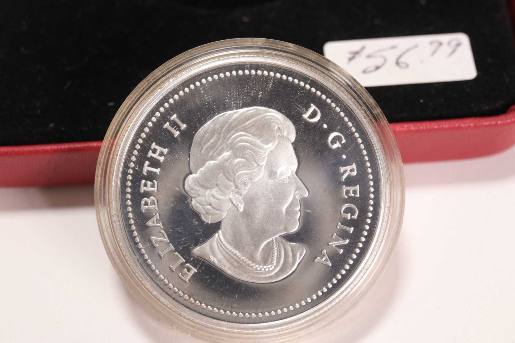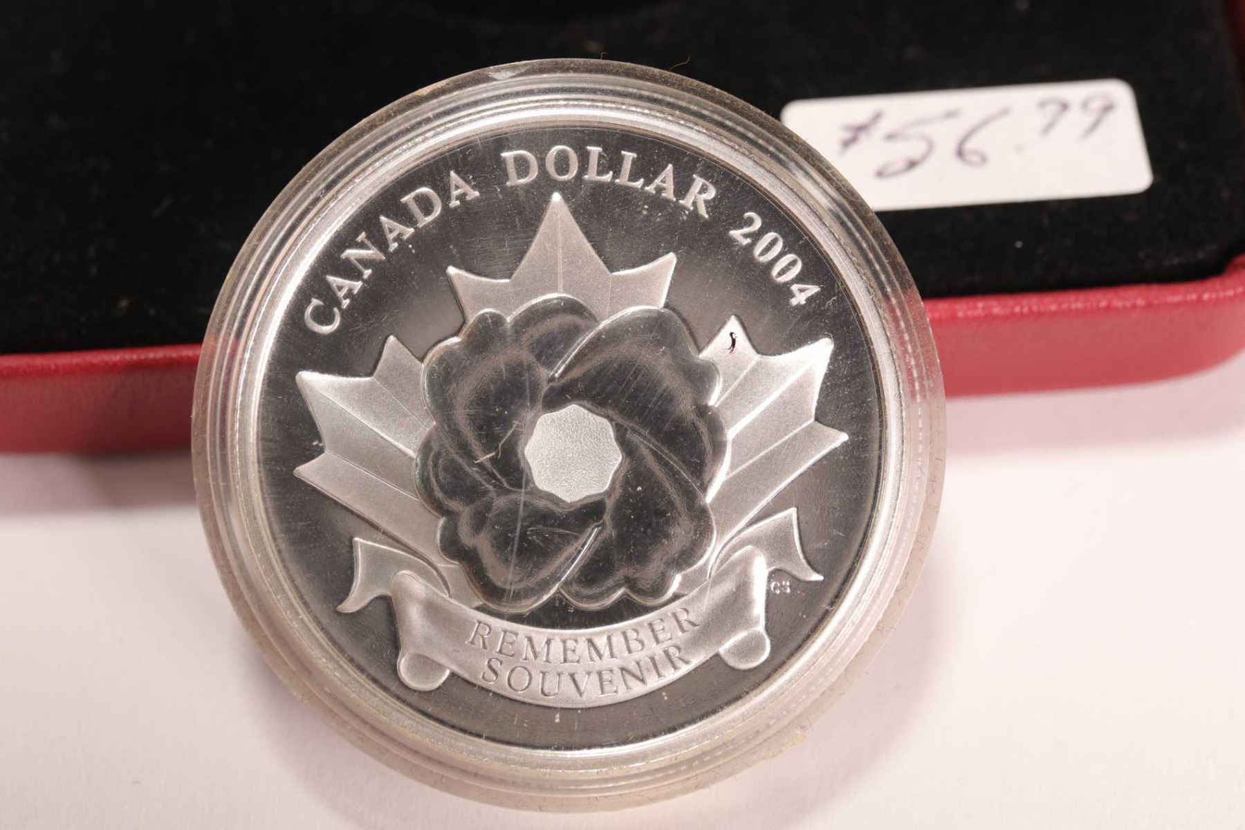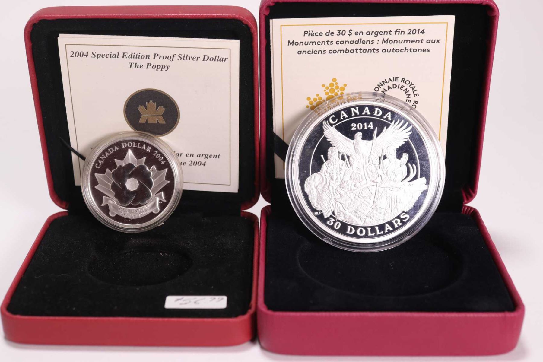 Two cased Royal Canadian Mint collector coins including 2014 $30, 62.67 gram .99.99% Fine silver "Canadian Monuments: National Aboriginal Veterans Monument" coin and a 2004, "Flower of Remembrance-The Poppy" limited edition 99.99% fine silver 36.07 gram coin, 13653/25000
