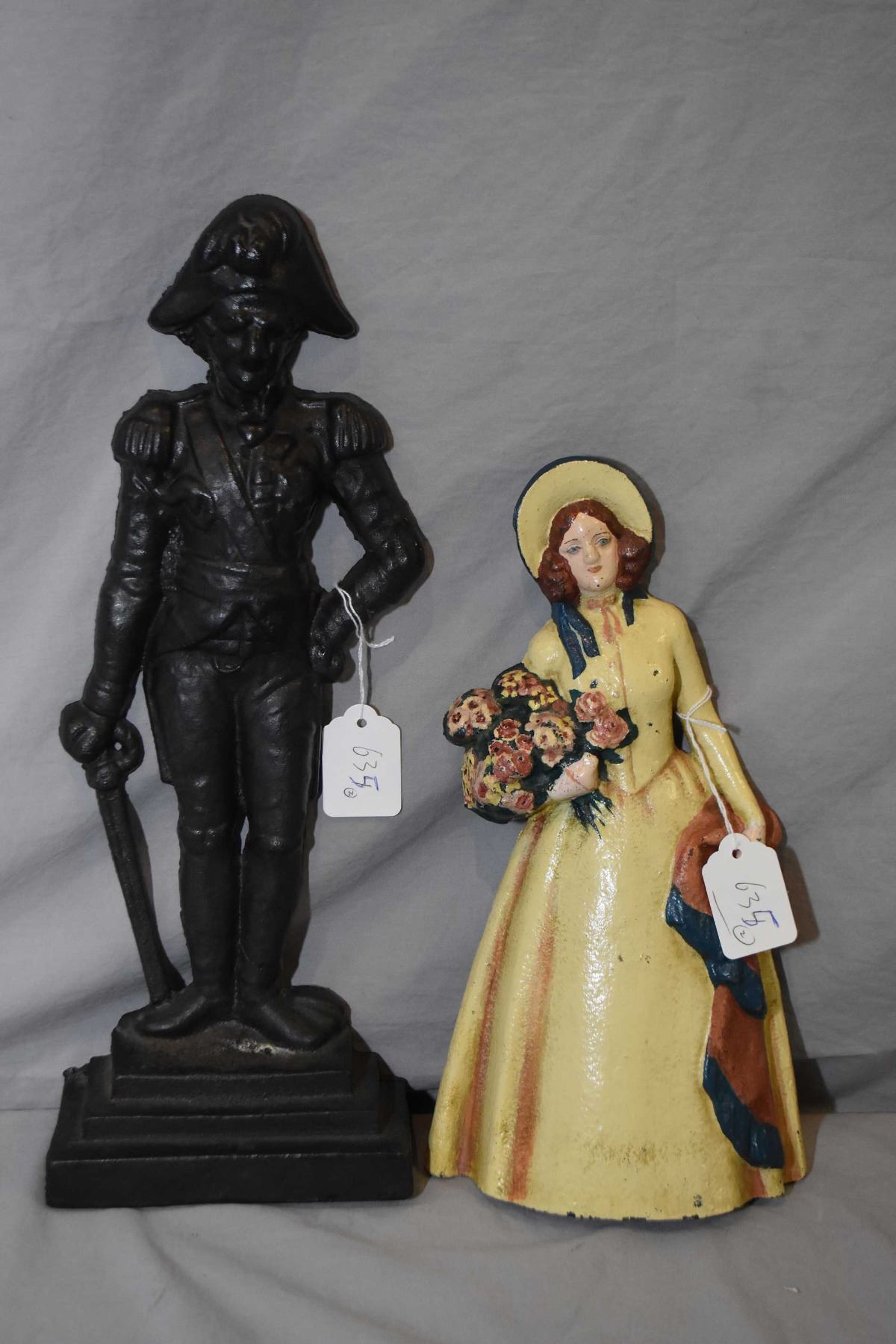 Two cast metal doorstops including Napoleon figure 15" and a young girl with flower basket