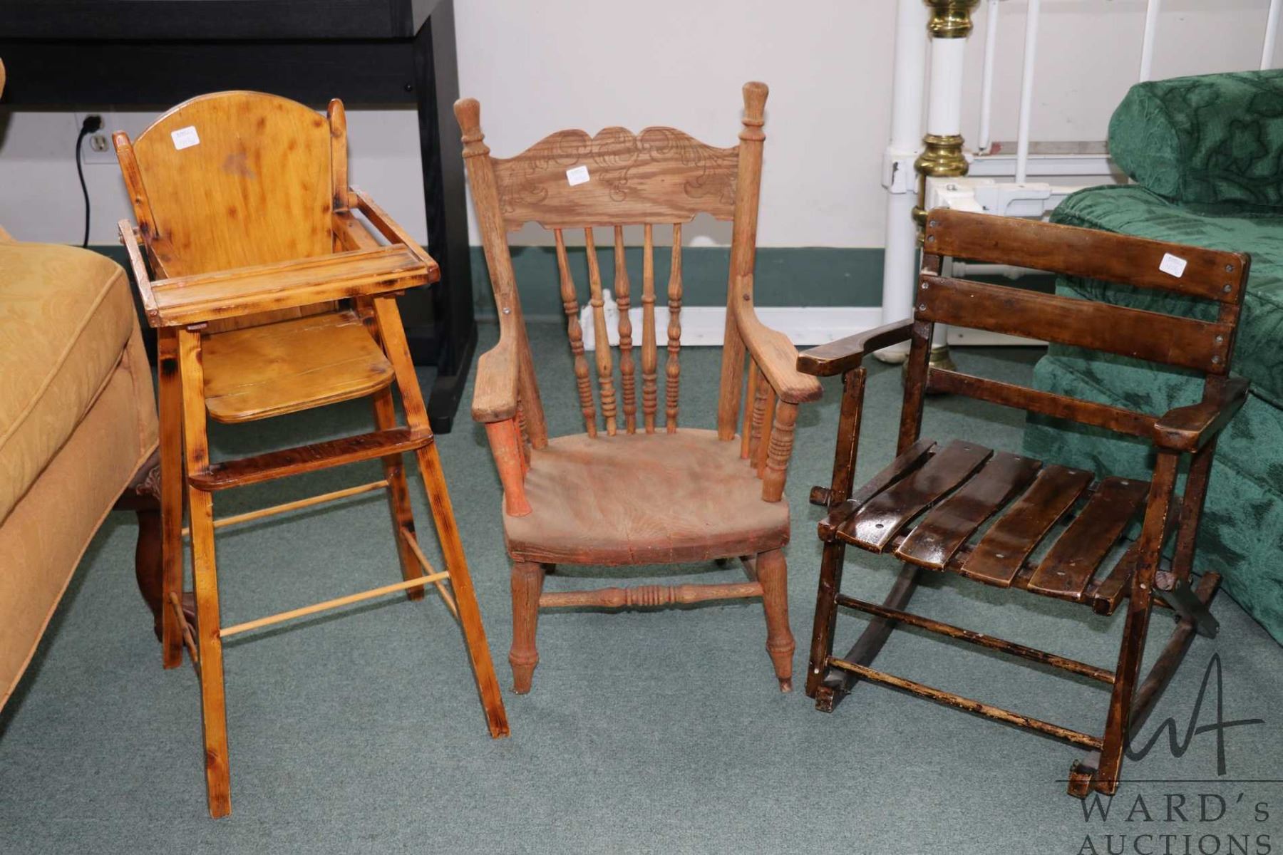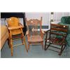 Two child sized rocking chairs, one missing runner and a 27" high doll's high chair