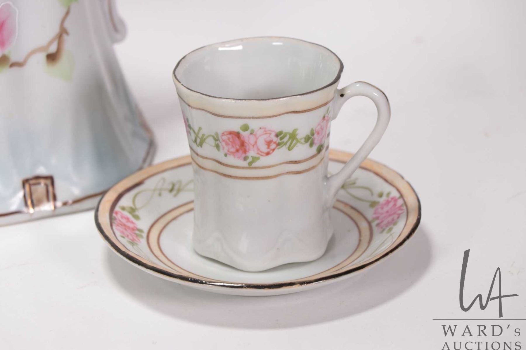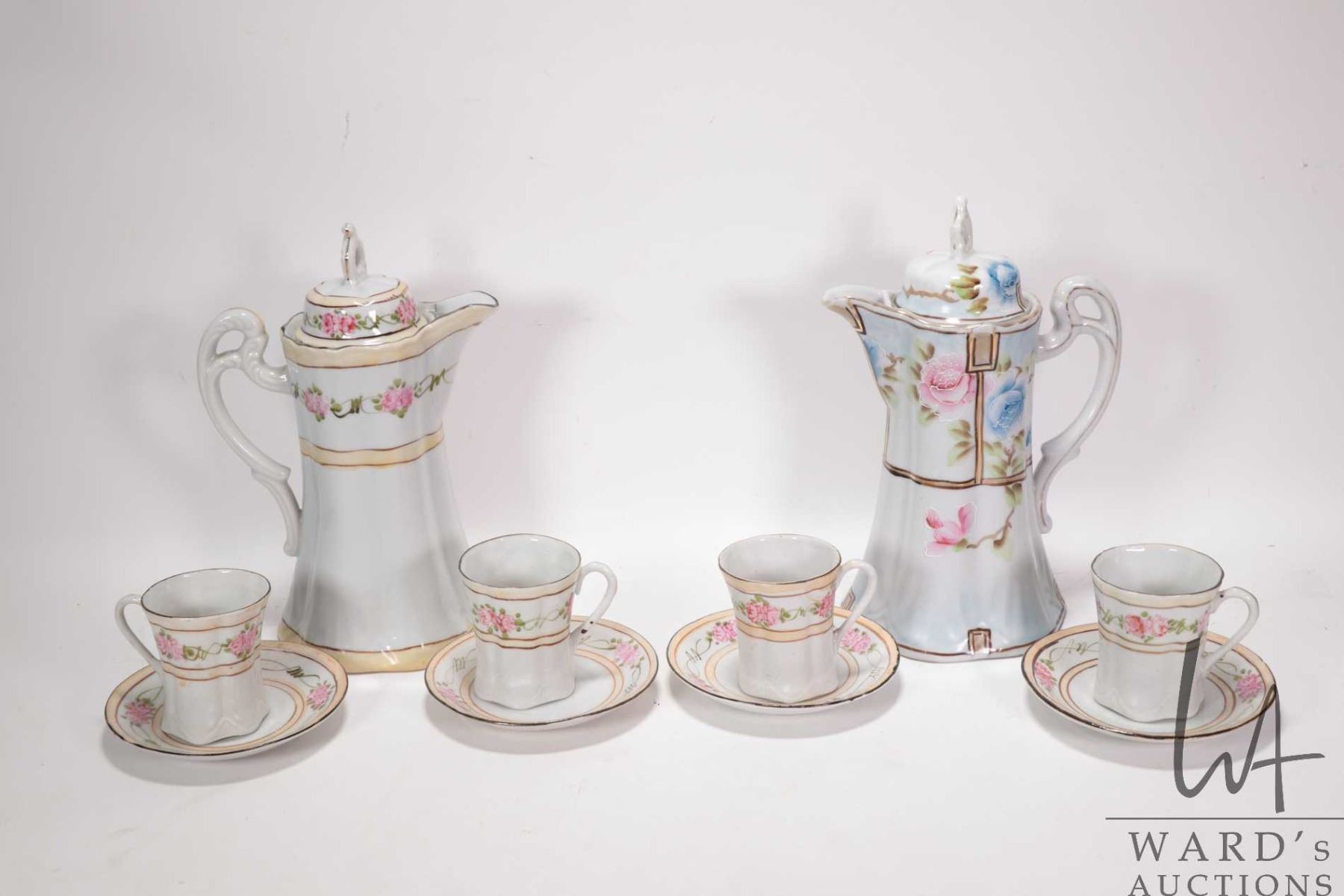 Two cocoa pots including one hand painted Nippon with four matching cups and saucers and a hand painted China pot. Note: No shipping for this lot. Local pickup only