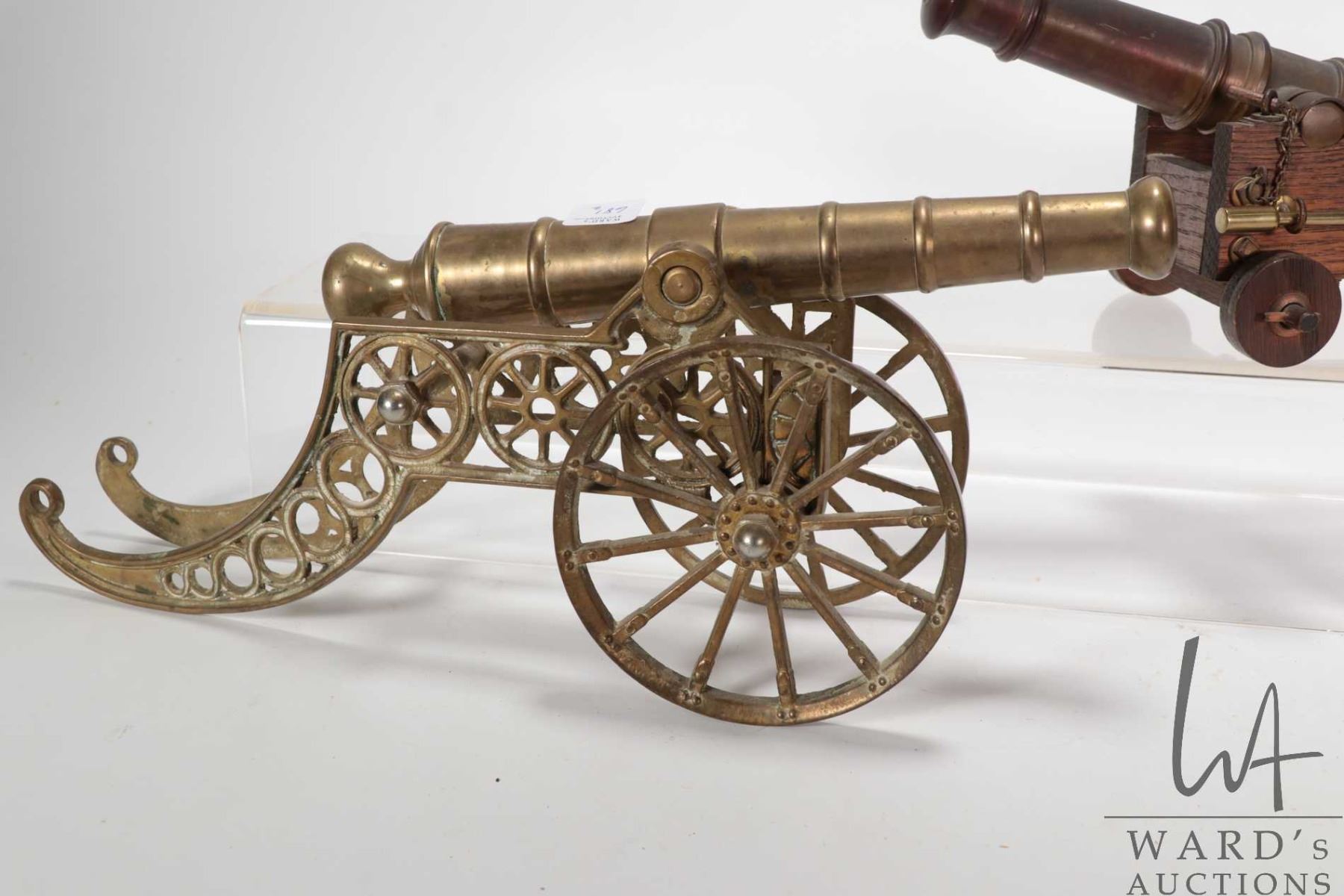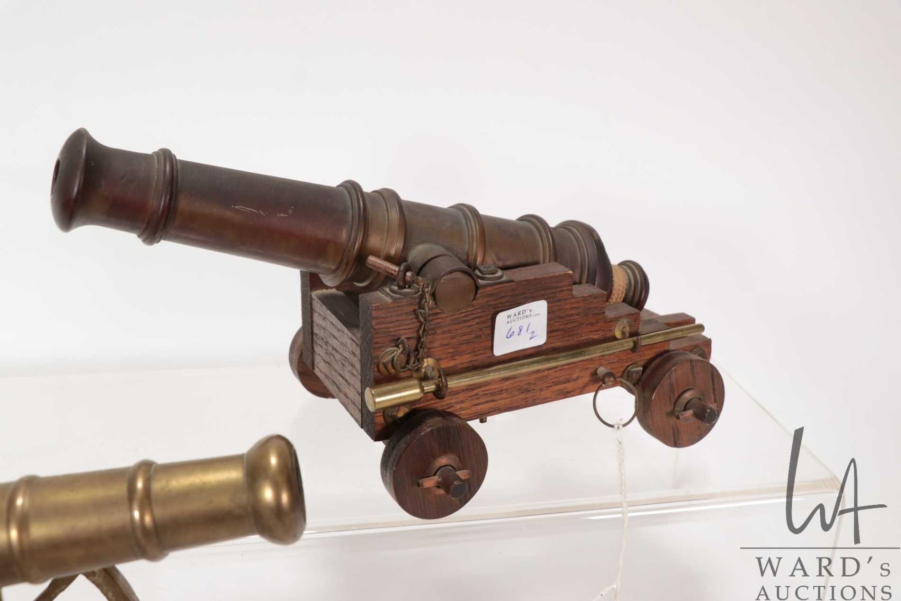 Two collectible cannons including brass cannon on cart 14" in length and bronze cannon on wooden cart