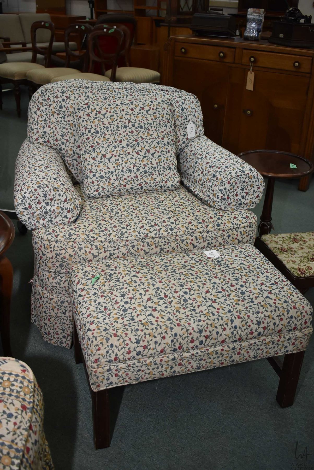 Two country style upholstered parlour chairs made by C.R. Lane plus one foot stool