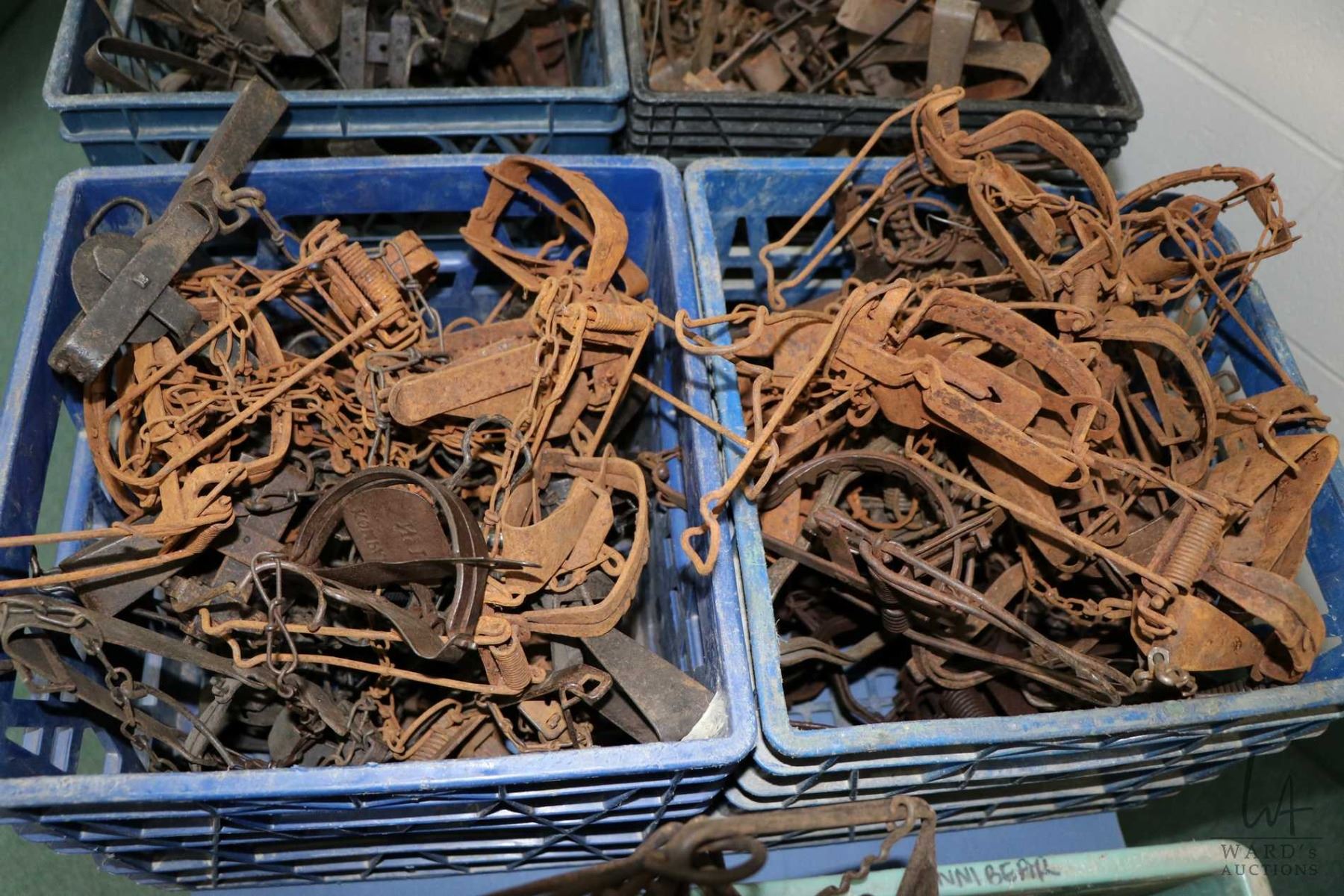 Two crates containing a selection of vintage leg hold traps, approximately 40 count.