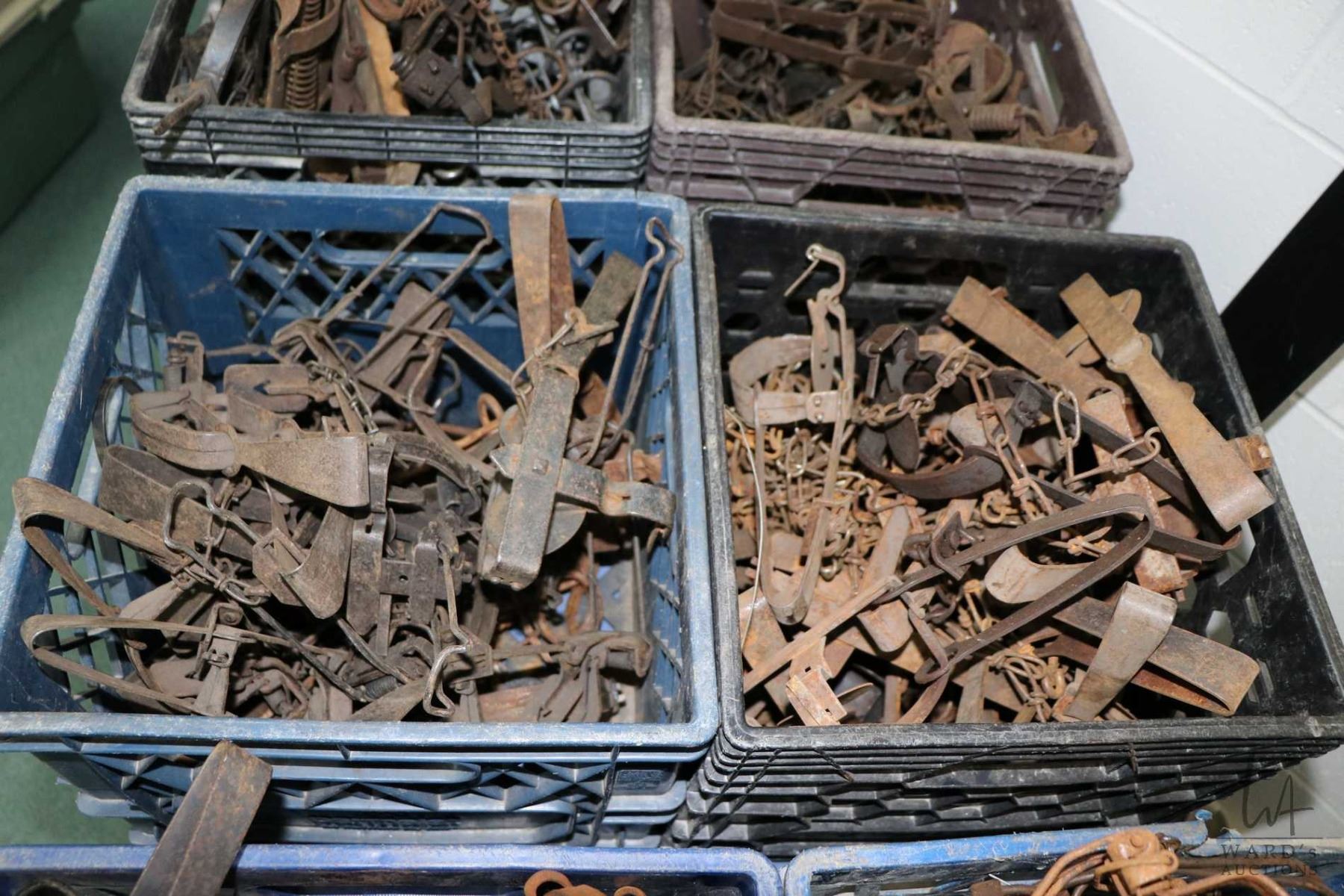 Two crates containing a selection of vintage leg hold traps, approximately 40 count.