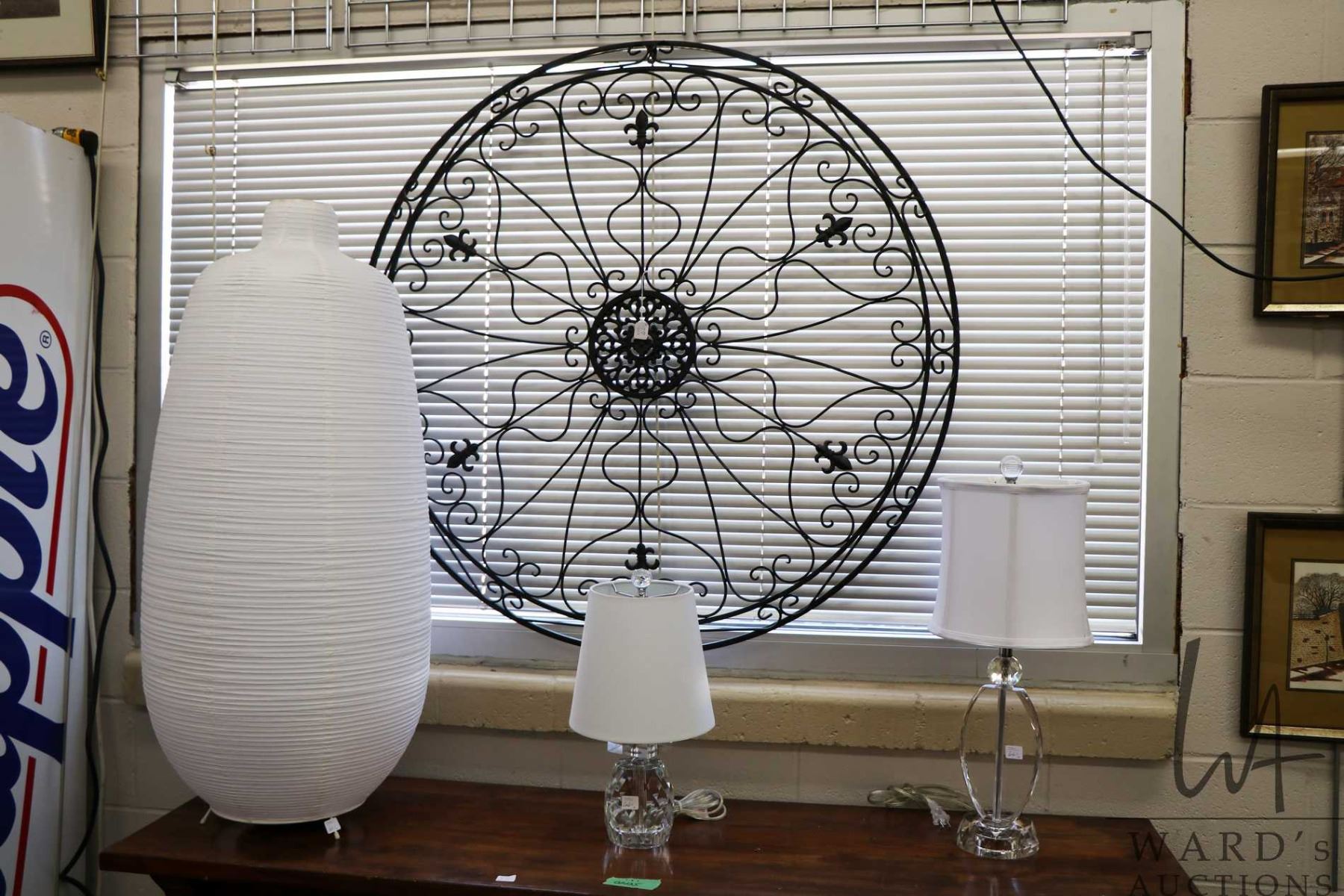 Two crystal lamps with shades and a 40" round iron wall hanging plus a tissue paper shaded floor lamp