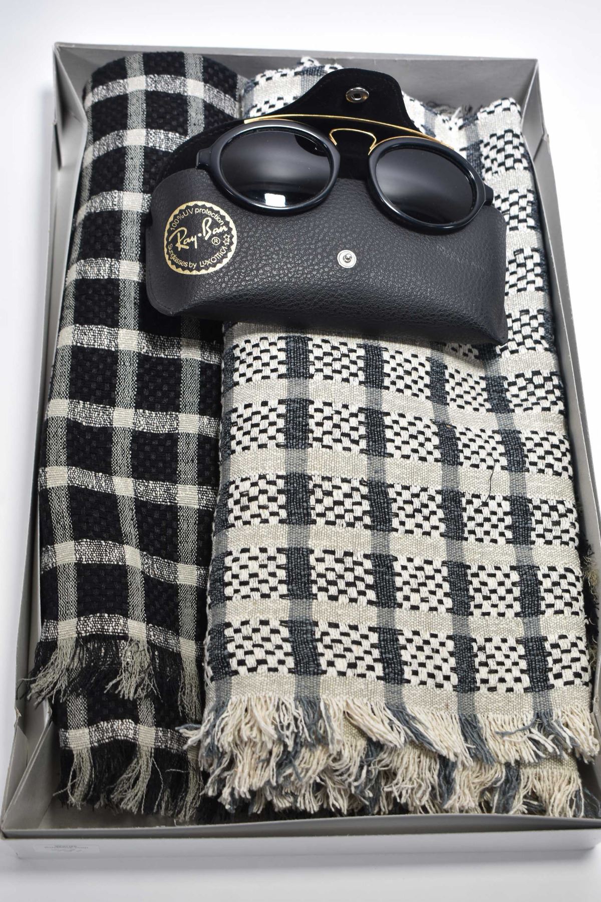 Two designer scarves by Simon Chang and a pair of vintage Ray Ban sunglasses with case