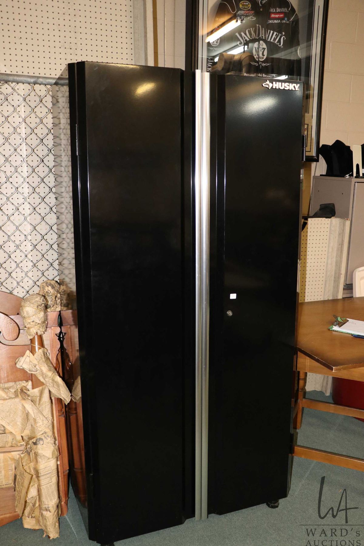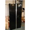 Two door black and silver garage cabinet with three adjustable shelves and one key, 73" H X 37" W X 19"D