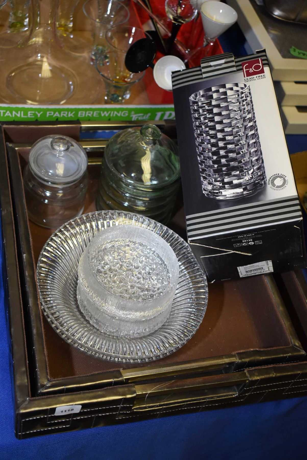 Two drinks trays, two lidded canisters and a new in box "lead free crystal" glass cylinder vase