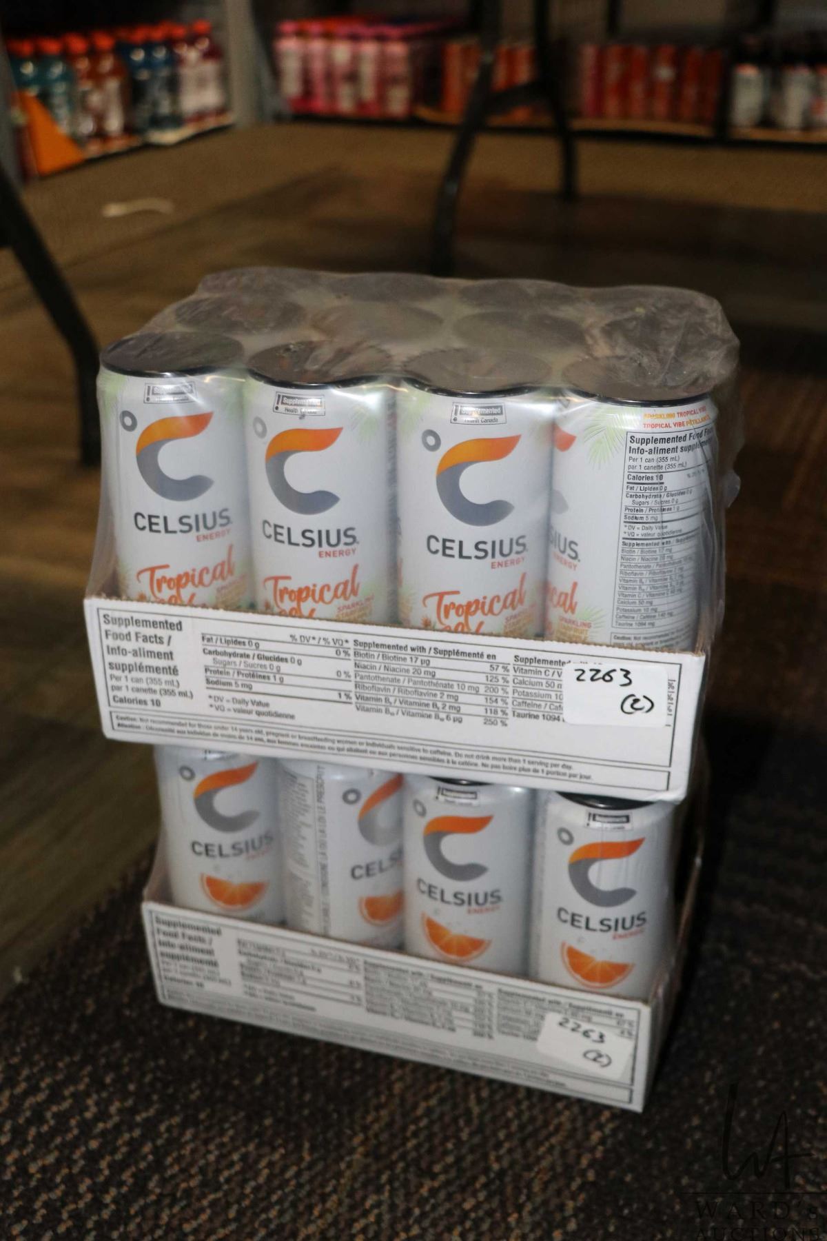 Two flats w/ 12 355ml cans each of Celsius Tropical Punch and Celsius Orange