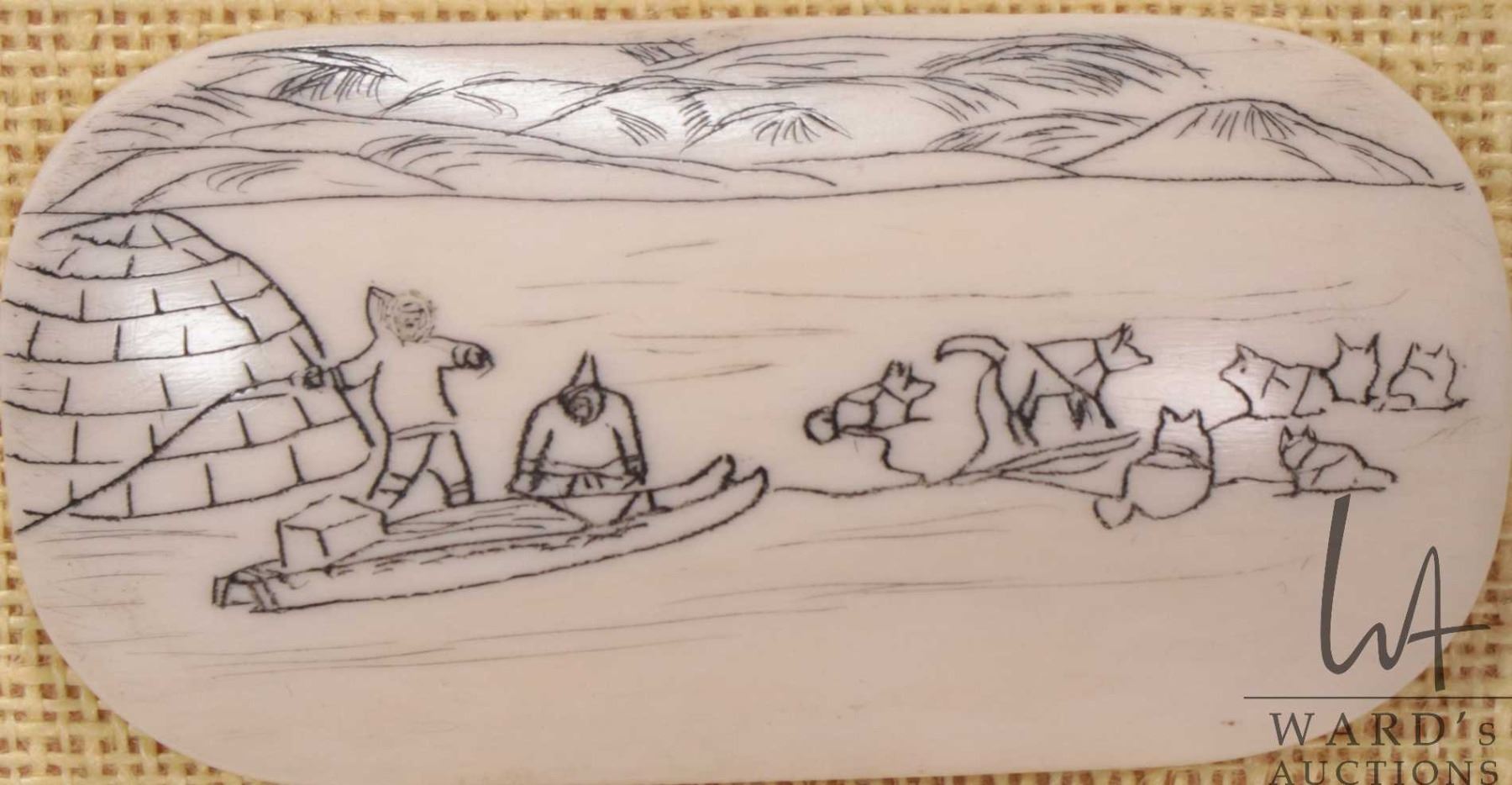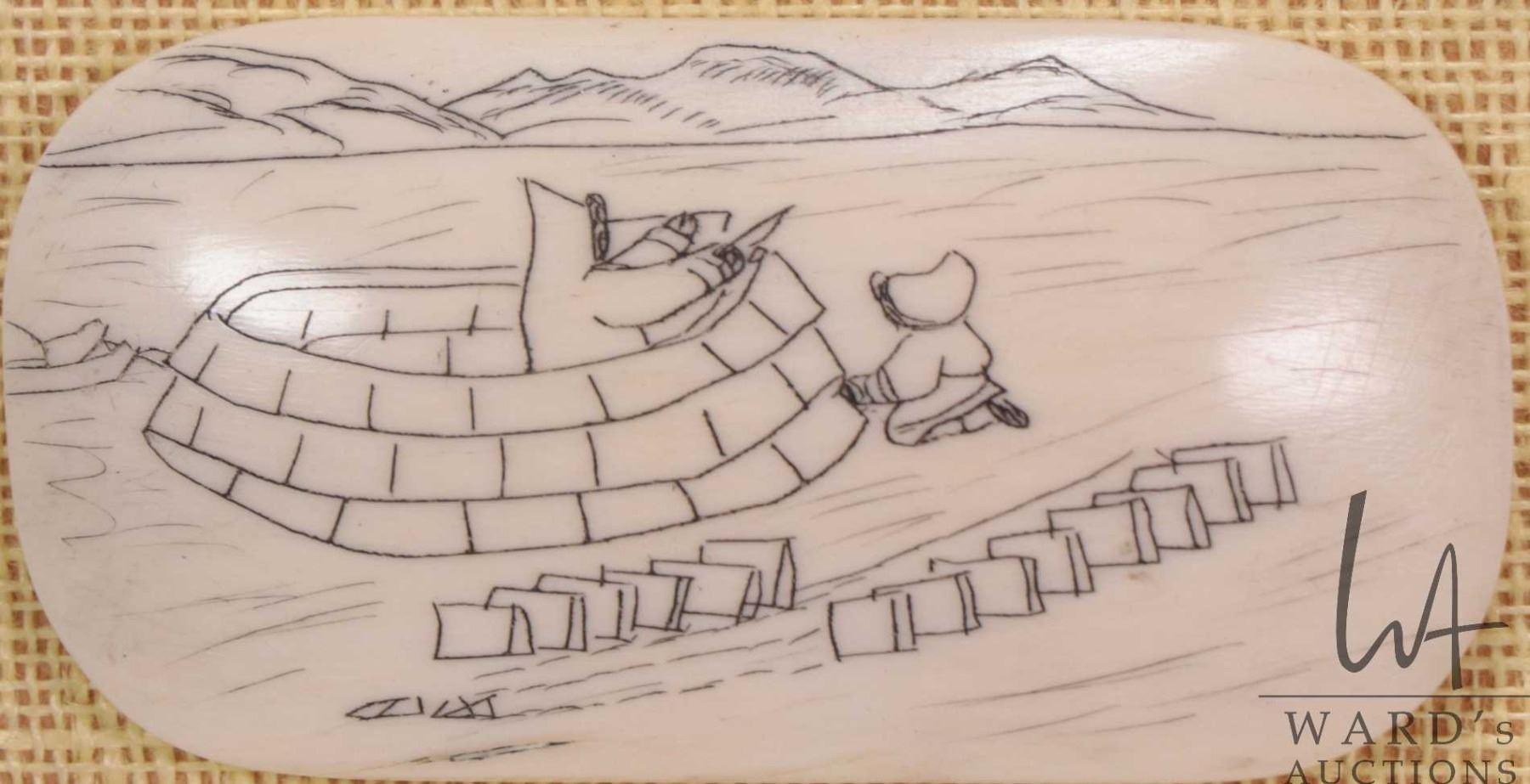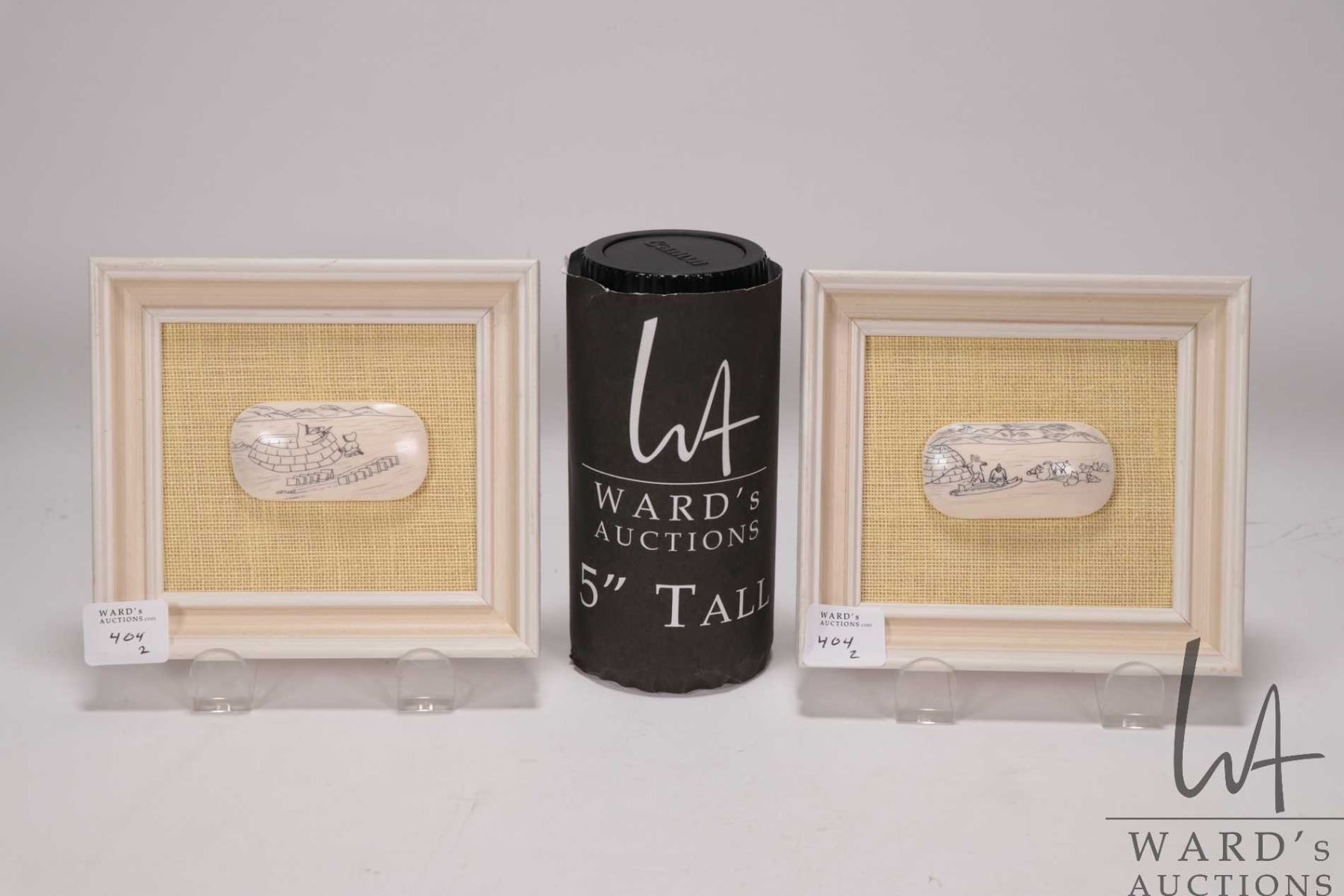 Two framed Inuit scrimshaw ivory carvings including Building An Igloo and Dog Sled, both by artist B