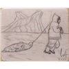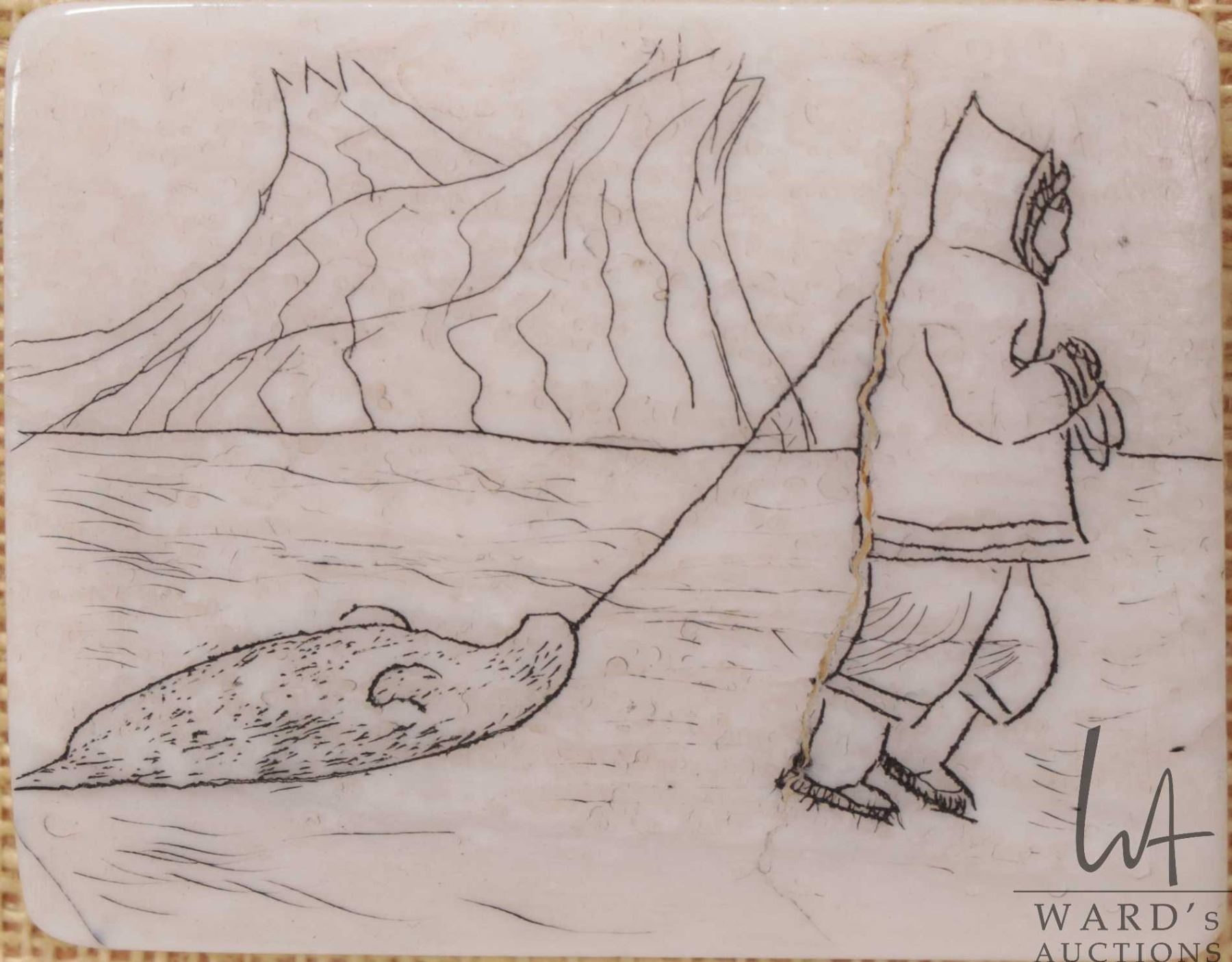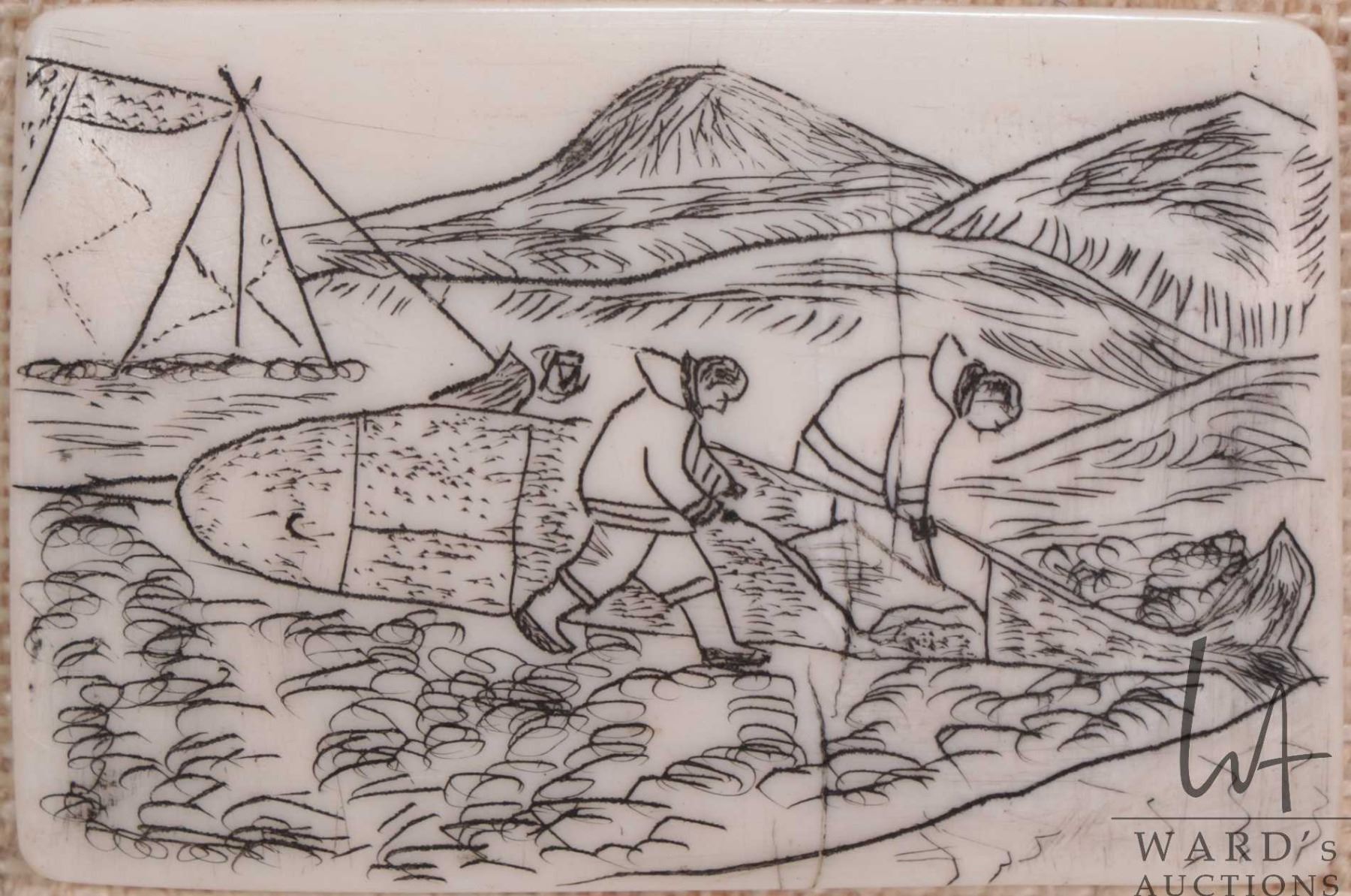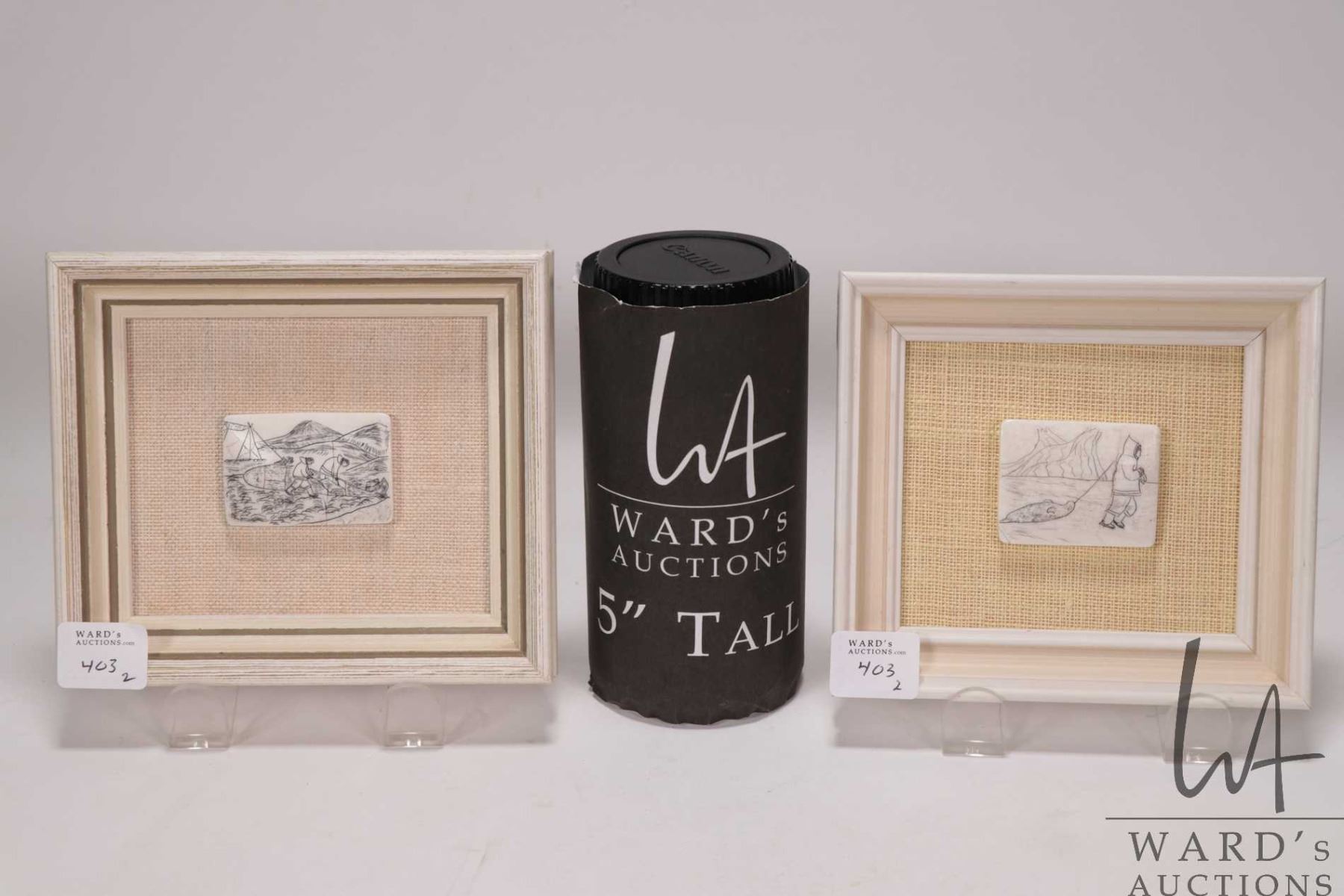 Two framed Inuit scrimshaw ivory carvings including Pulling the seal and Camp, both by artist B. Kat
