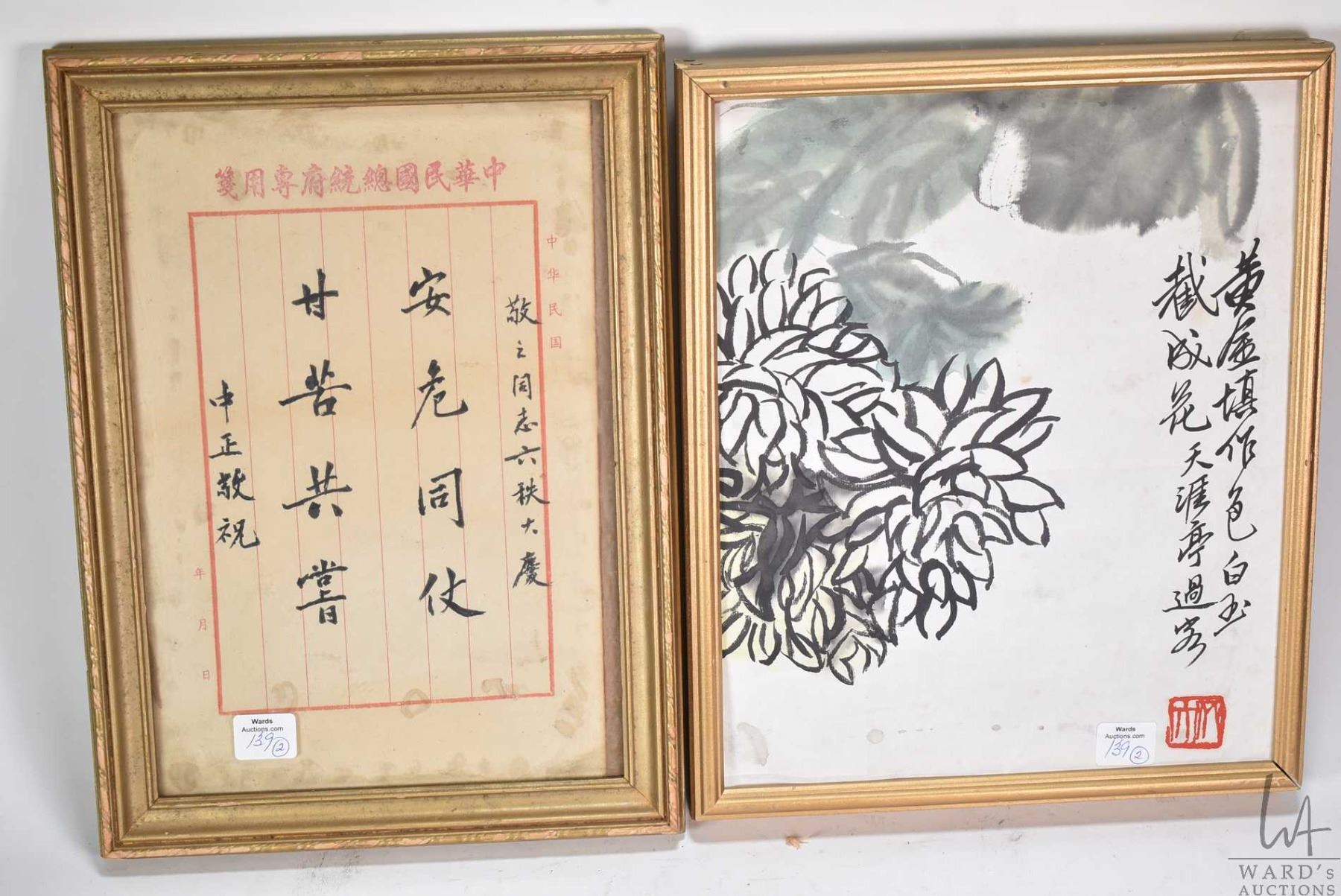 Two framed Oriental artworks including ink on paper calligraphy, purportedly early 20th century 11" X 7 1/2" and an ink and watercolour painting, 11" X 9"