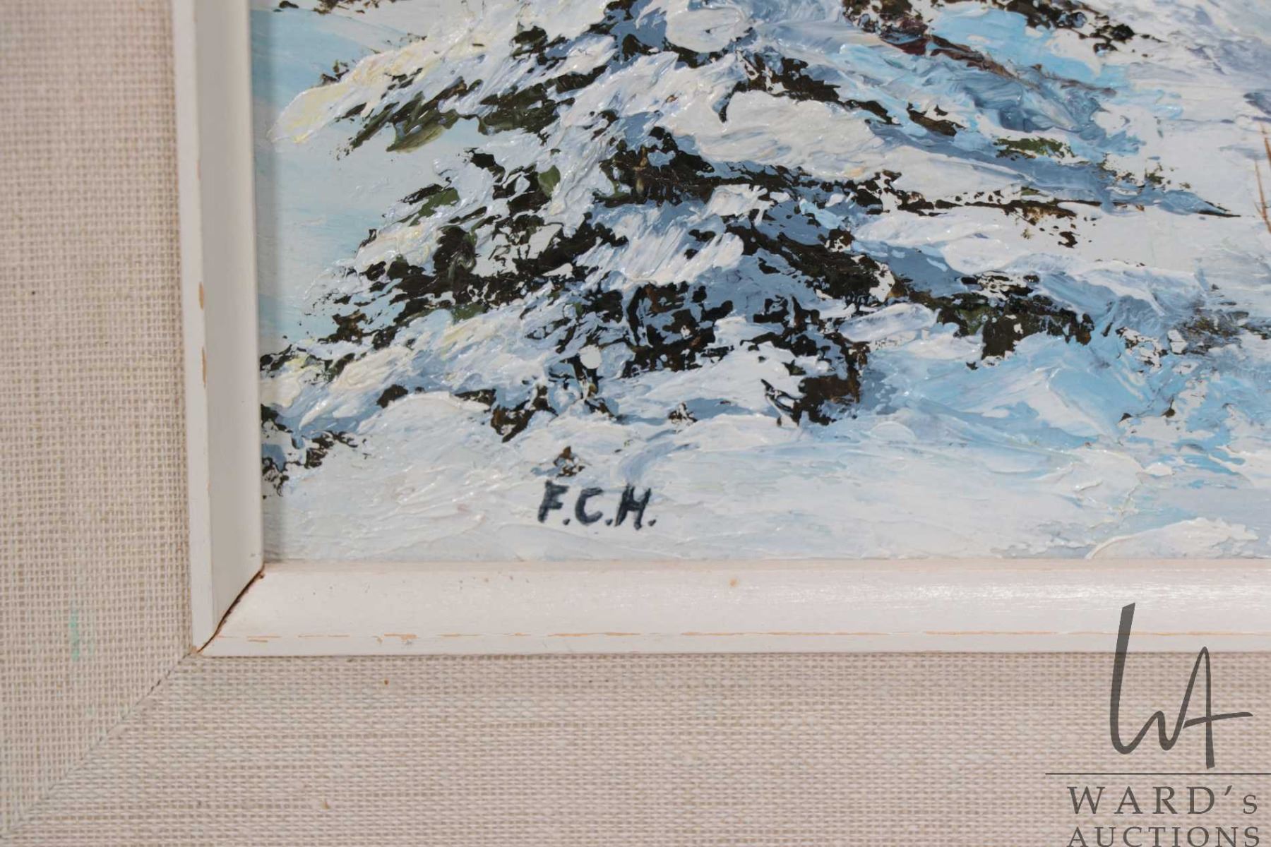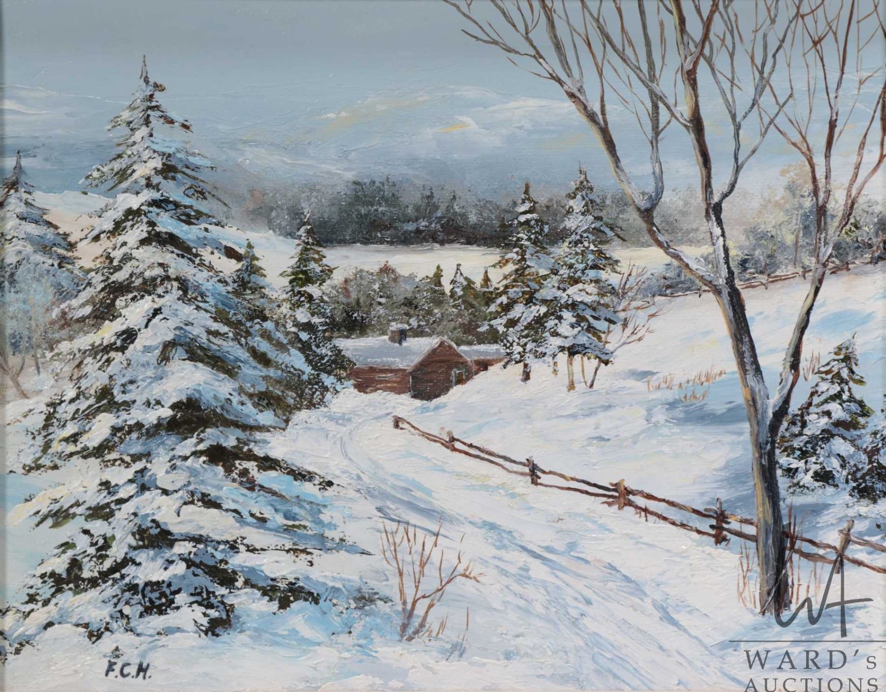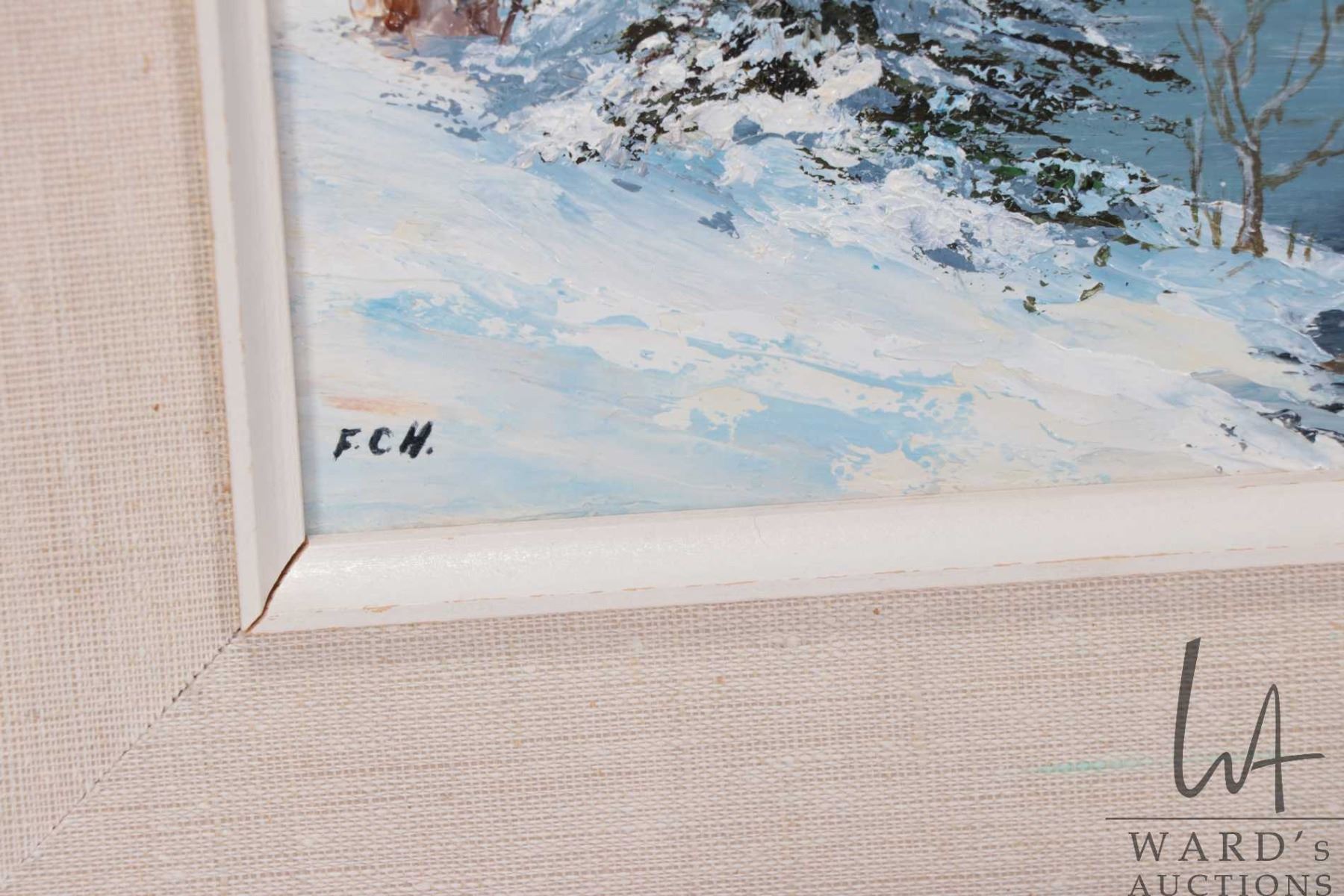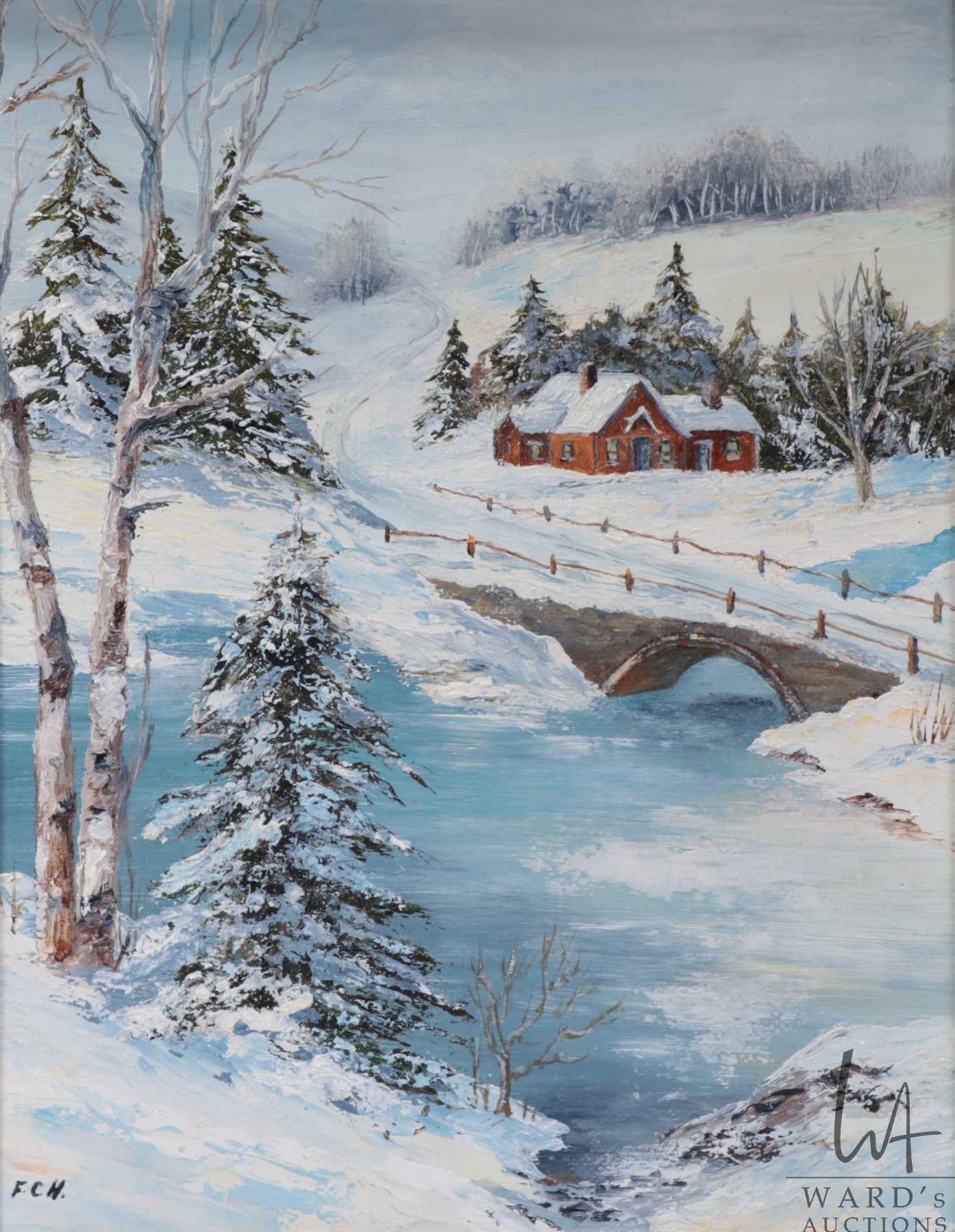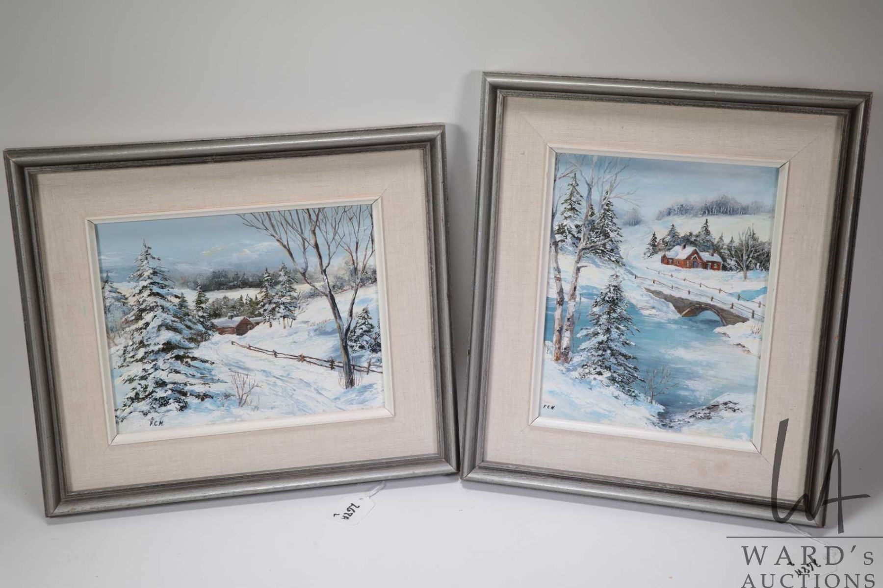 Two framed acrylic on board paintings including winter scene with bridge 9 1/2" X 8" and winter scene with fence, 8" X 9 1/2" both initialed F.C.H