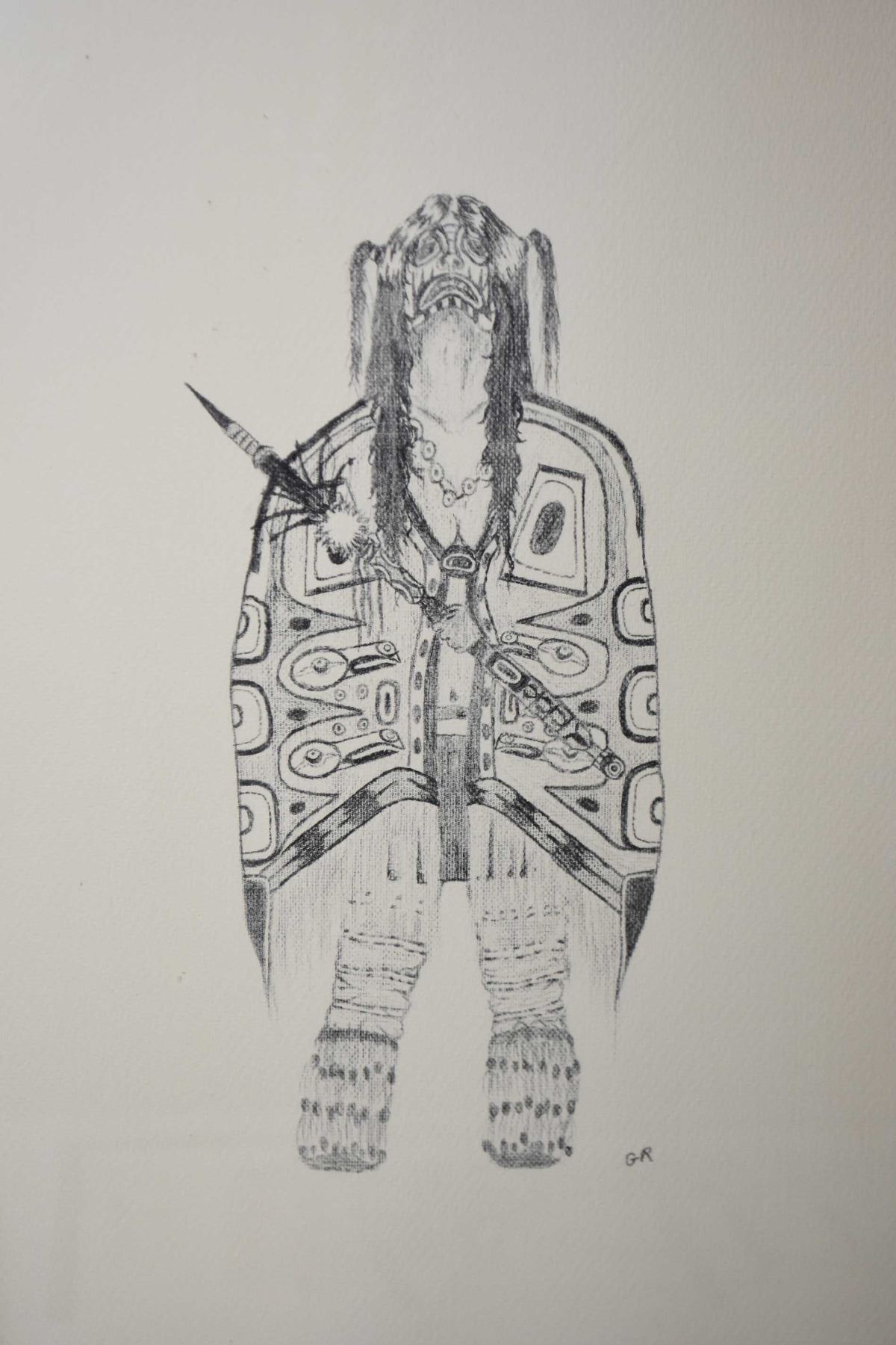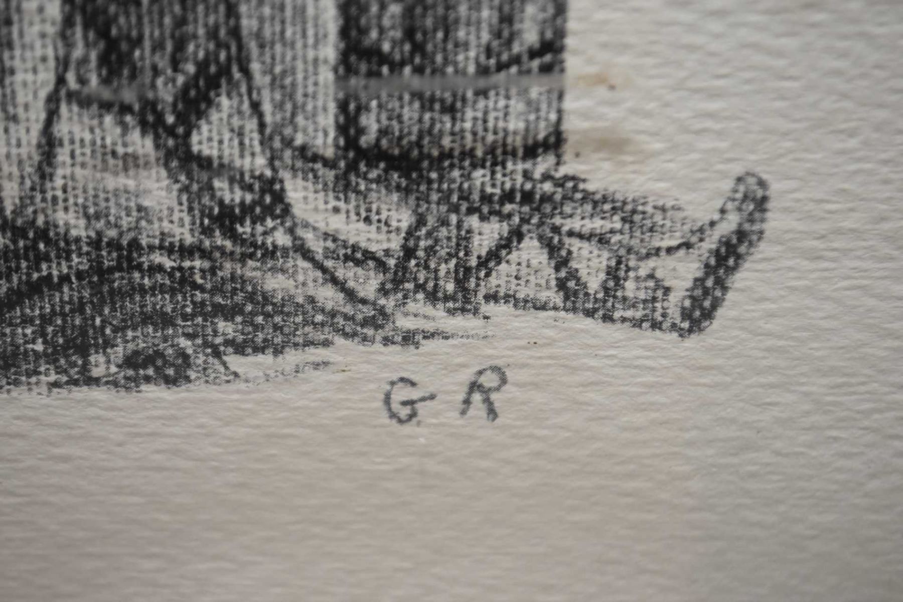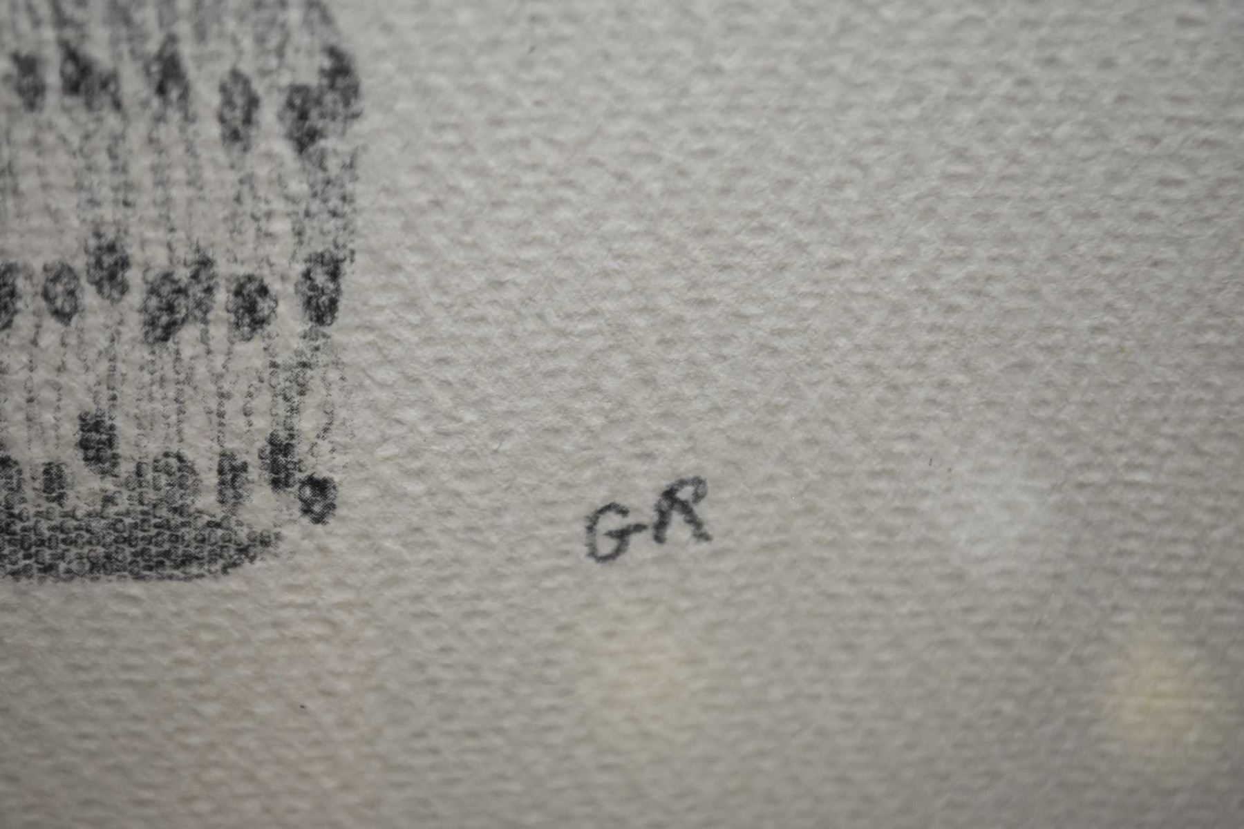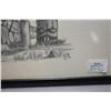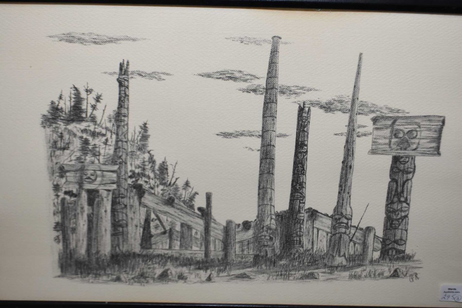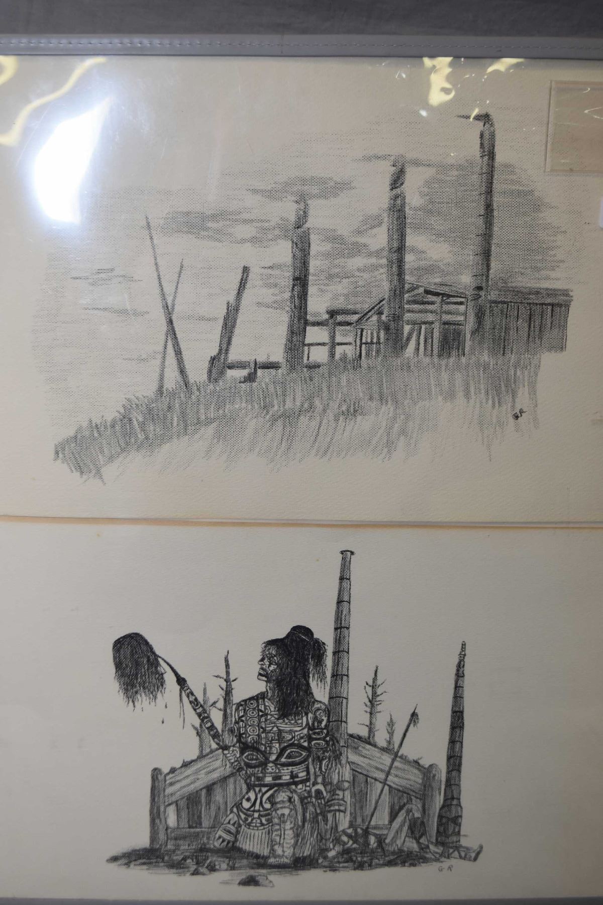 Two framed and two unframed original pencil drawings of Inuit scenes and figure, initialled by artist G.R, 12" X 20"