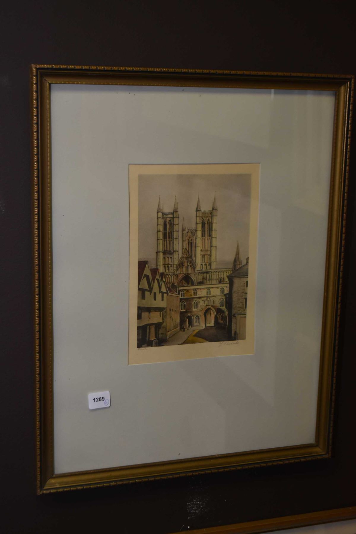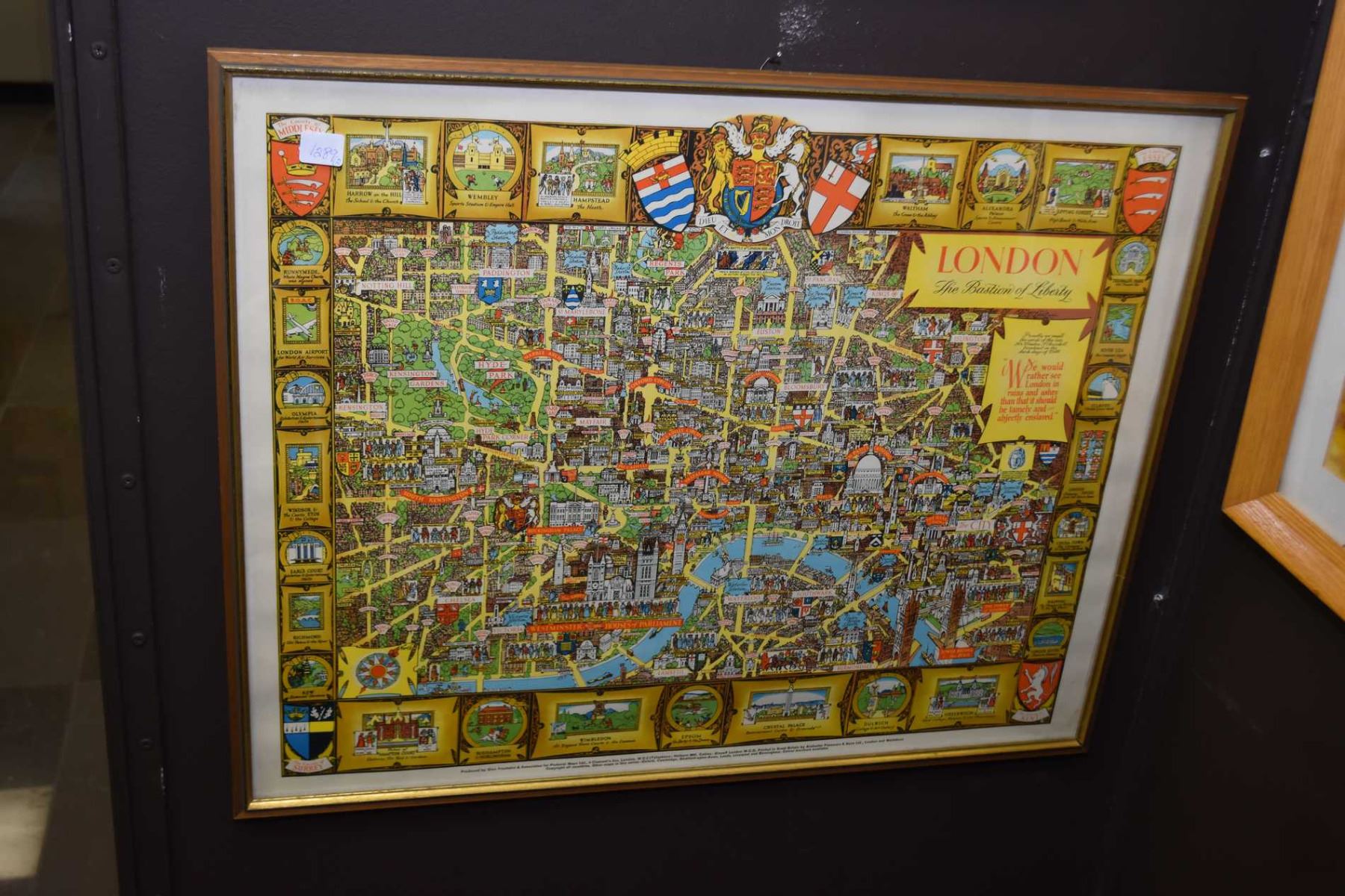 Two framed artworks including a decorative map "London, the Bastion of Liberty" and a vintage coloured etching "Lincoln" pencil signed L. Maude