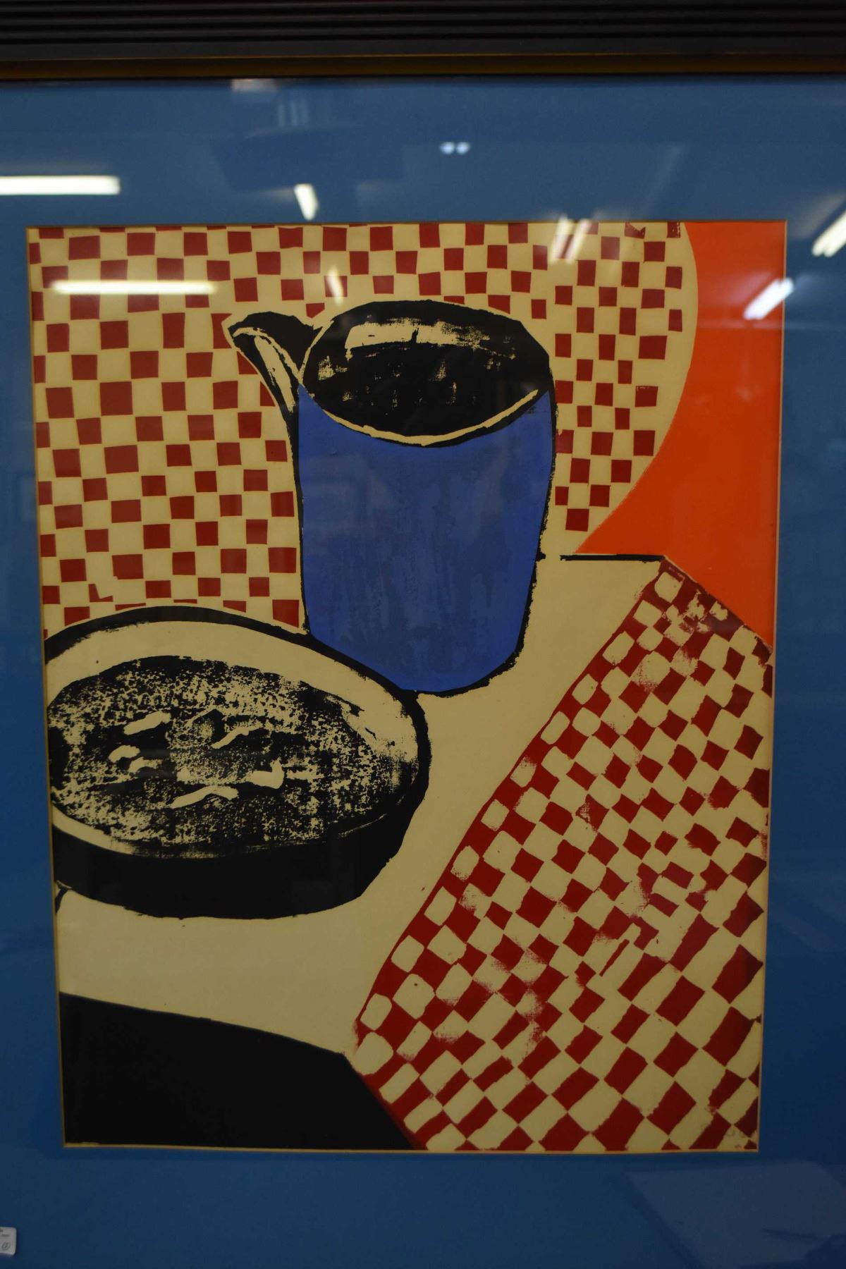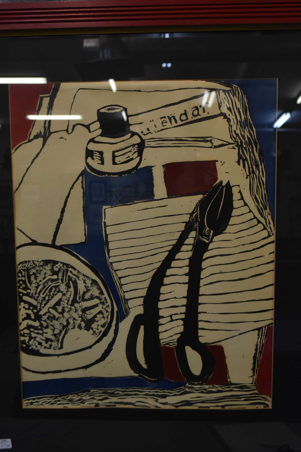 Two framed block prints including three colour kitchen graphic and a three colour desk graphic, both