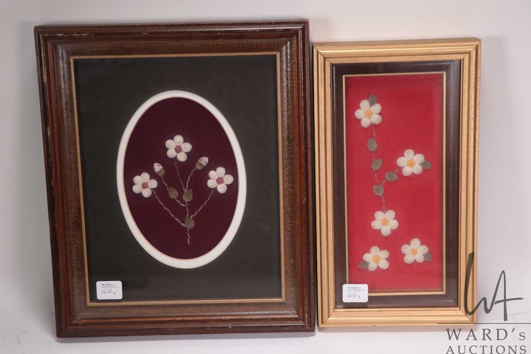 Two framed caribou tuftings including floral in oval matted frame by Cookie Creighton, Blood Reserve, Alberta, January 1985, 12" X 10" including framed and rectangular framed by Joyce Briusedhead, Blood Reserve, Alberta, May 1985, 11" X 6"