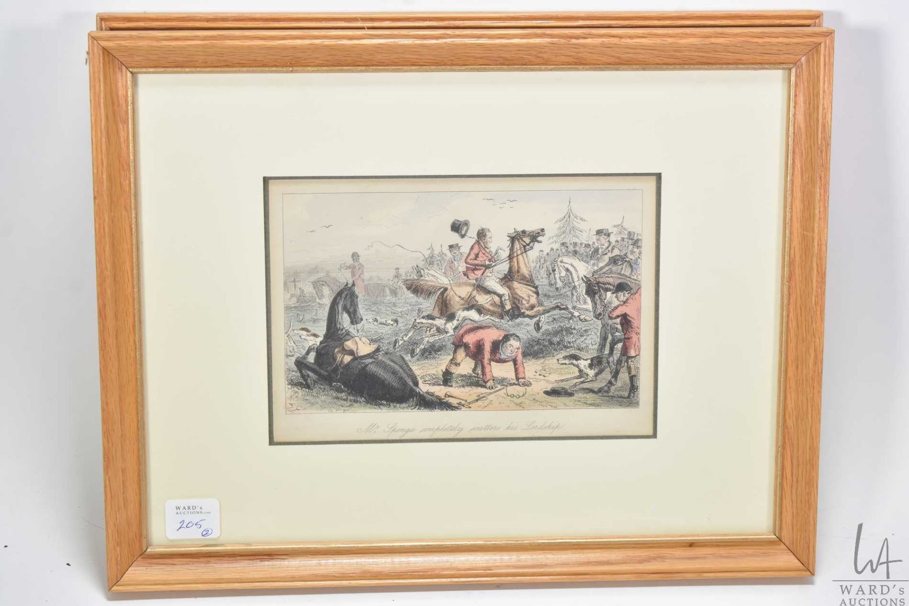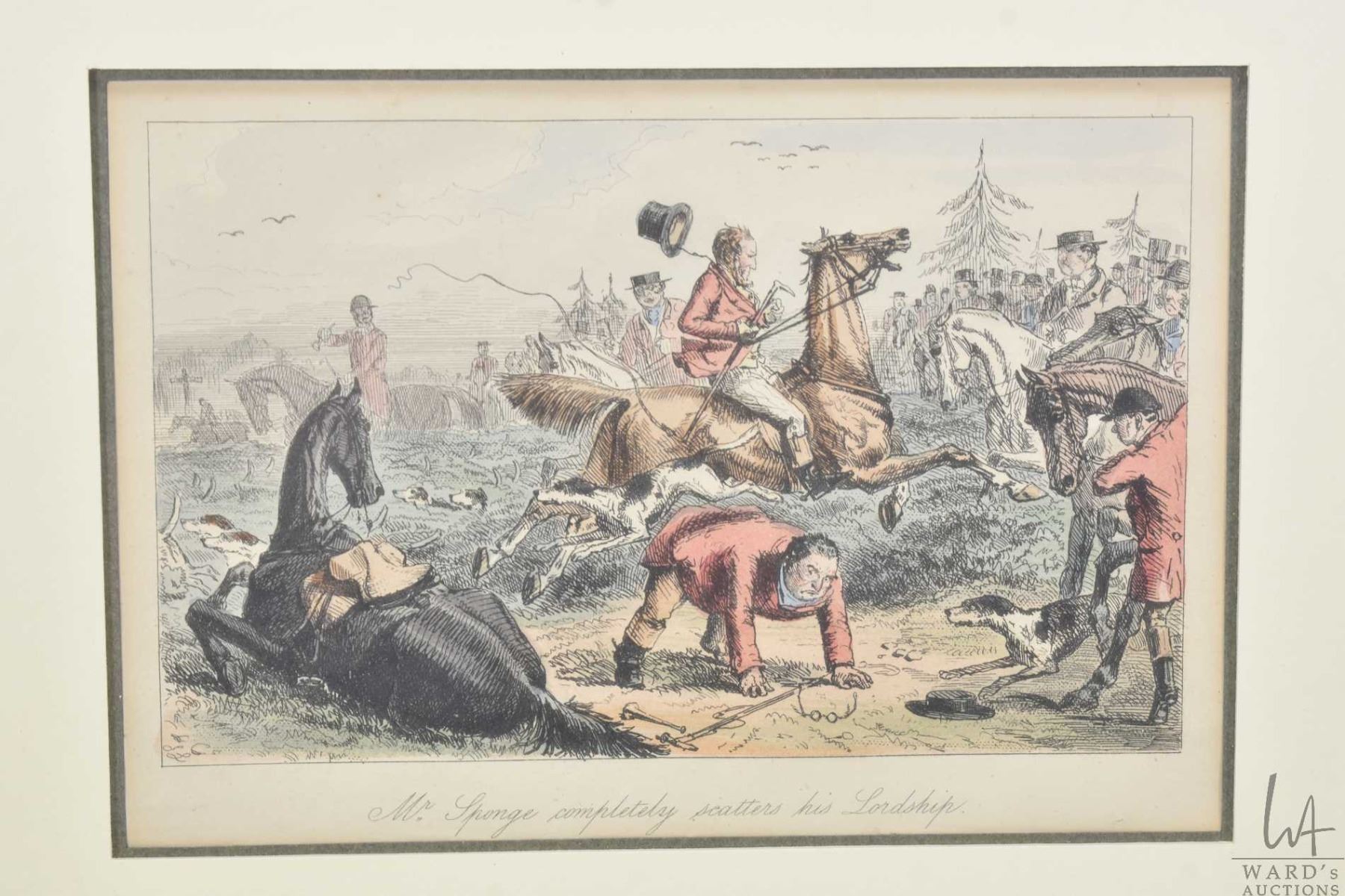 Two framed hand coloured engravings each for Mr. Sponge's Sporting Tour, publishing in 1853 including Mr. Sponge Completely Scatters his Lordship etc.