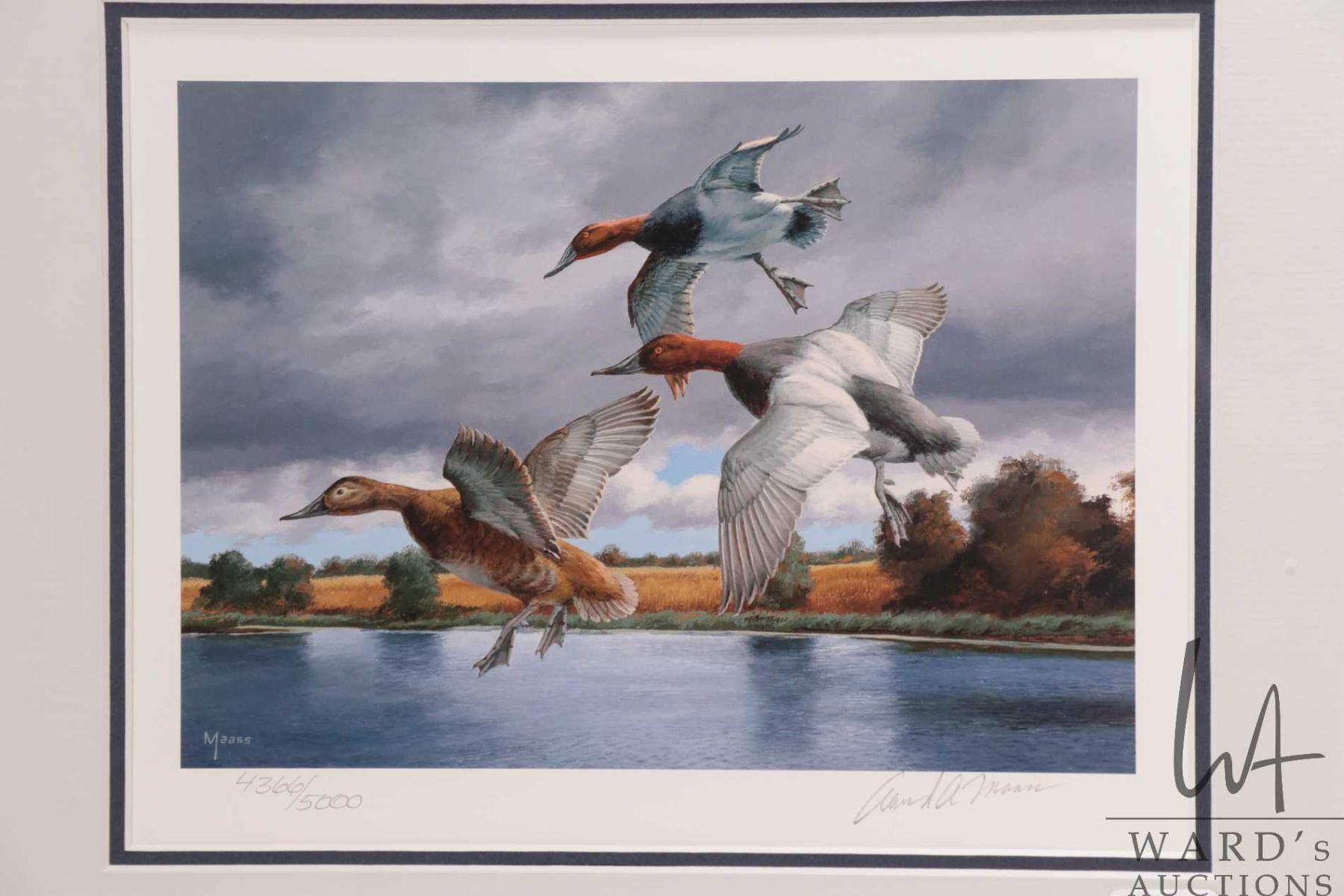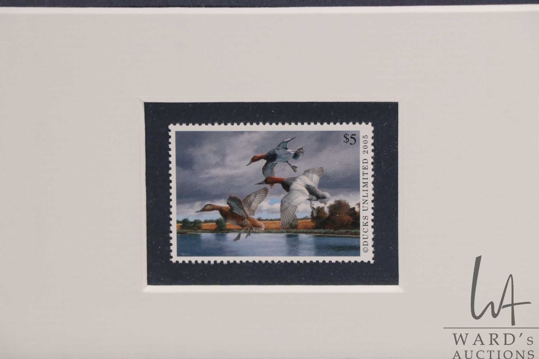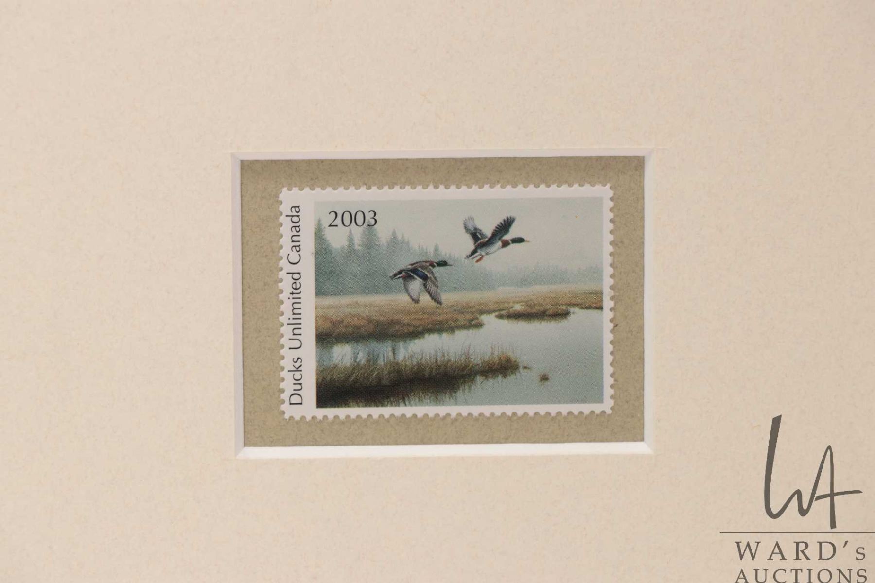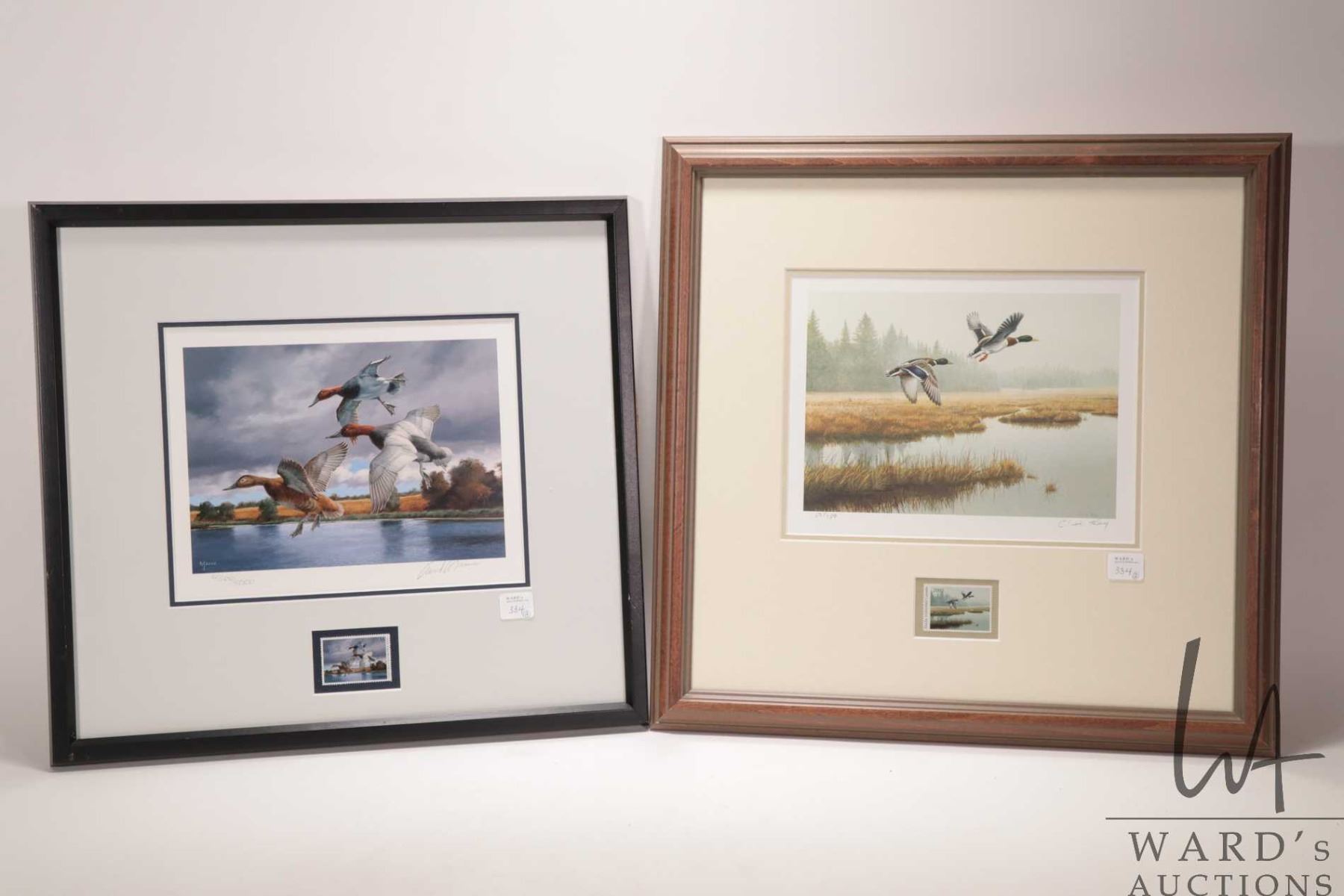 Two framed limited edition Ducks Unlimited postage stamp and prints including 2005 David A.Maass 4366/ 500, 16" X 17" framed dimensions and 2003 Clive Kay 50/750, 18" X 18" framed dimensions