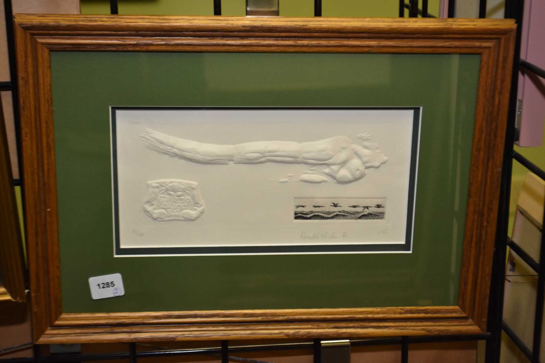 Two framed limited edition prints including Willie Wong block print dated 83, 88/1000 and an embossed Galiano Island, B.C by Ronaldo Norden 31/100