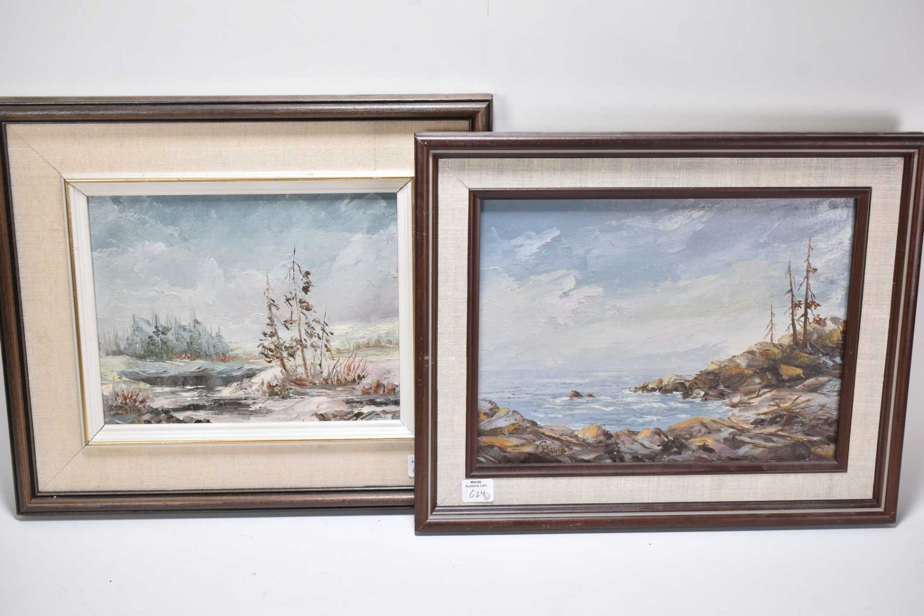 Two framed oil on board paintings including a rocky shoreline 9" X 12" and a winterscape 7" X 10" both signed Elaine