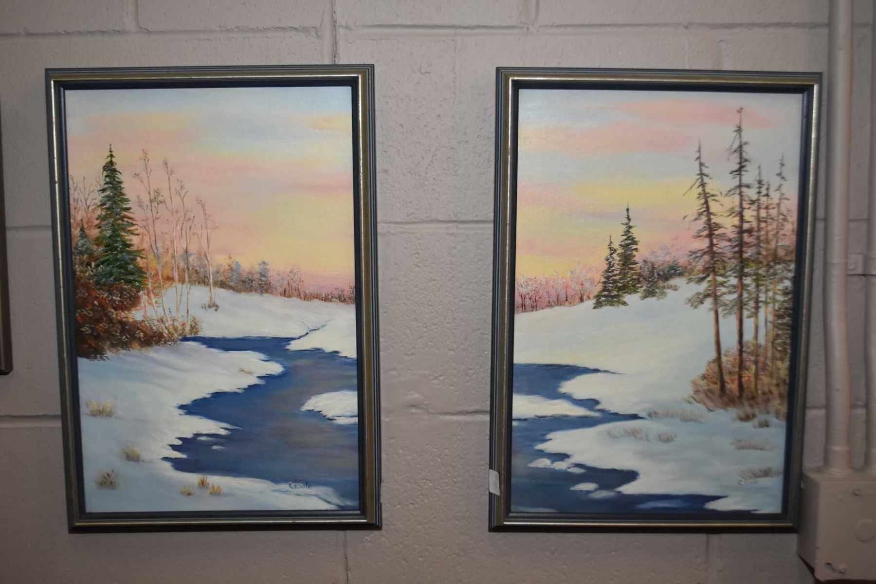 Two framed oil on board winter river scene canvass to make one larger picture, signed by artist Sole, each measuring 18" X 12"