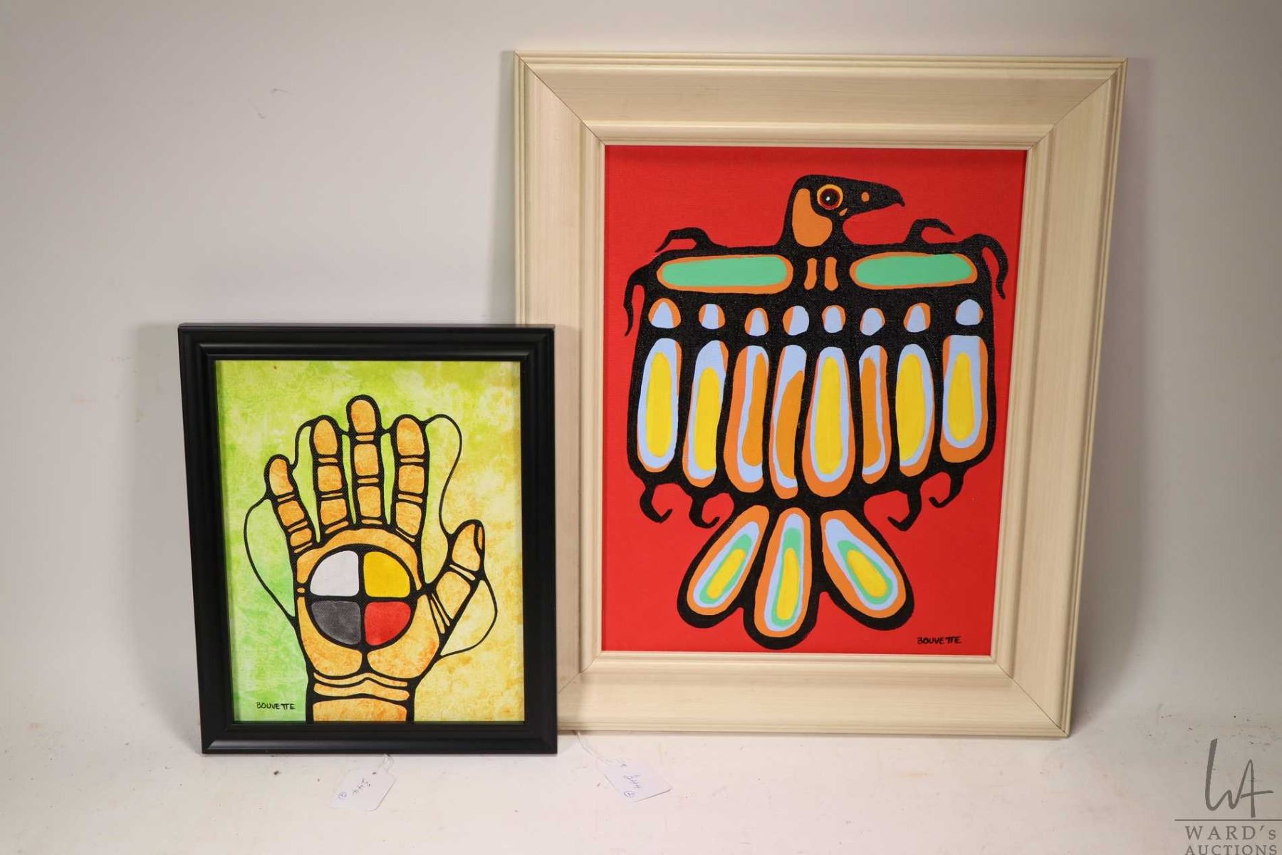 Two framed original acrylic on board paintings largest titled on verso "Lk. Superior Messenger" and signed by artist Bouvette 14" X 11" and an untitled 10" X 8" signed ( Ayla) Bouvette