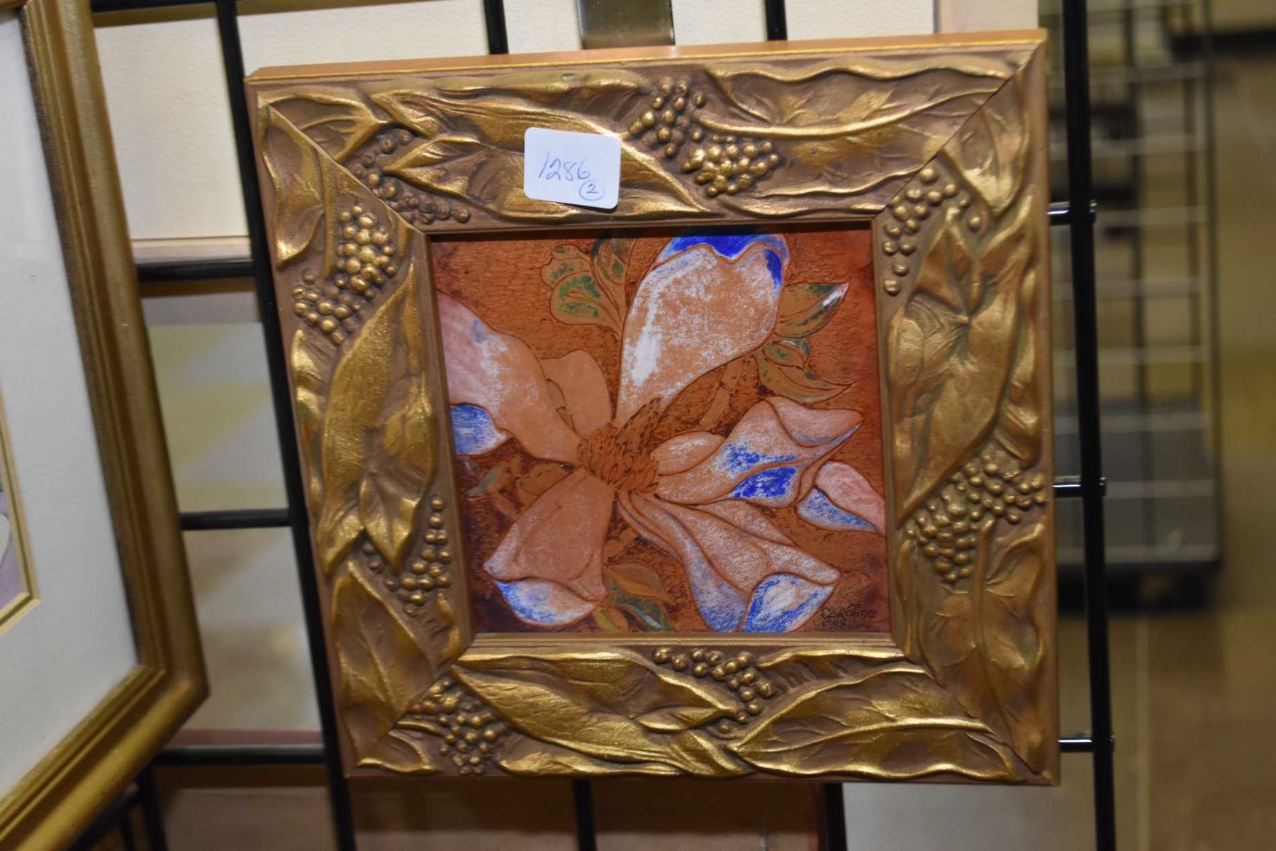 Two framed original artworks including a painted and tooled leather floral signed Caroline 1985, 5" X 5" and a watercolour of a mountain river signed by artist Bernie '96, 4" X 6"