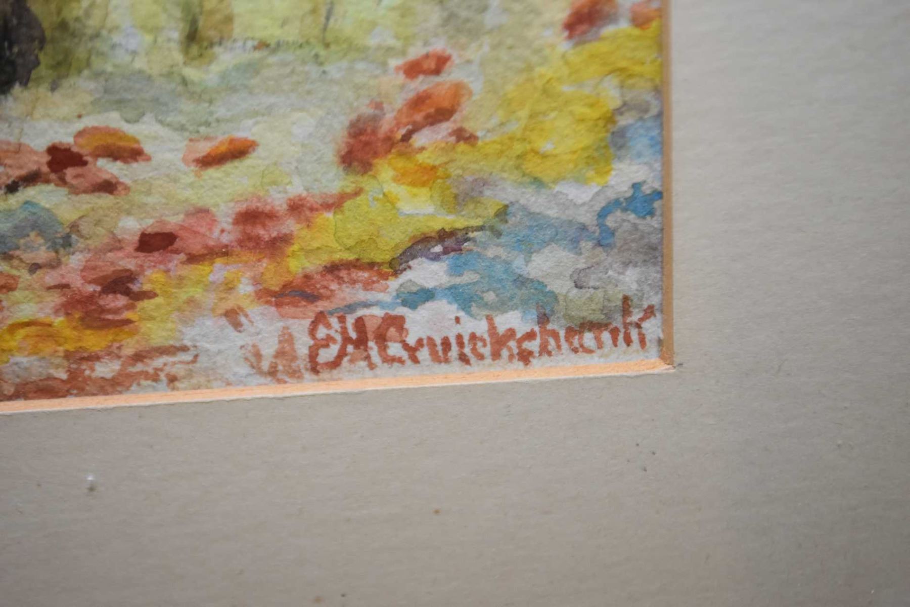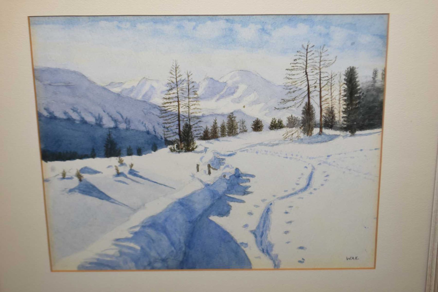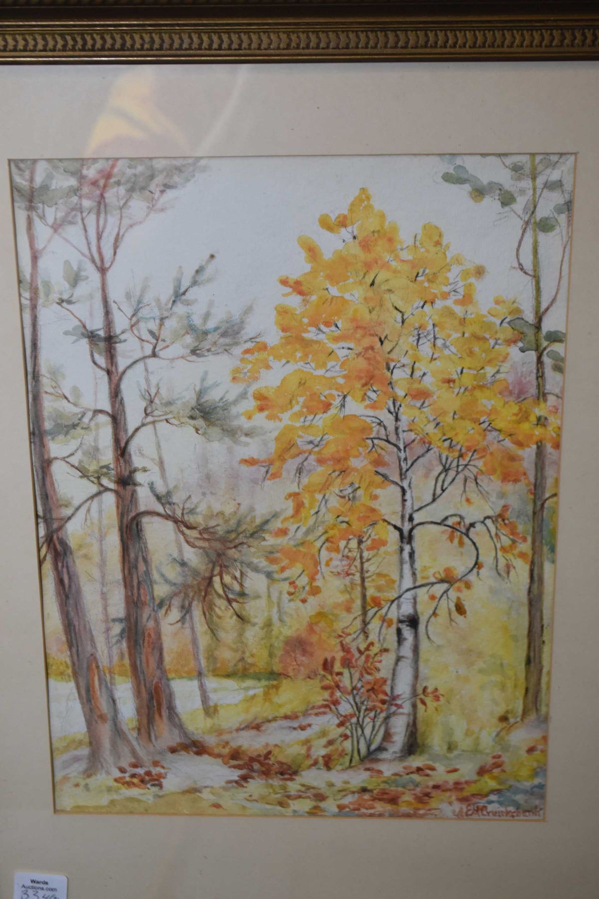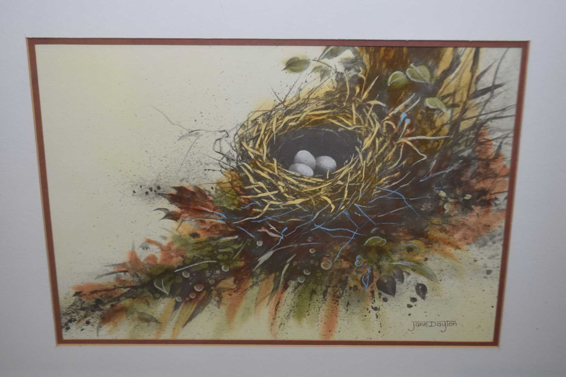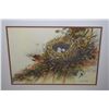 Two framed original artworks including a snowy patch, initialled by artist W.A.K, fall forest signed by artist, plus and a watercolour on printed graphic bird's nest by Jane Dayton