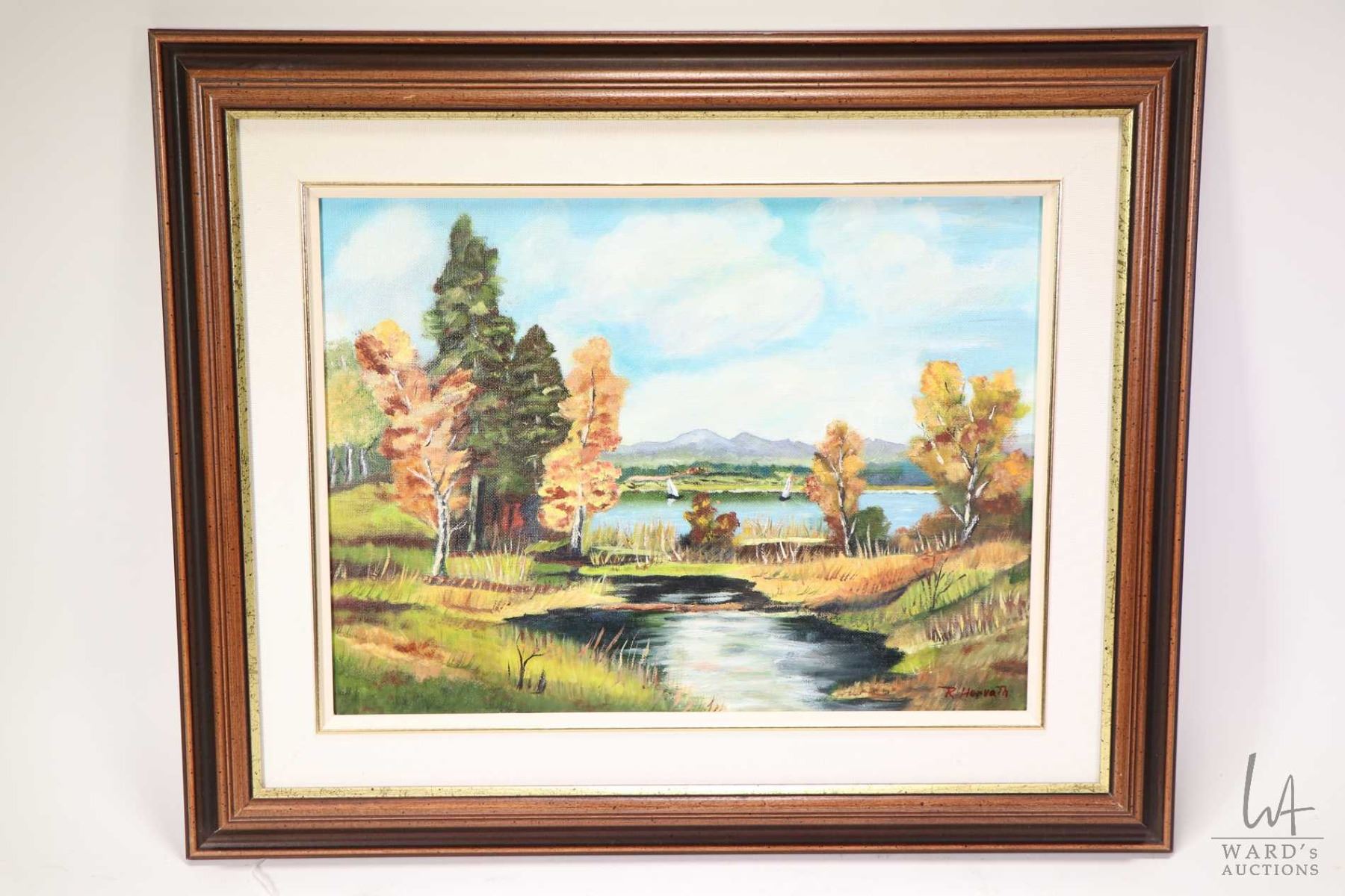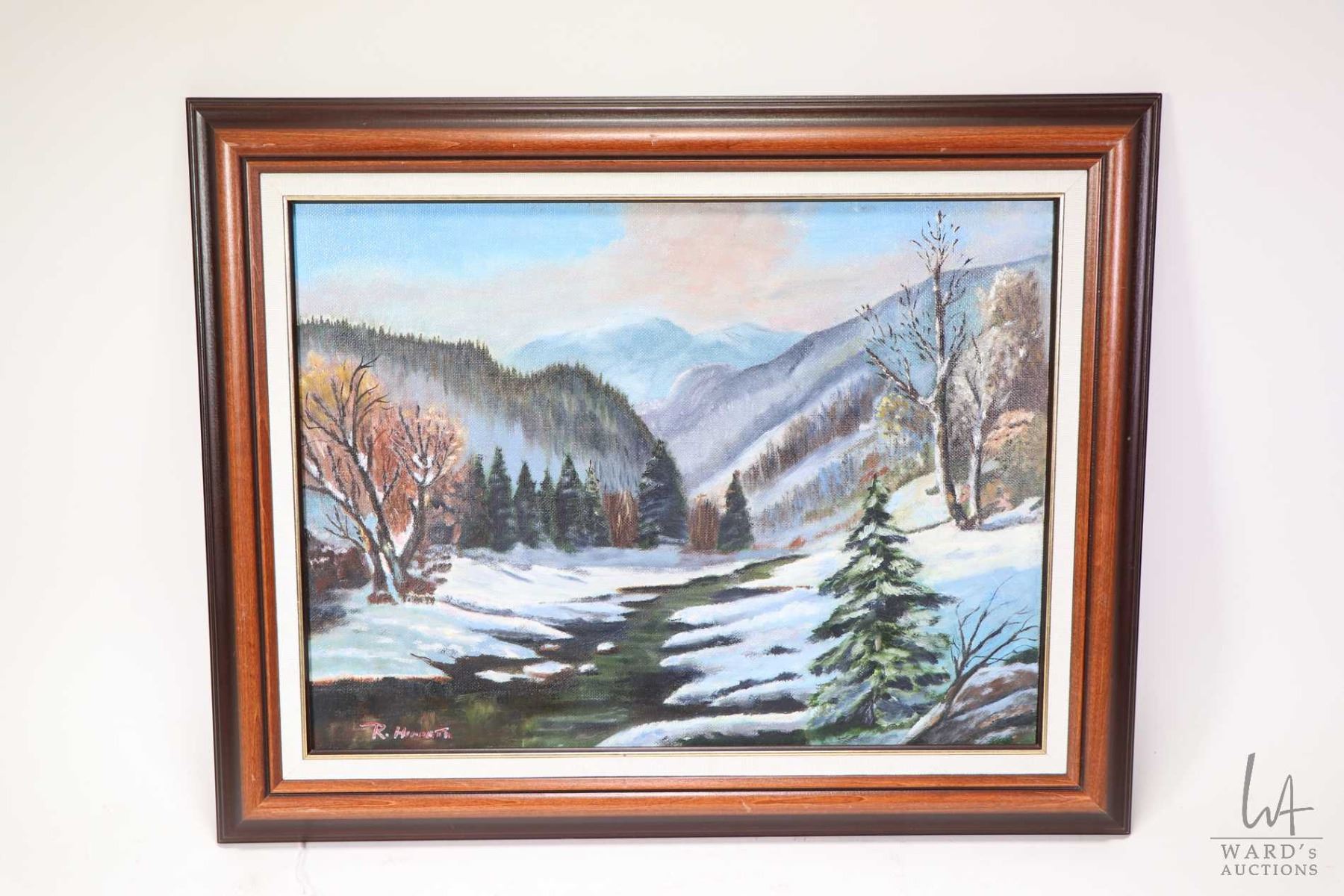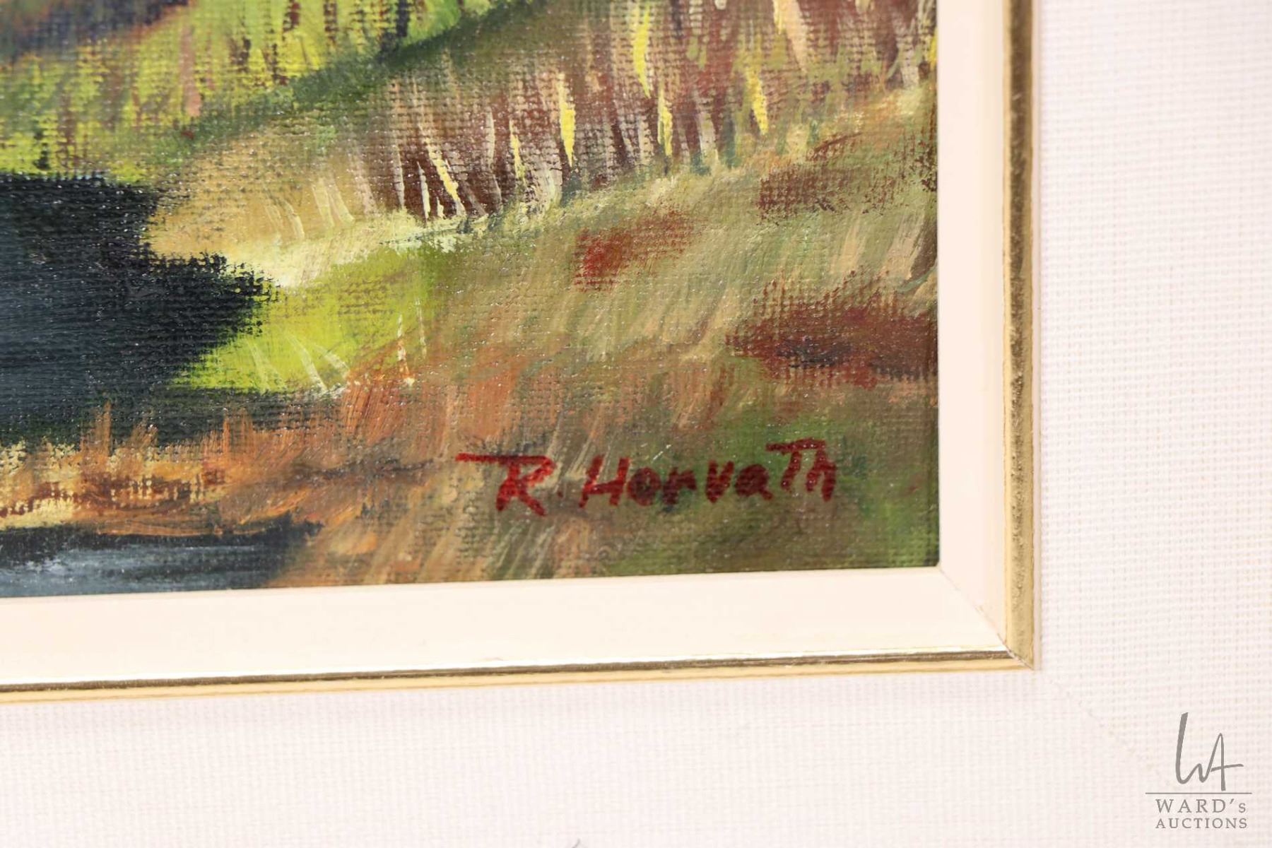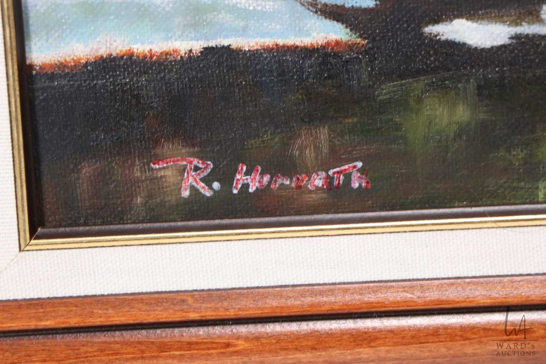Two framed original oil on board paintings including a winter mountains and a fall lake scene, both 11 3/4" X 15 1/2" and both signed by artist R. Horvath