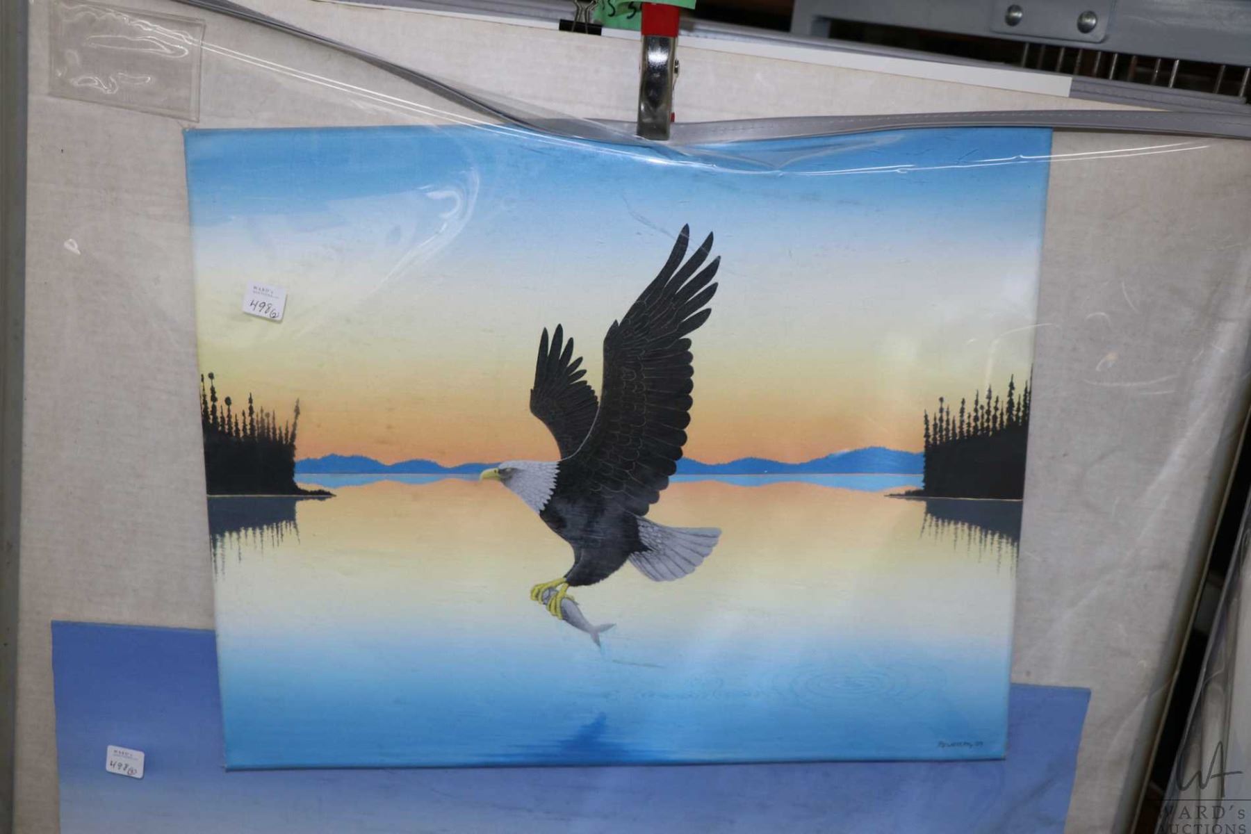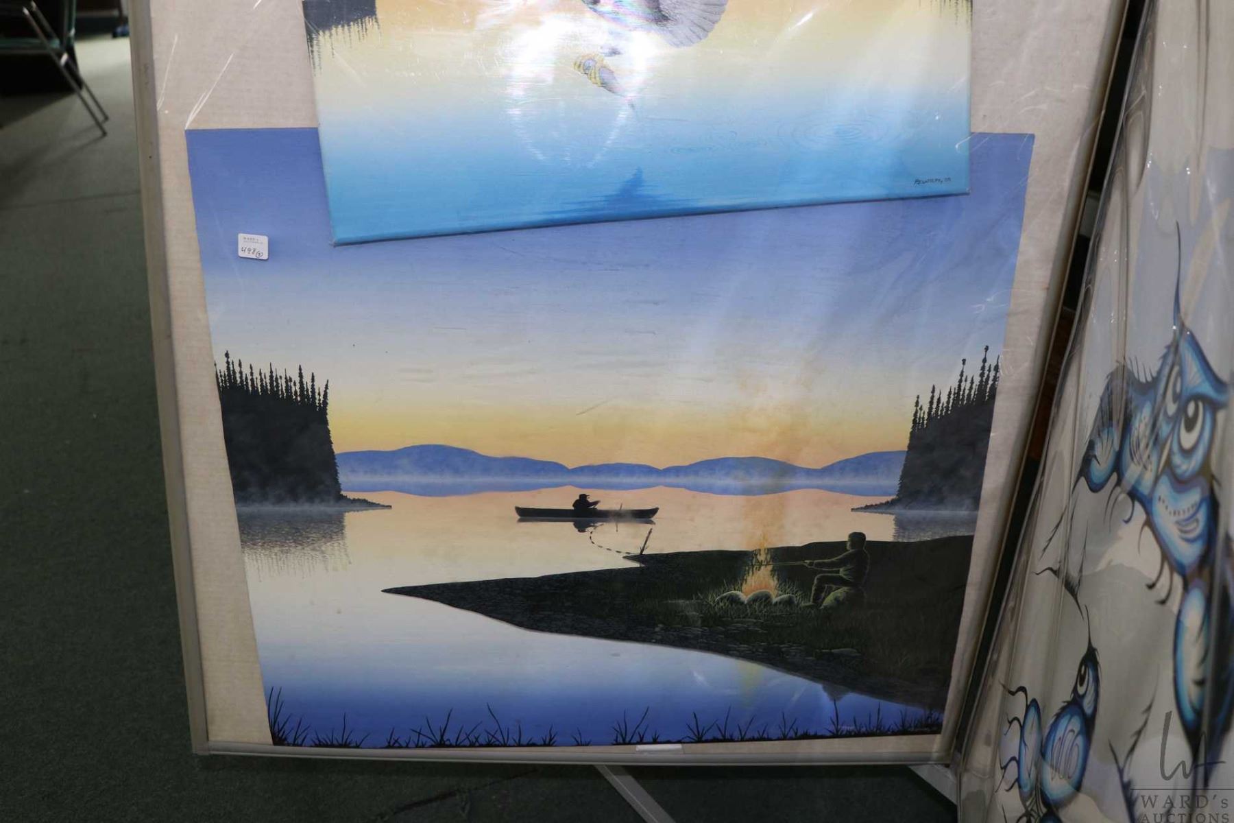 Two framed original paintings by Peter John Lafferty including stretcher framed acrylic on canvas titled on verso "Lake Hunters" 16" X 20" and unframed acrylic on board painting titled on verso "Fishing Net" 24" X 27", both painting signed by artist