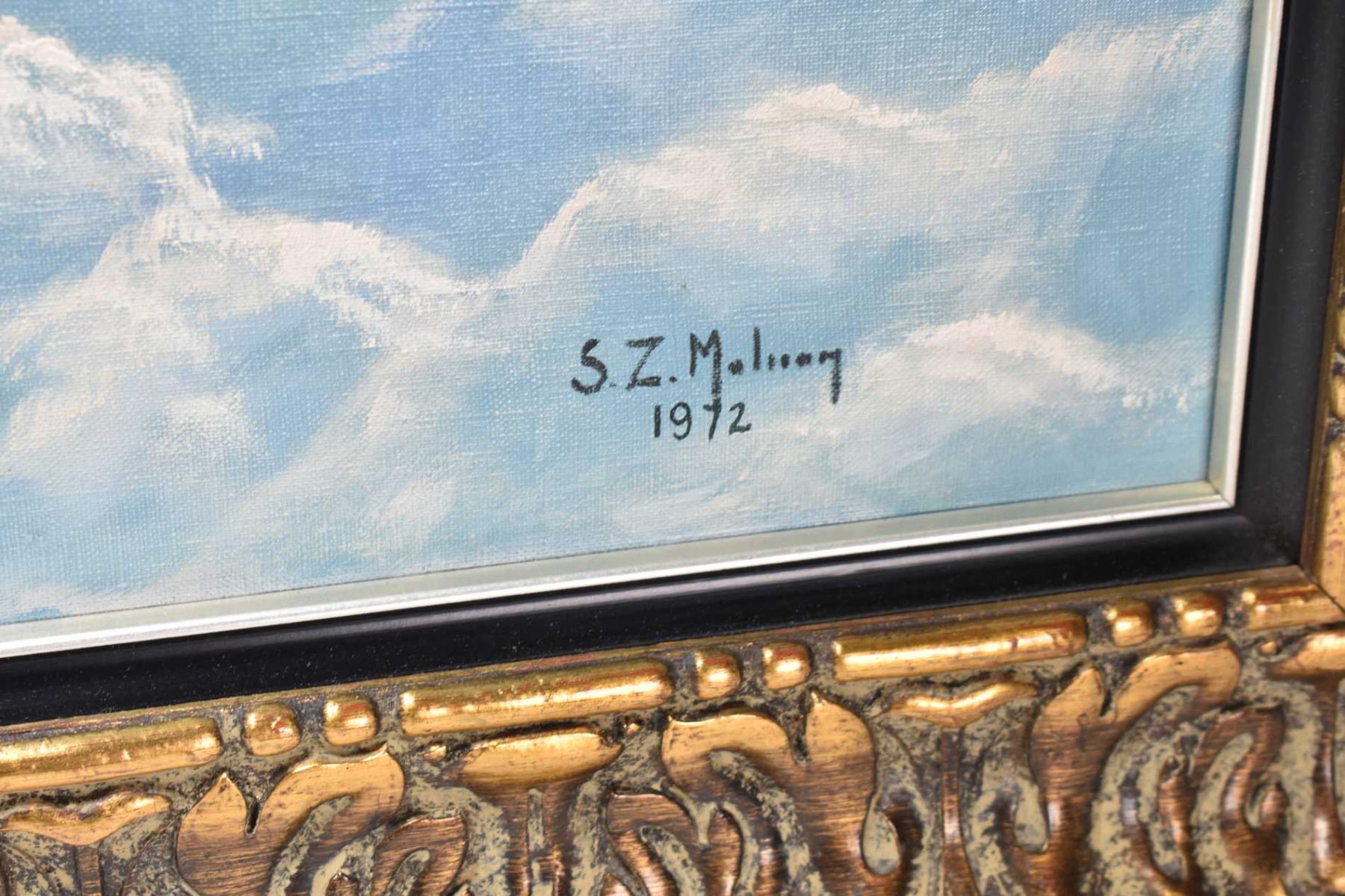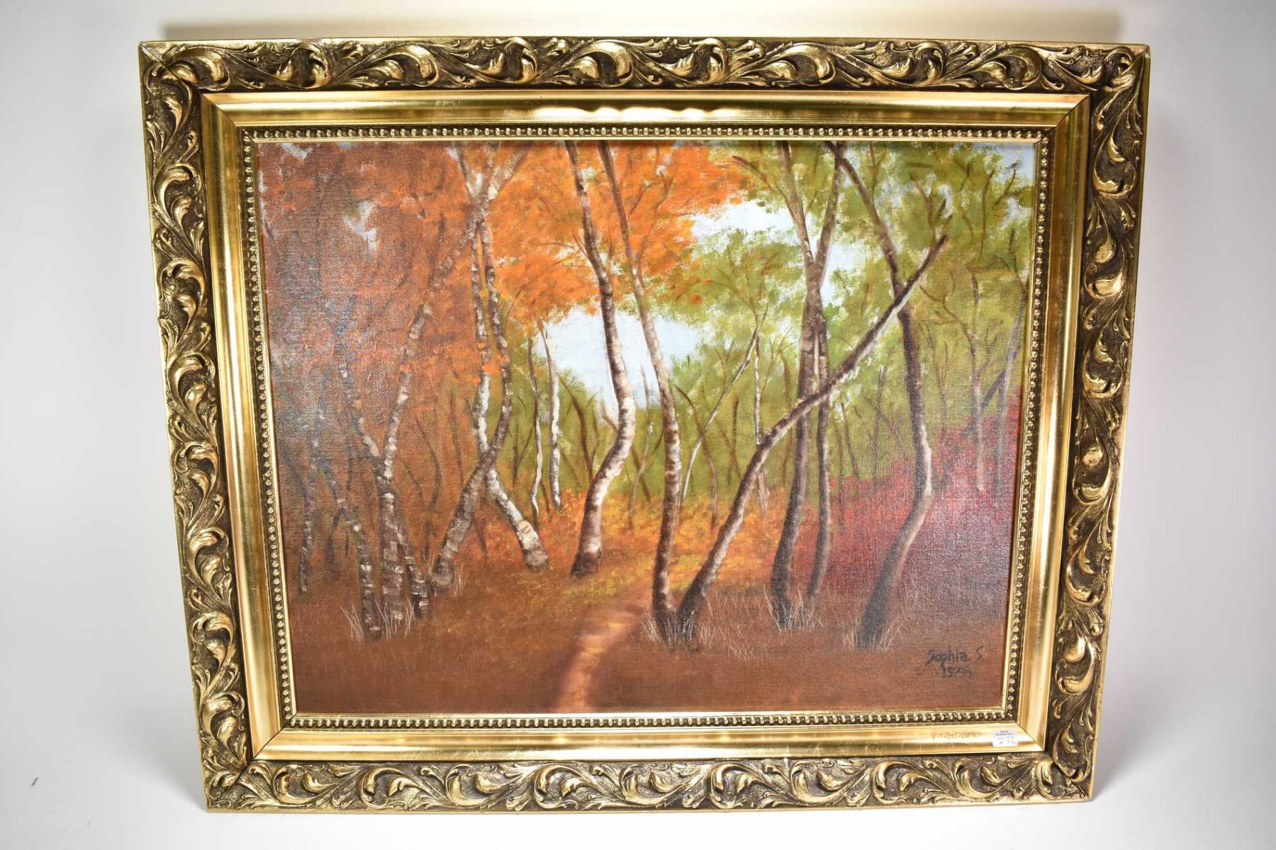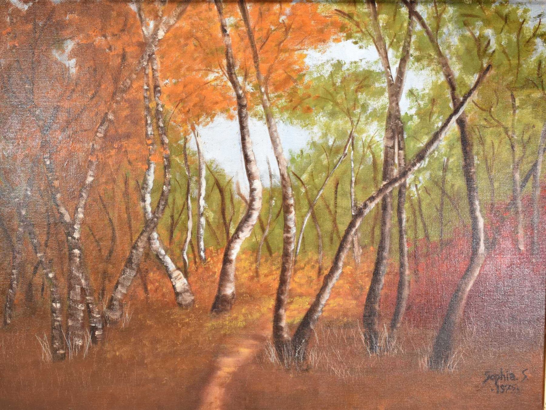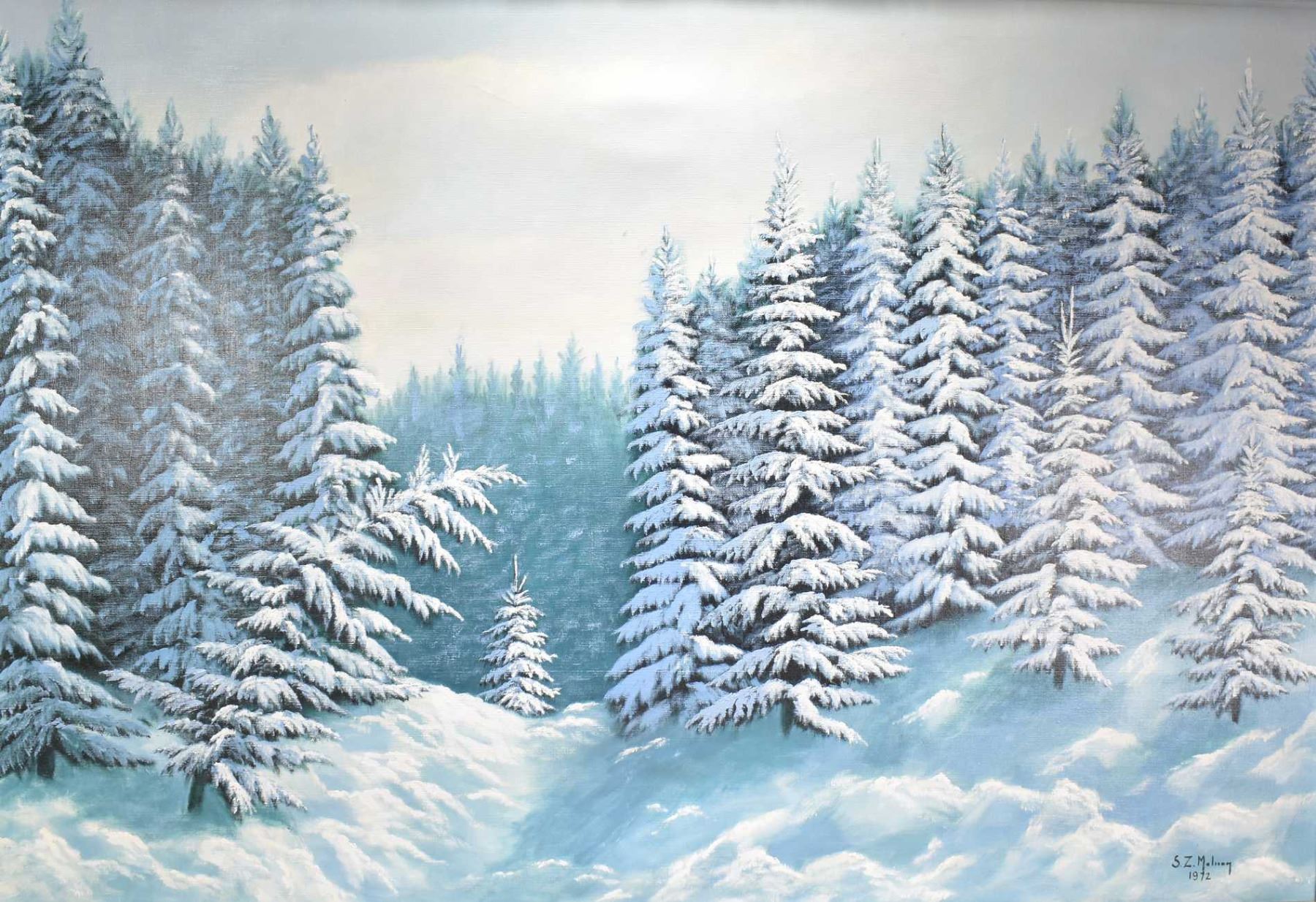 Two framed original paintings including oil on board forest fall scene signed by artist Sophia S. 1975, 22" X 28" and a oil on canvas winter forest scene signed by artist S.Z. Mallory 1972, 27" X 39". Not available for shipping. Local bidders only