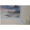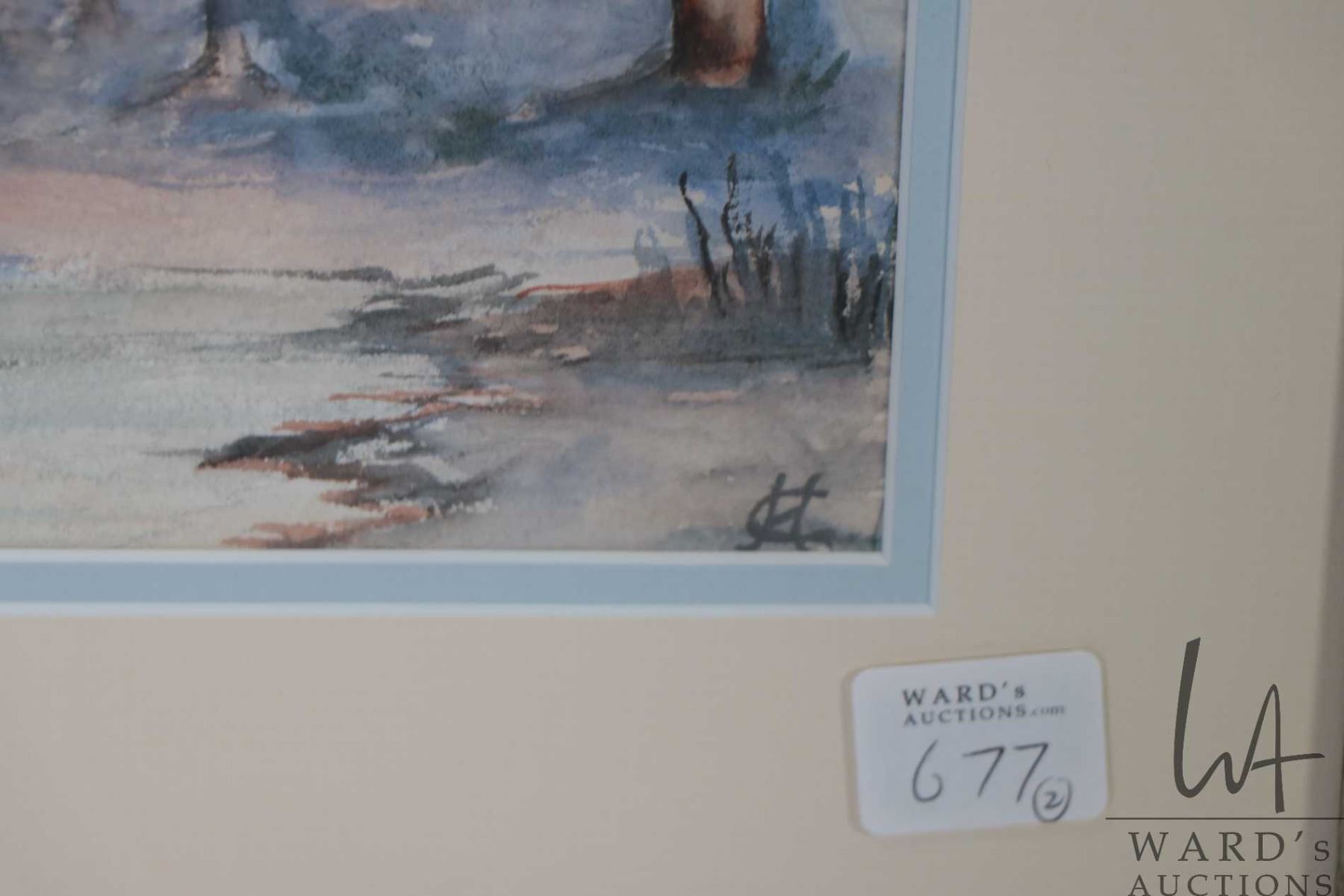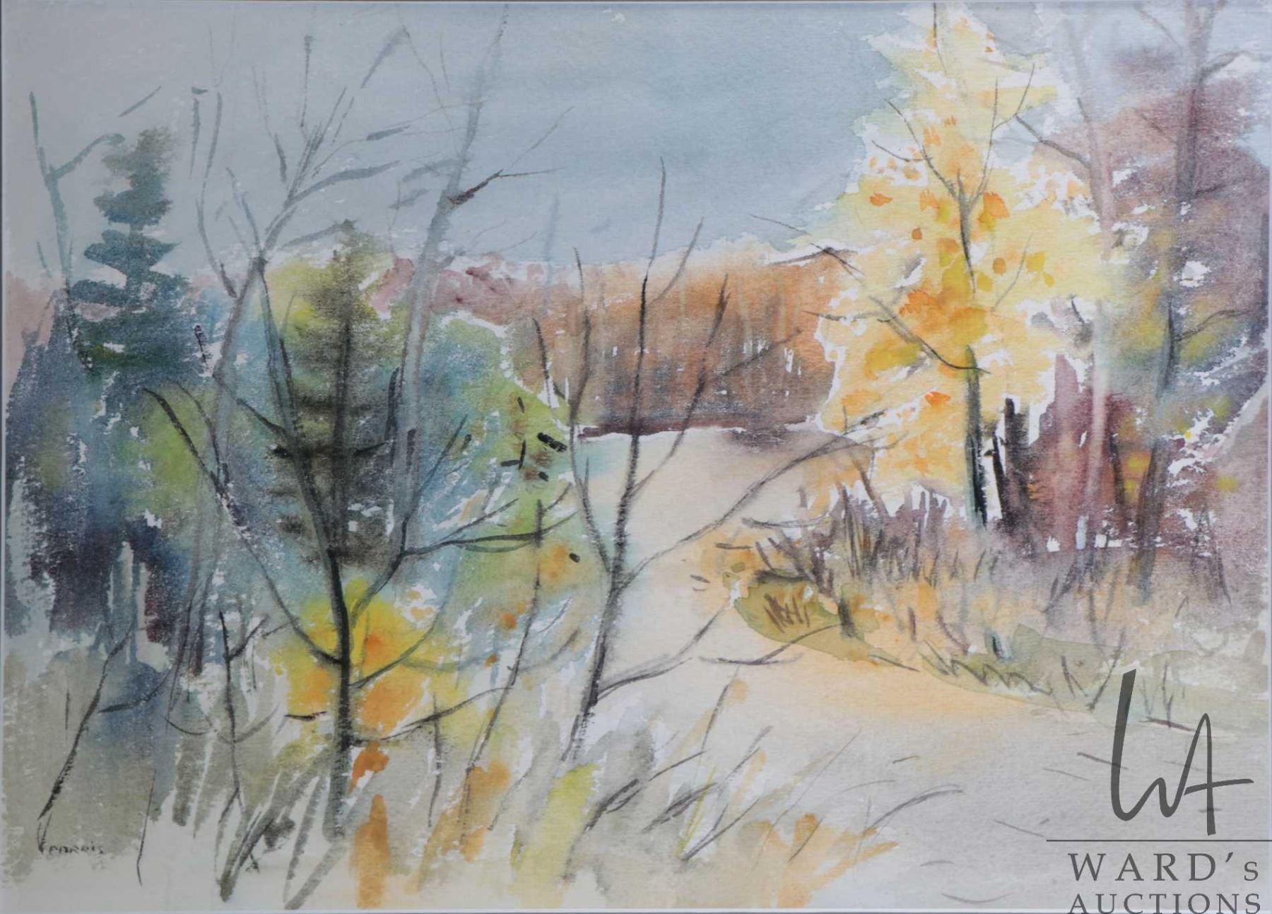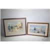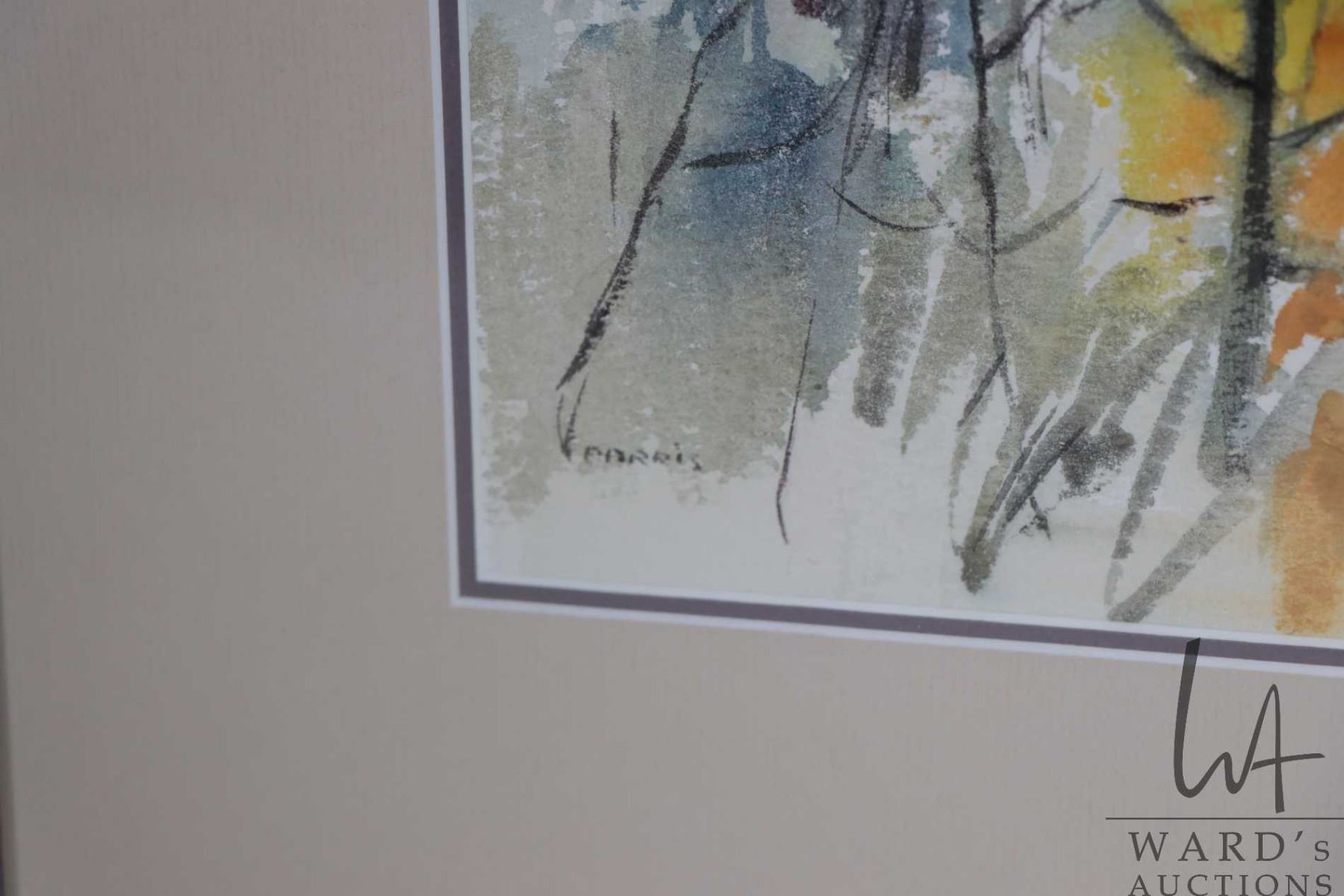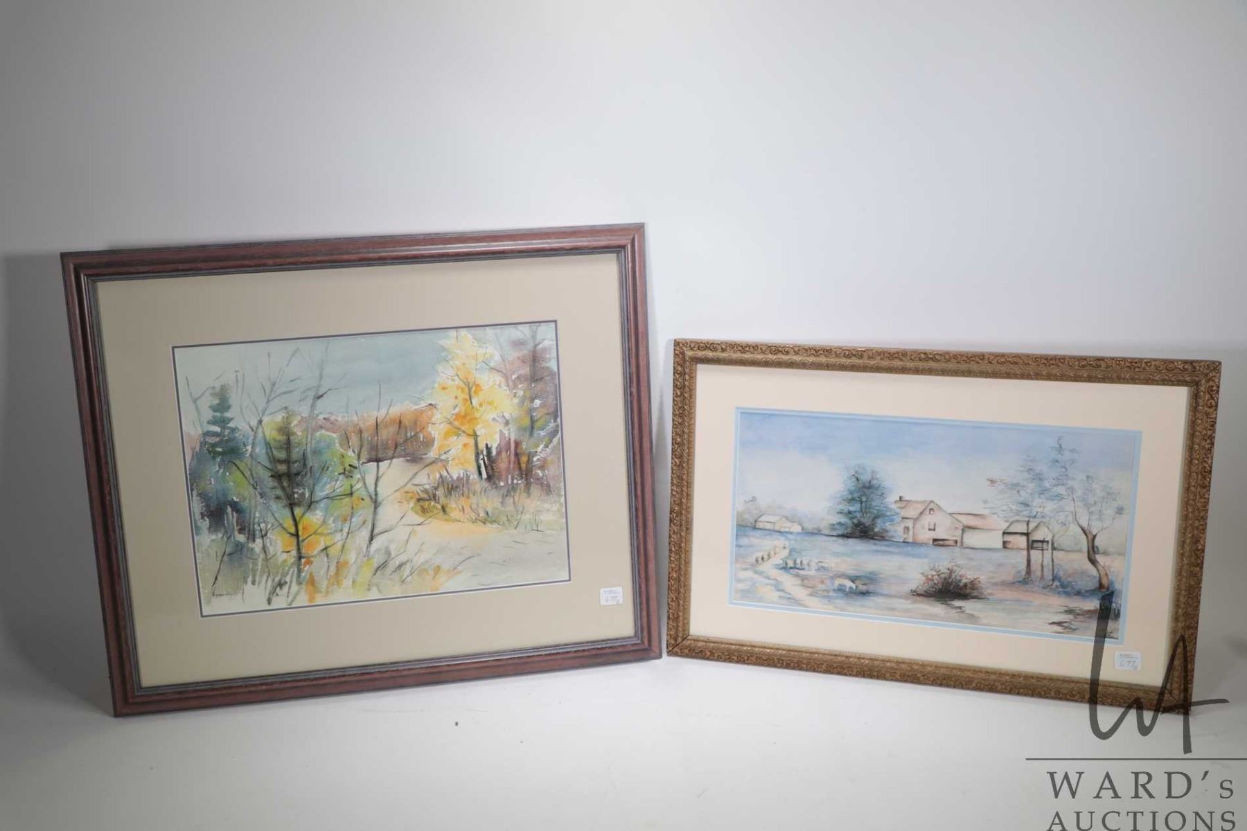 Two framed original watercolour paintings including fall scene by artist Mary Parris 11" X 15" and farm scene, artist signed but hidden under mat 9" X 16"
