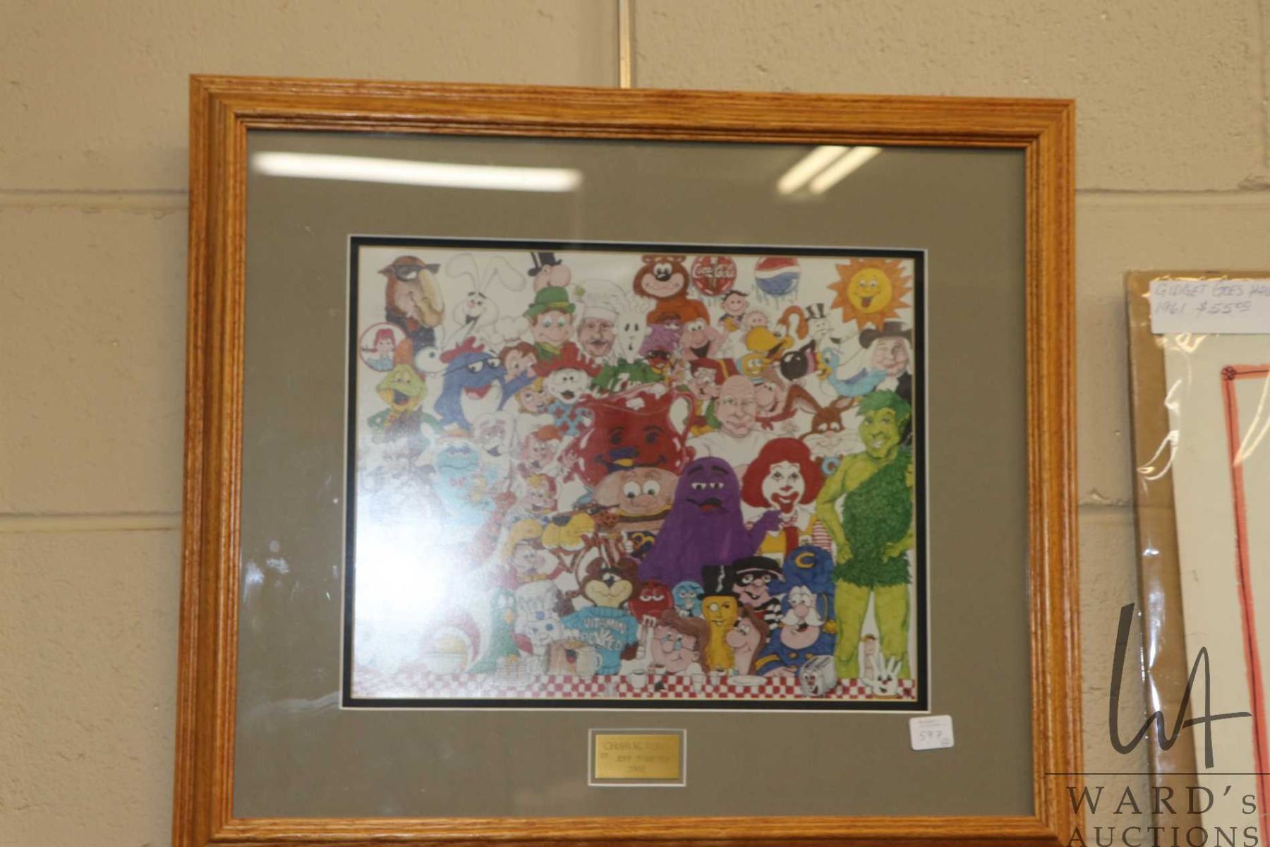 Two framed pictures including felt pen drawing titled "Characters" by Jeff Panchuk 2002, 11" X 14" plus a vintage car and winter homestead print