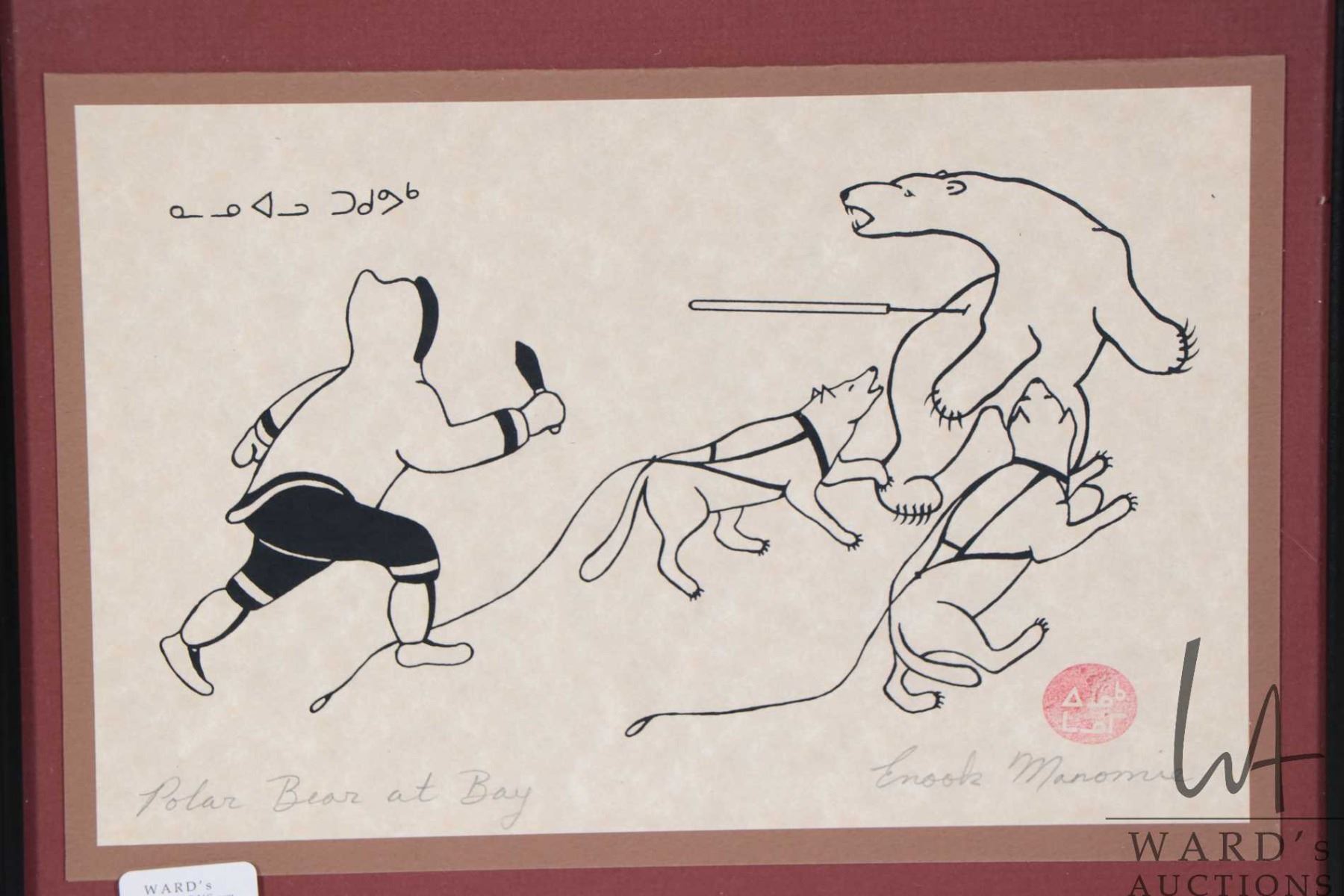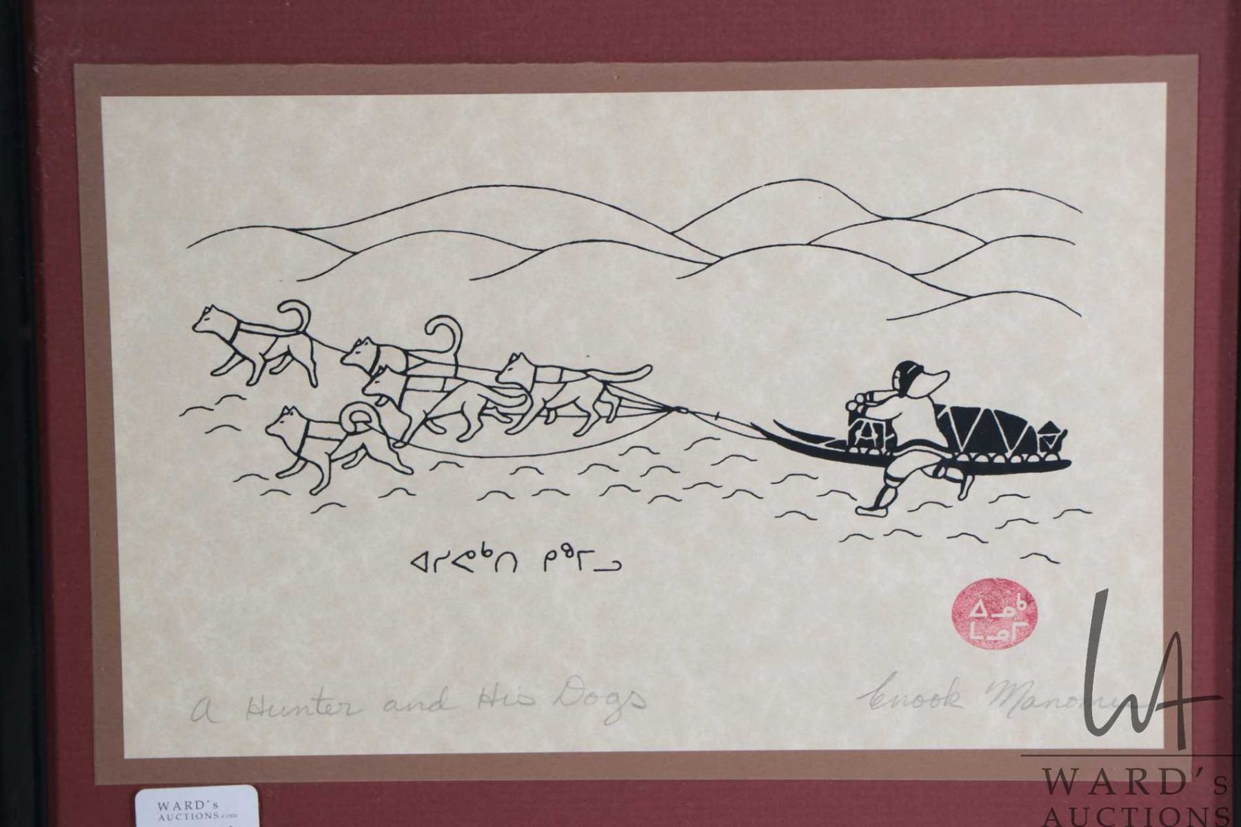 Two framed prints including "Polar at Bay" and "A Hunter and his Dogs" both pencil signed by artist Enook Manomie and both 9" X 5 1/2"