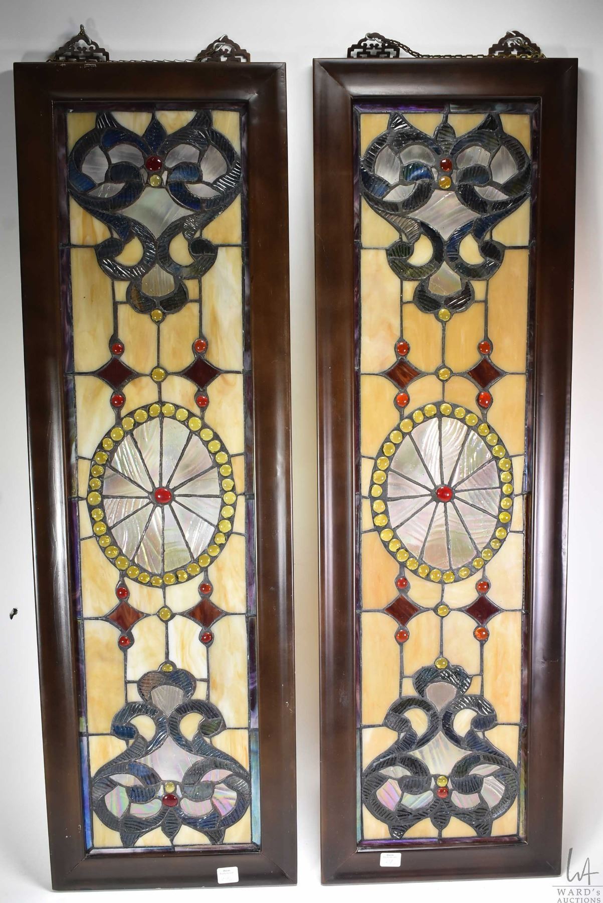 Two framed stained and leaded glass panels, each with overall dimension of 39" X 12"