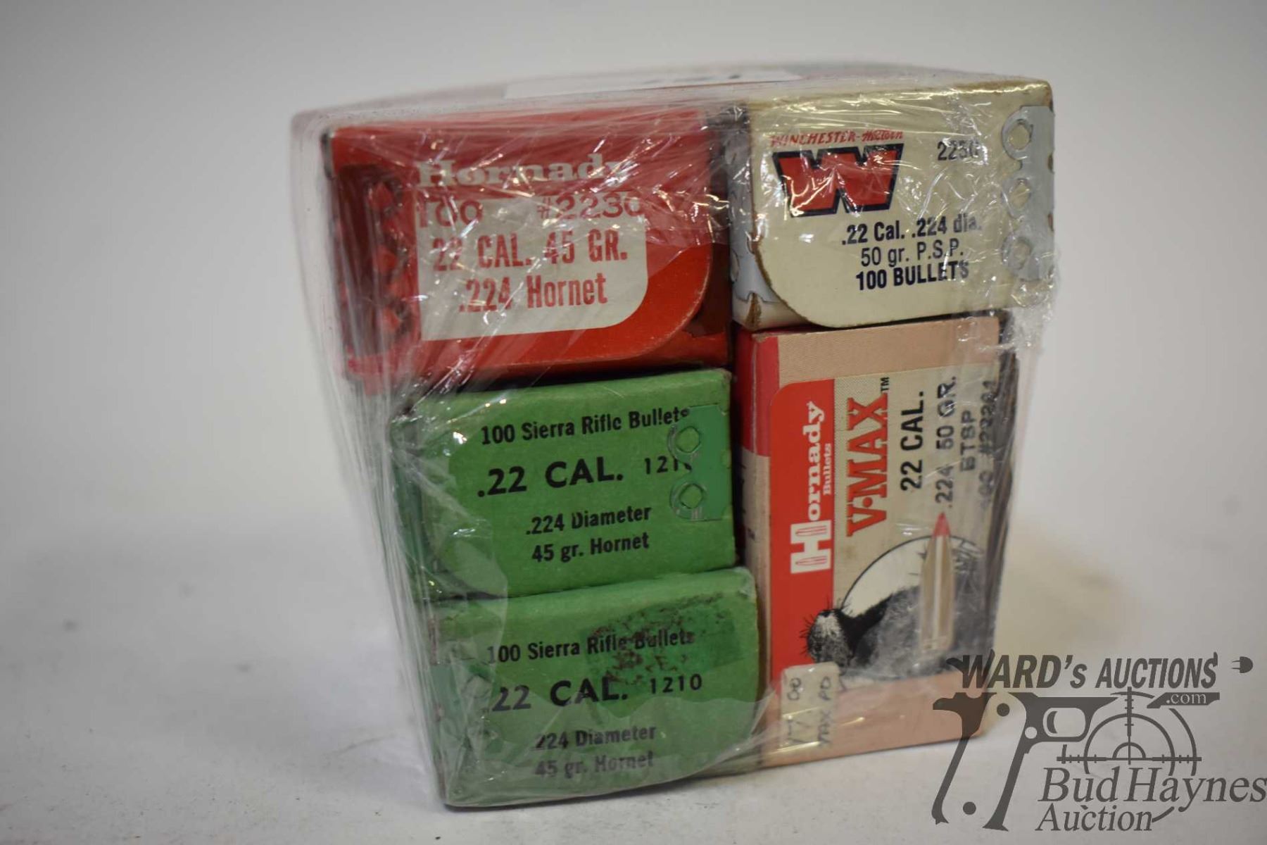 Two full 100 count boxes of Sierra .22 cal 45 gr Two full 100 count boxes of Sierra .22 cal 45 gr Hornet, one full 100 count box of Hornady .22 cal 50 gr v-max, one 100 count box of Winchester .22 cal 50 gr PSP and one 84 count box of Hornady .22 cal 45 gr Hornet