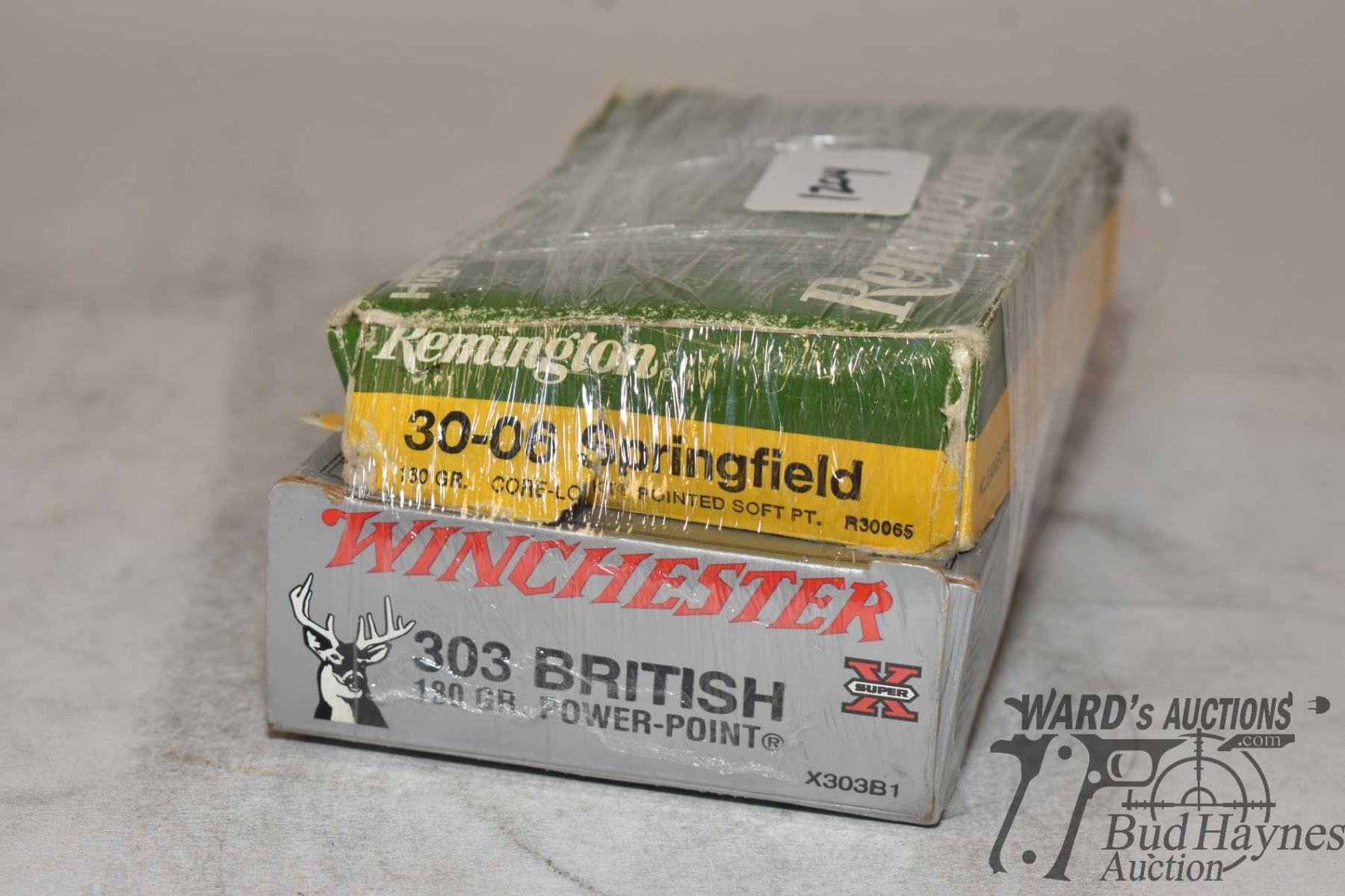 Two full 20 count boxes including one Winchester .303 brit w/ 11 factory and 9 reloads and a box of .30-06 reloads