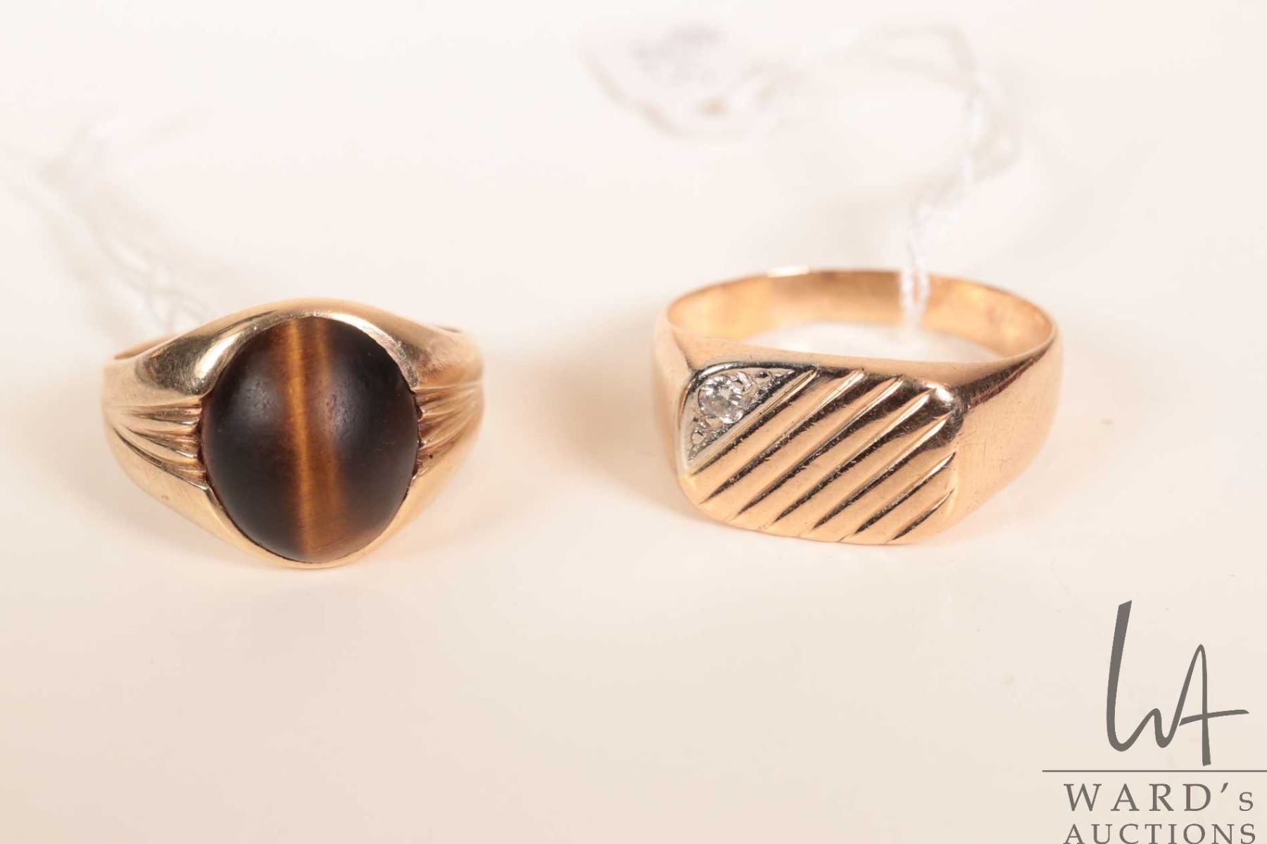 Two gent's 10kt yellow gold ring including one set with single accent diamond and sized 9.5 and a tiger's eye set ring sized 5.75