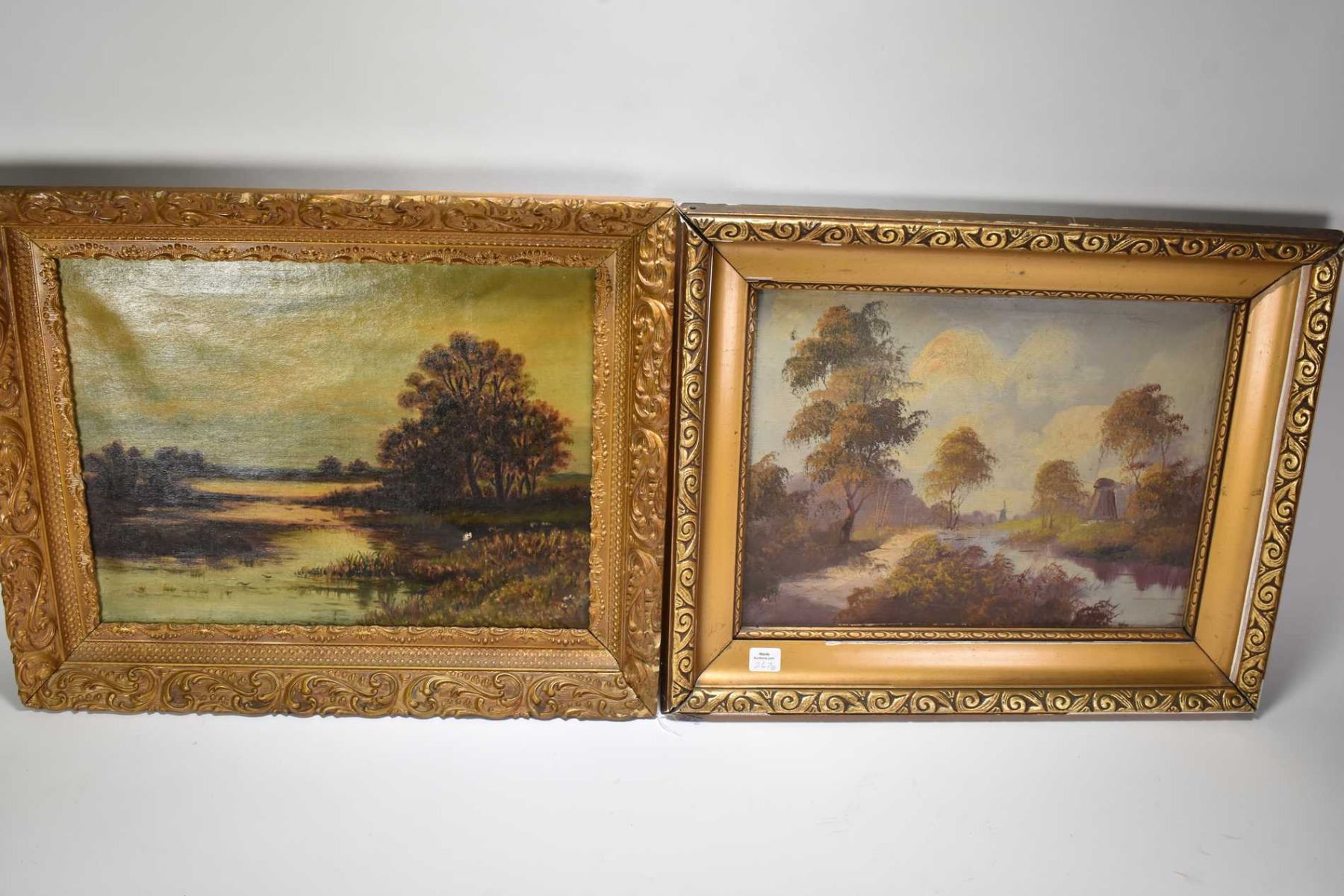 Two gilt framed painting including oil on canvas Dutch landscape with windmills and river, no artist signature seen and a oil on canvas of a creek side landscape, no signature, each painting 12" X 16"