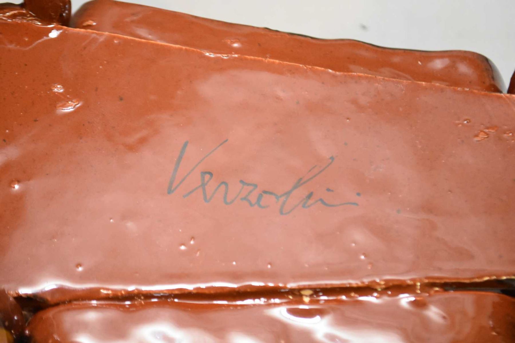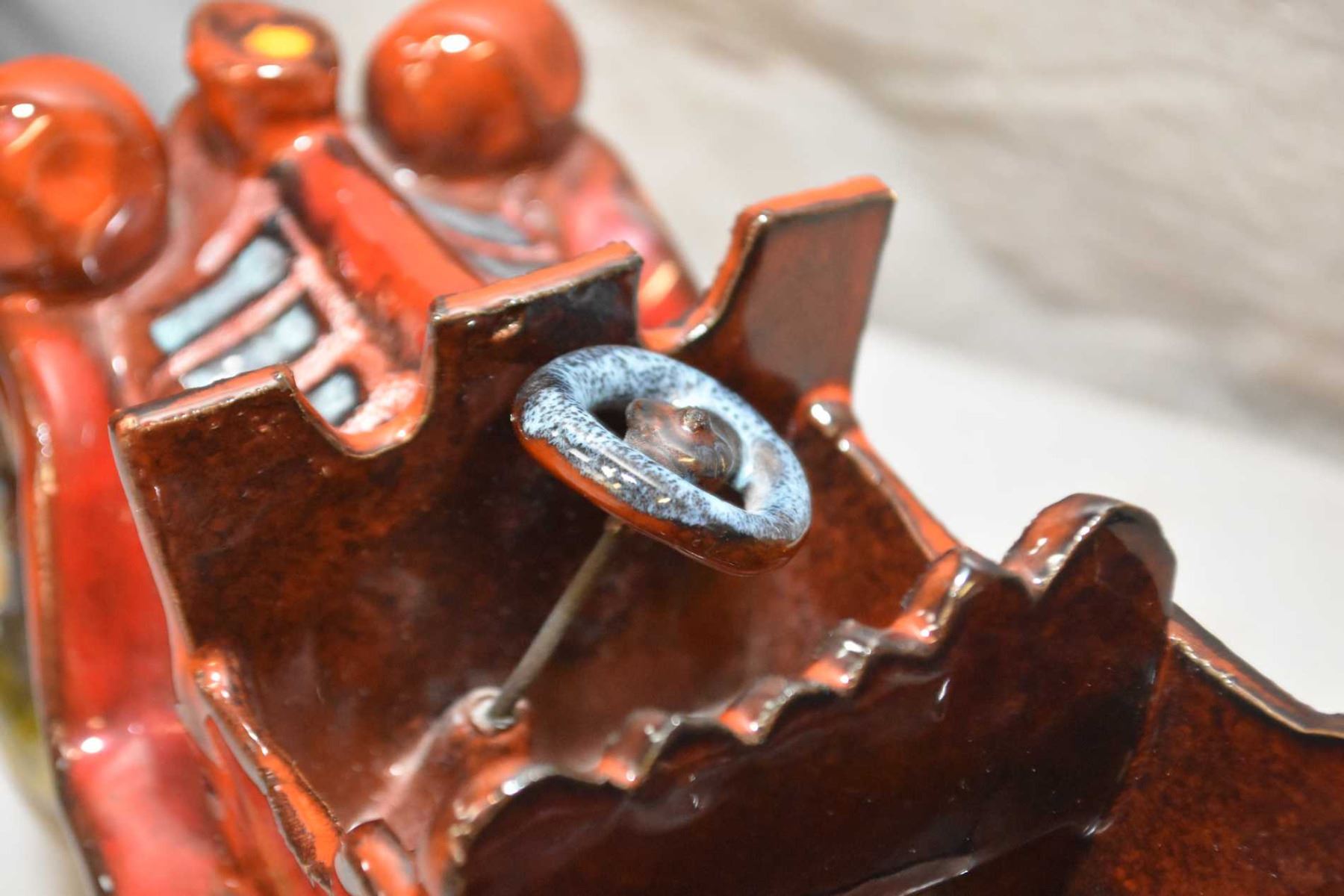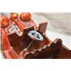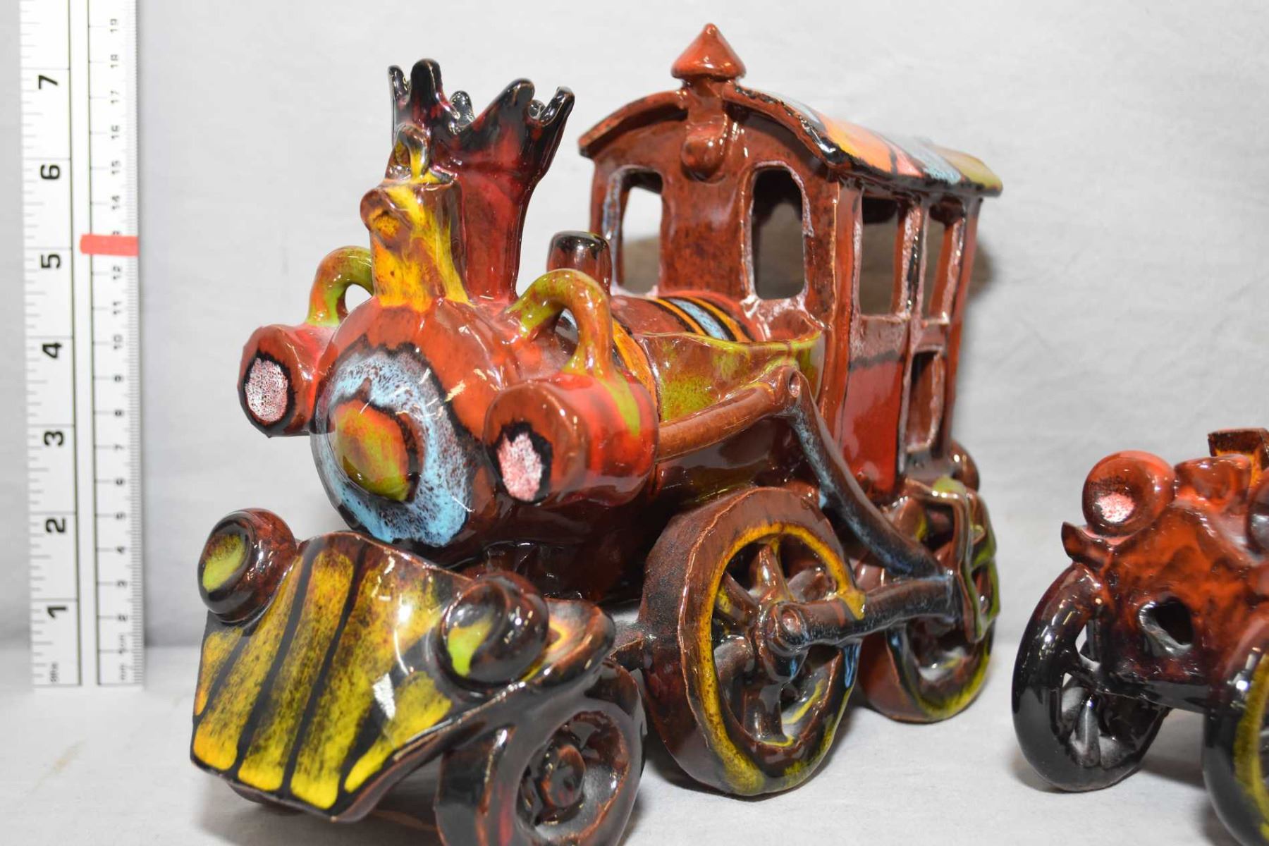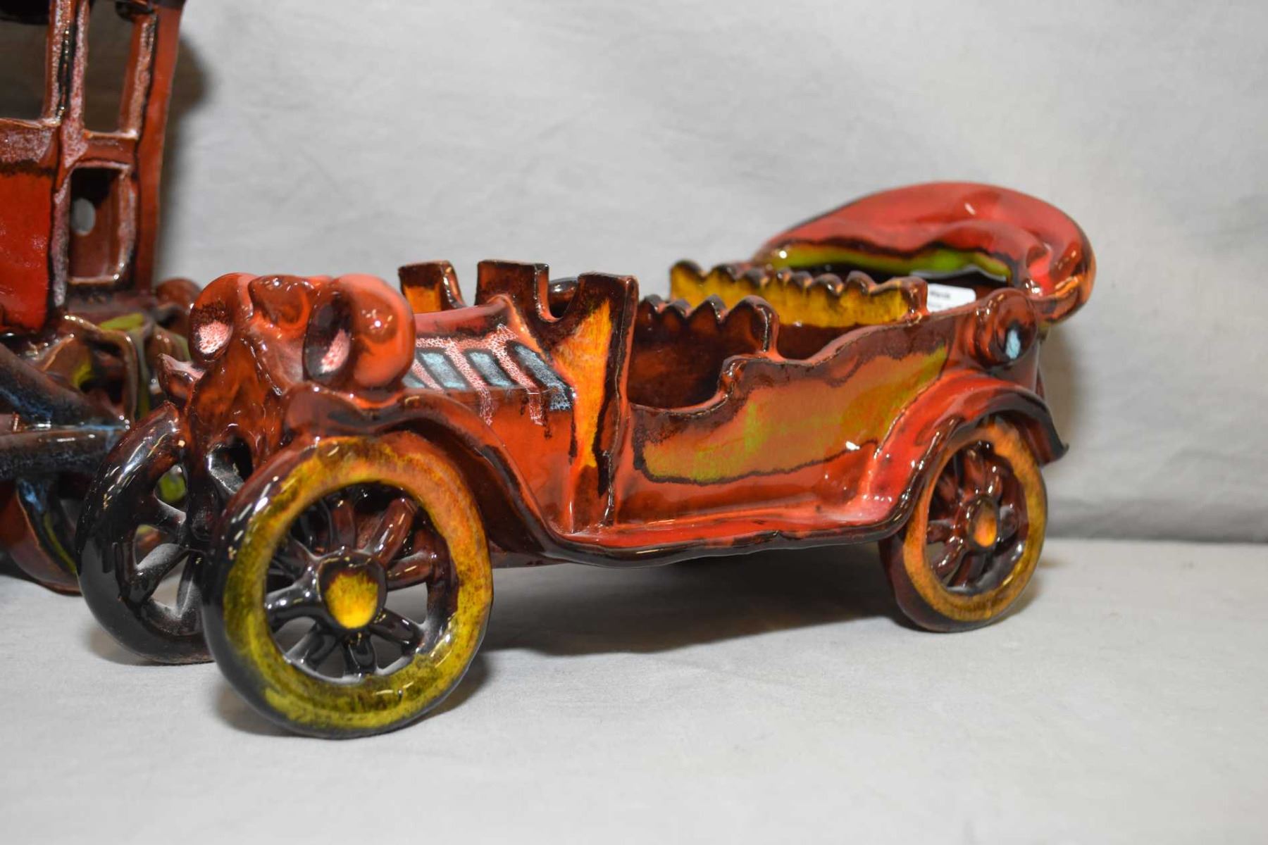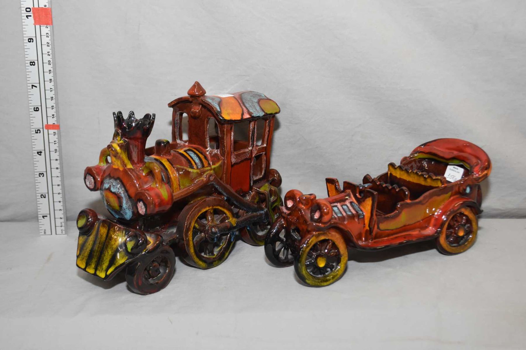 Two glazed pottery pieces including a vintage style car and a locomotive 7 1/2" in height
