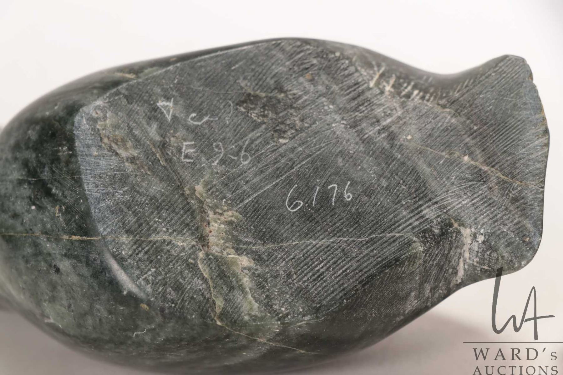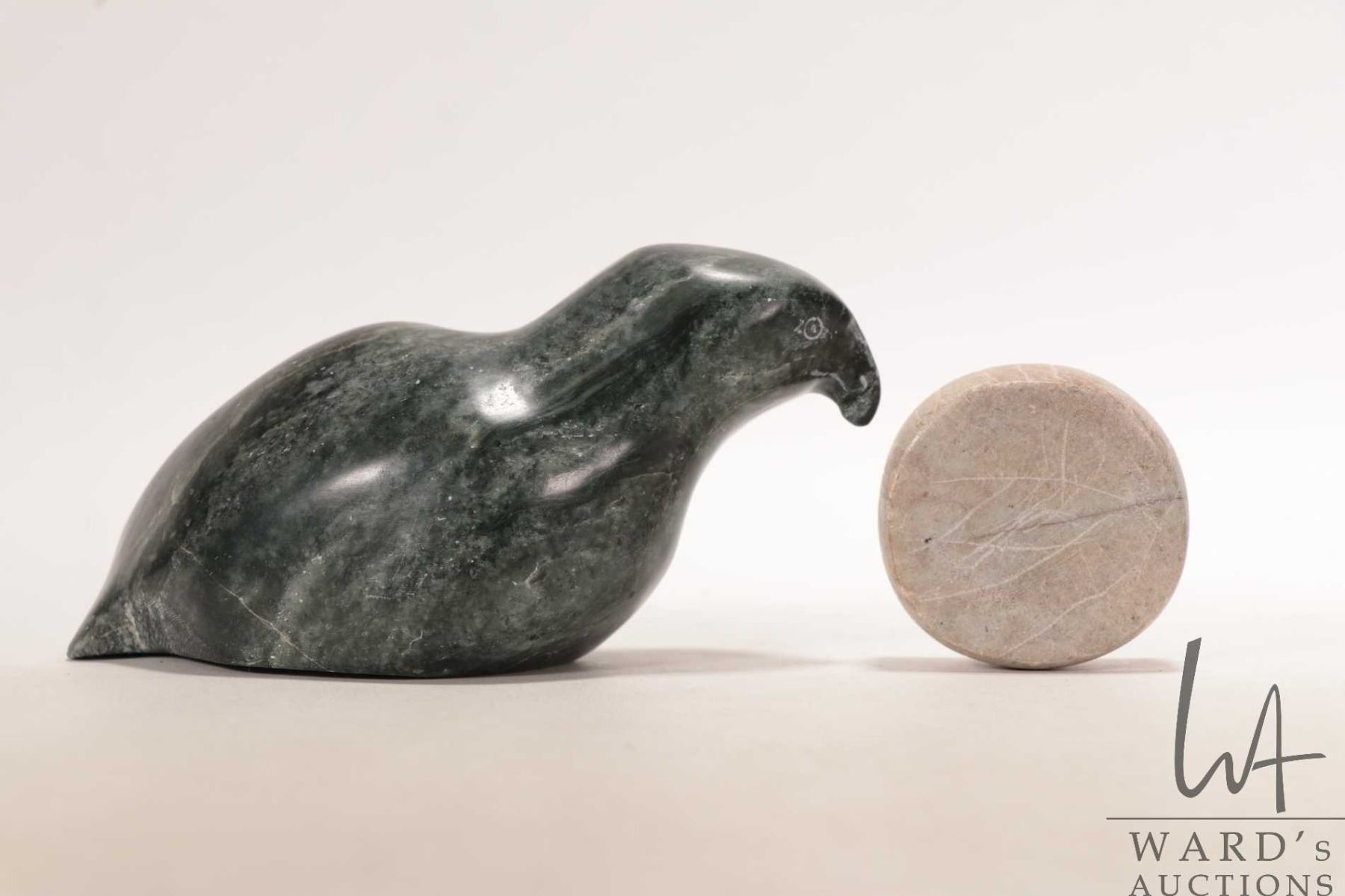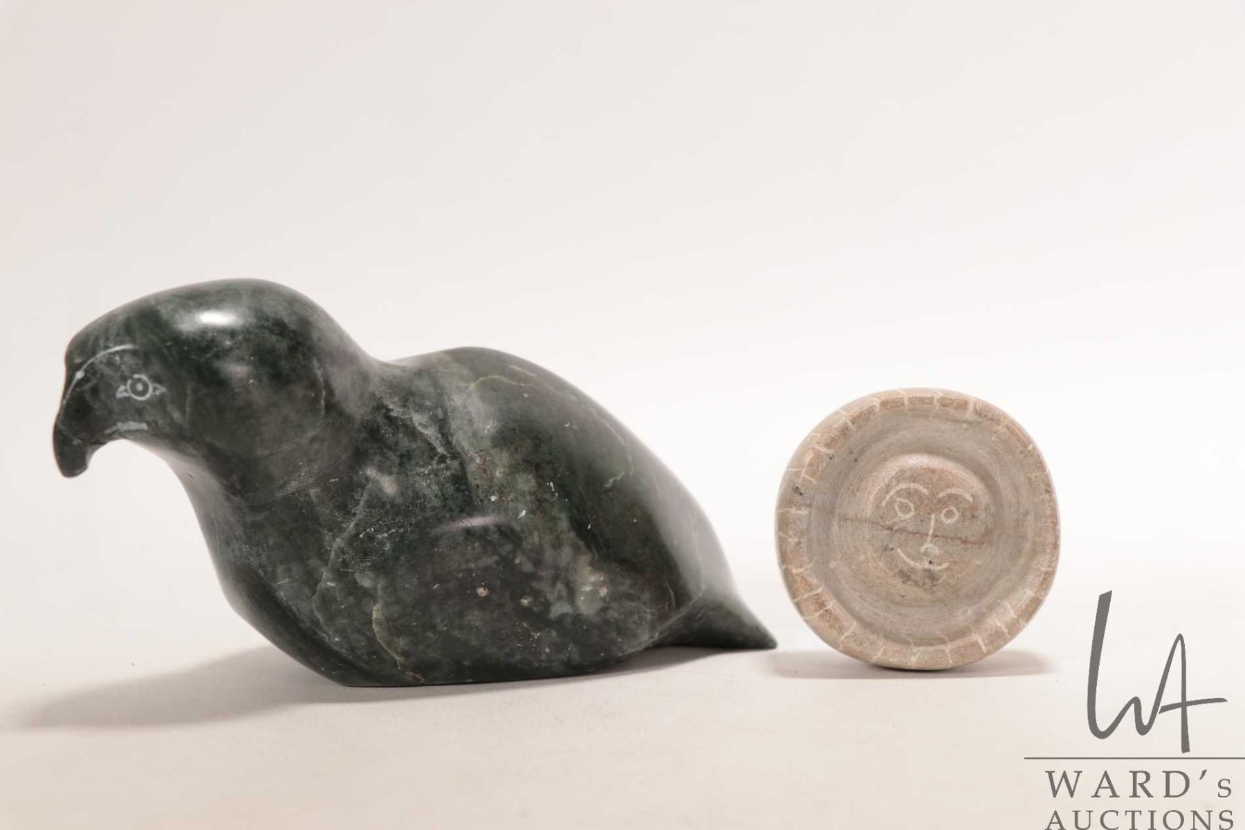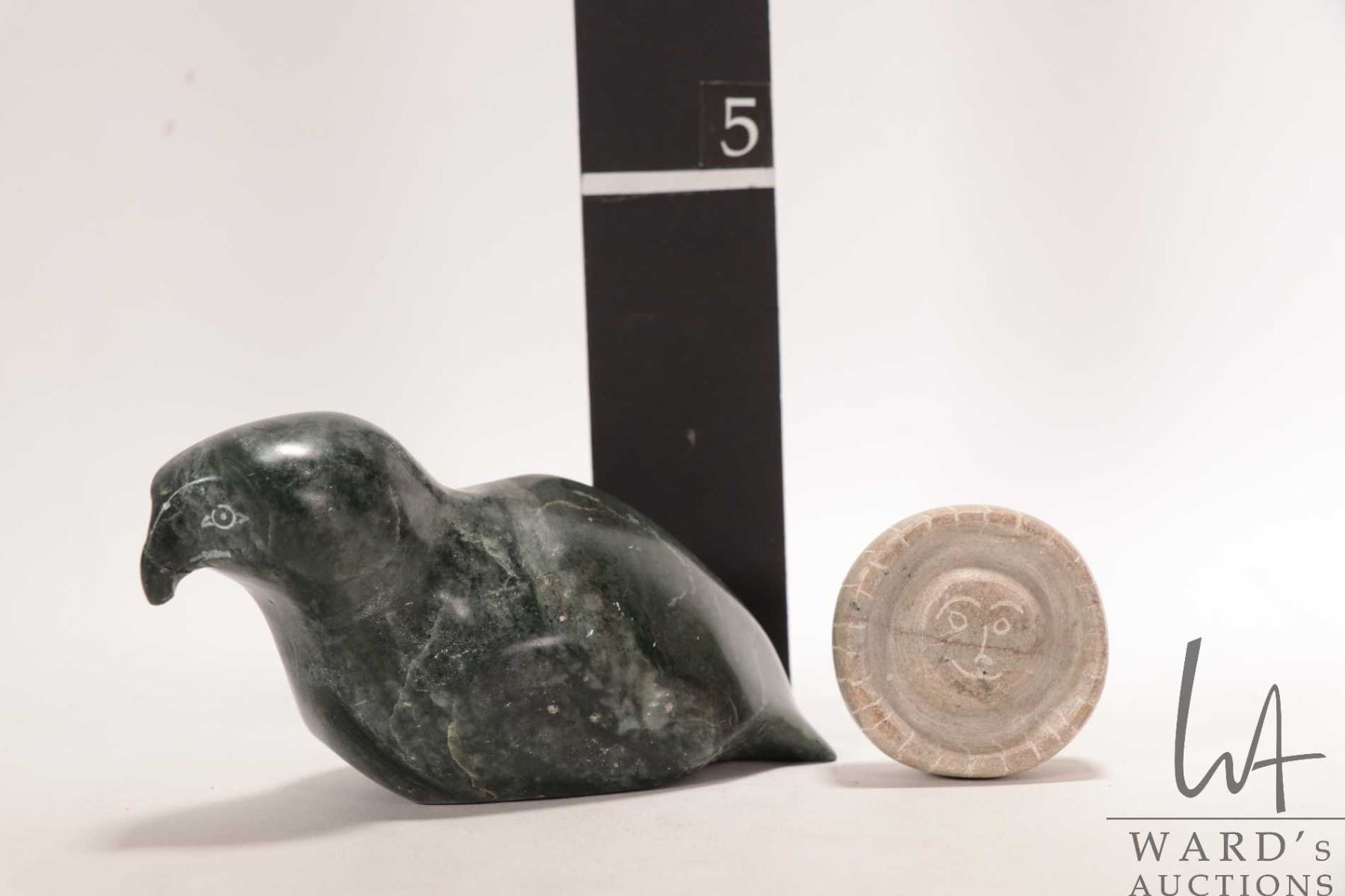 Two hand carved Inuit soapstone including 6" bird, signed in syllabics and an unsigned face/ sun, 2" in diameter