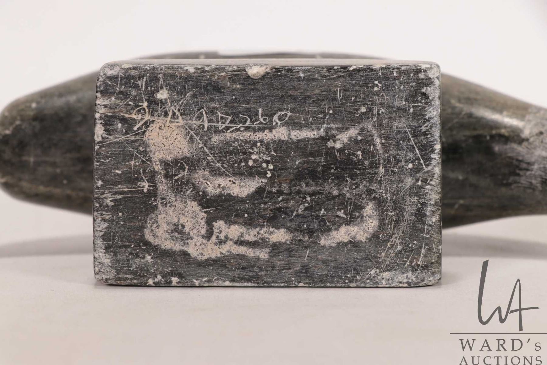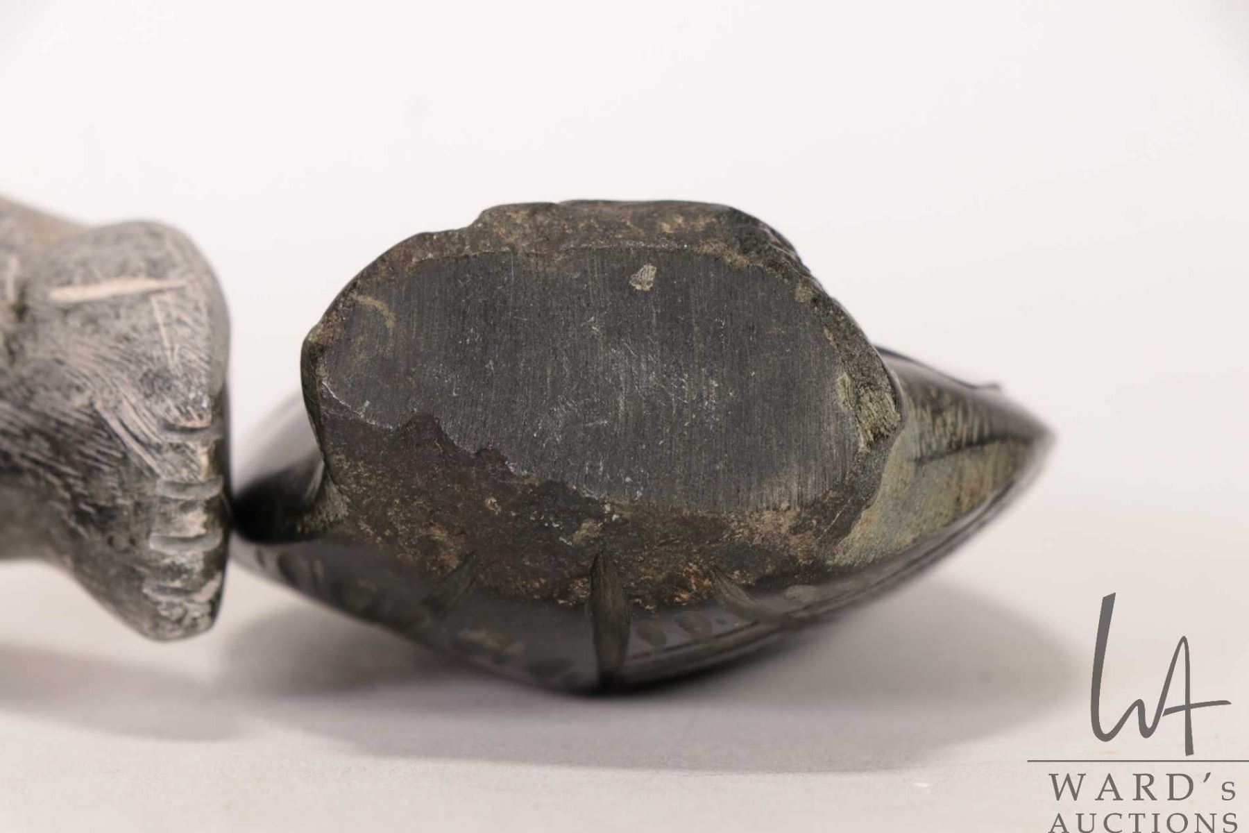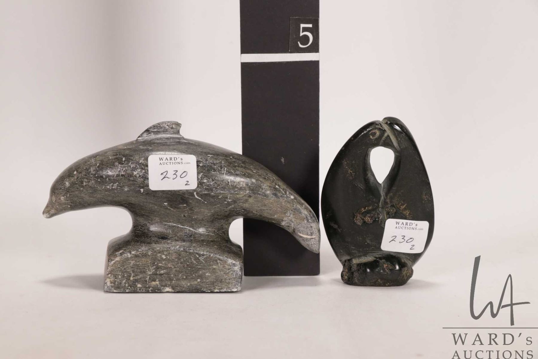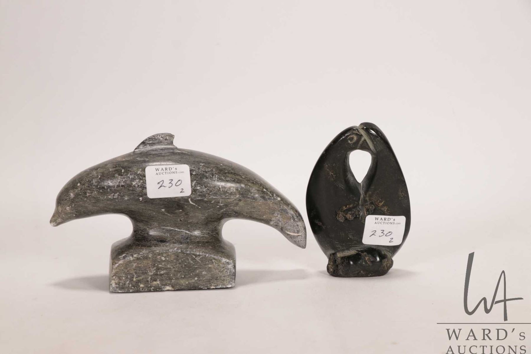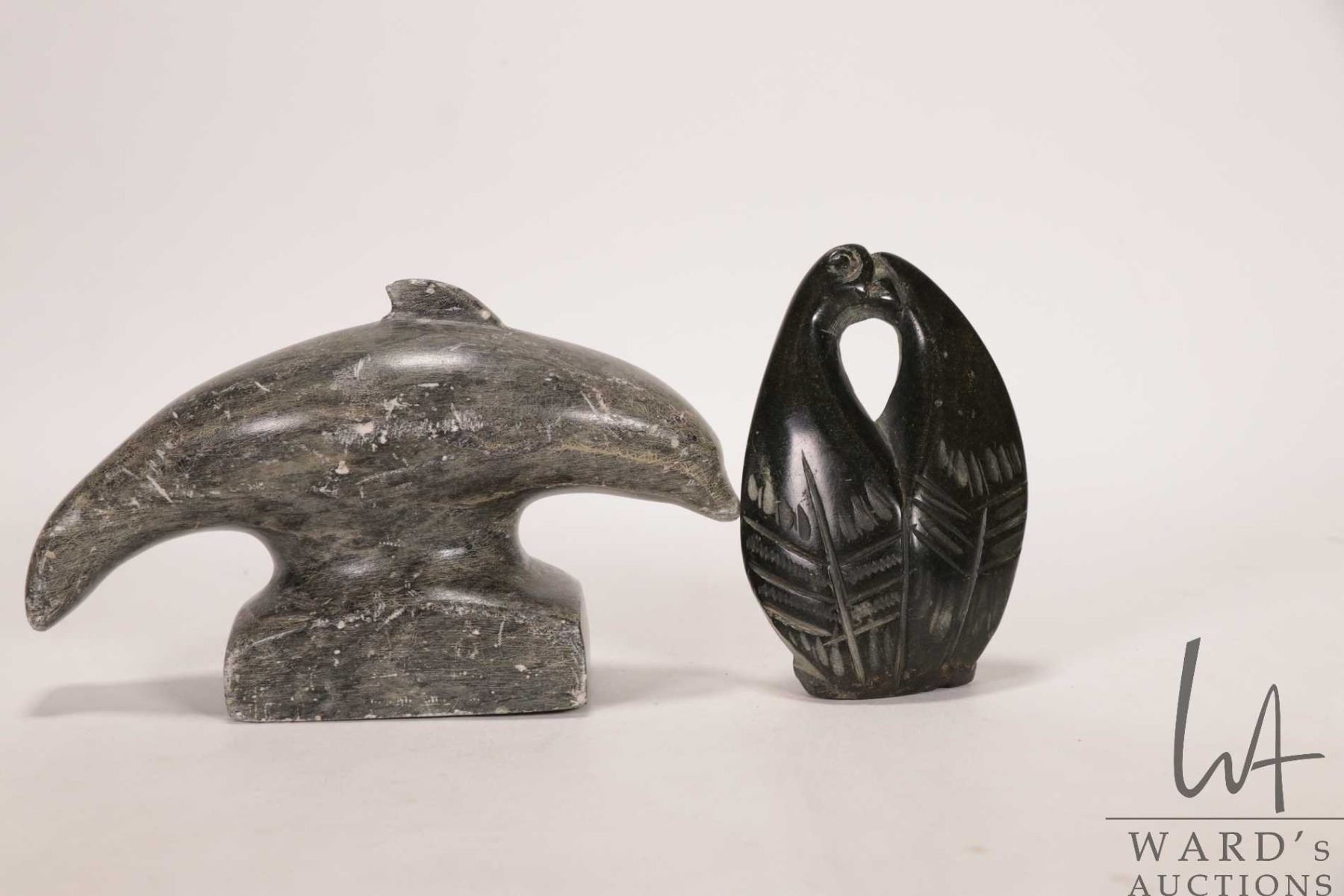 Two hand carved Inuit soapstones including 6" long dolphin, signed by artist in syllabics and a pair of penguins, no artist signature seen, 4" in height