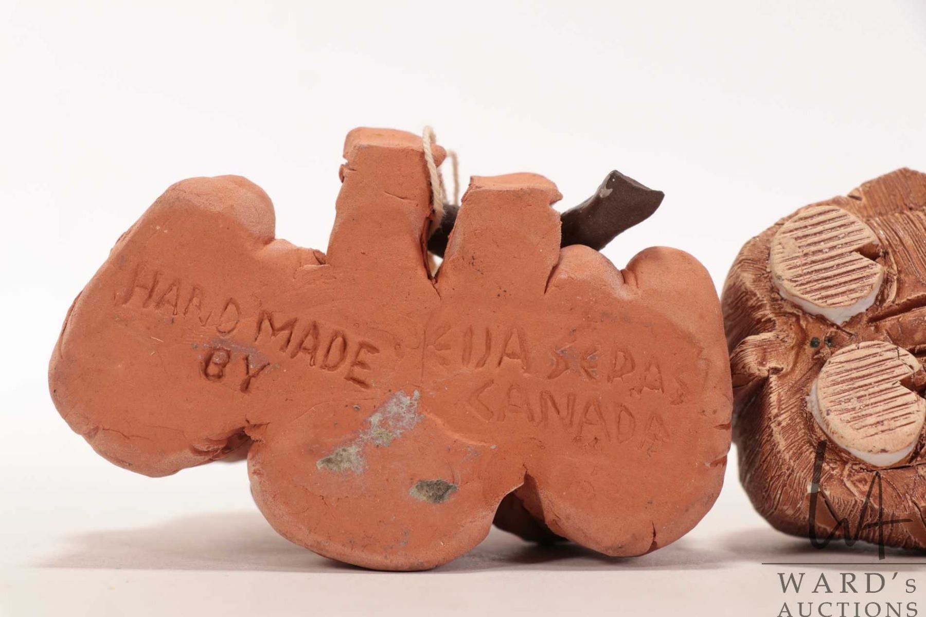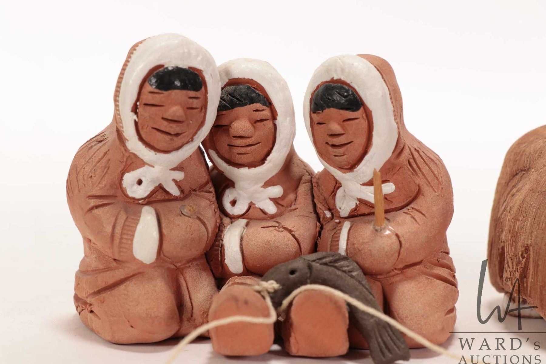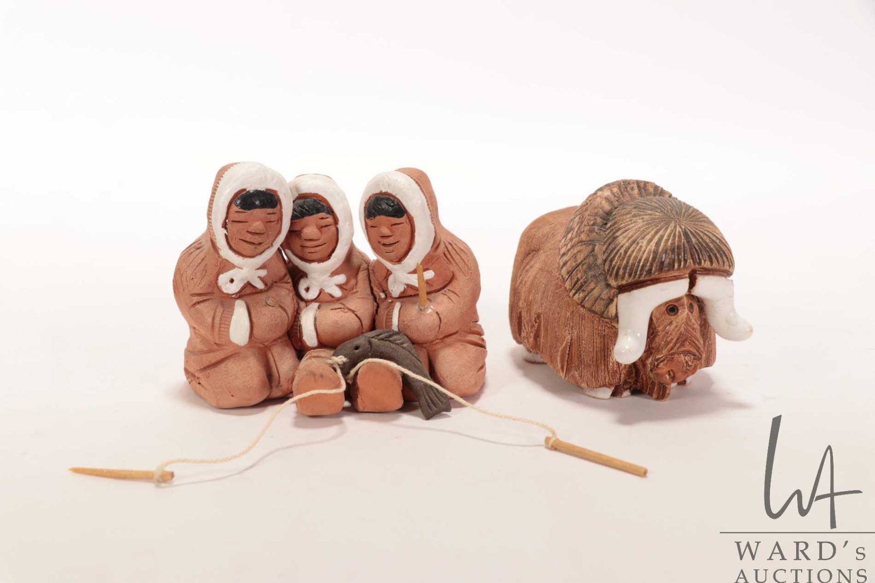 Two hand made clay figures including three Inuit children fishing and a musk ox, each approximately 2 1/2" in height