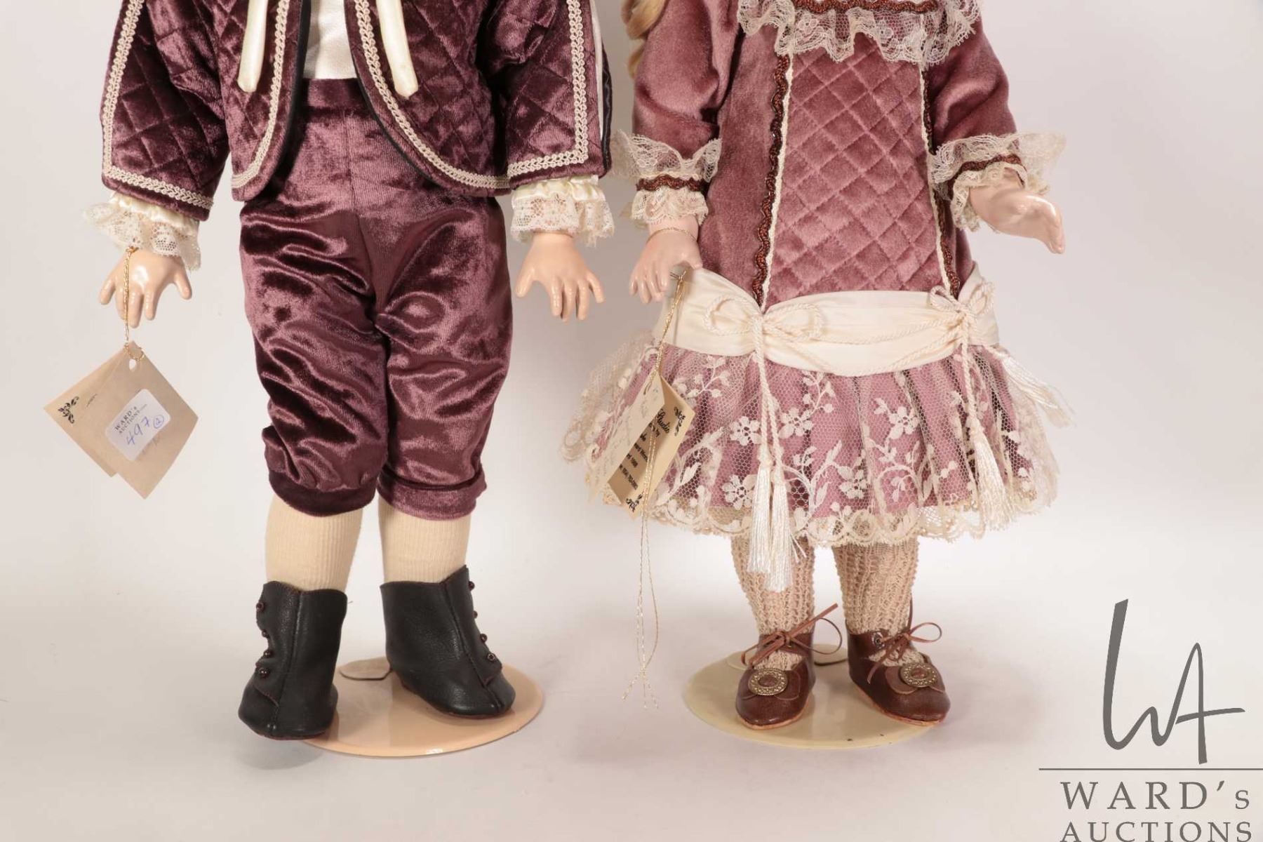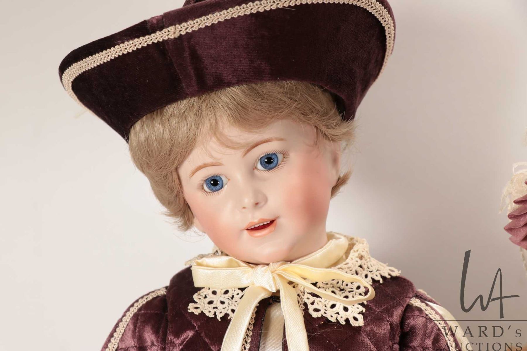 Two handmade reproduction dolls including A. T. 14 "Rentelle" with bisque head, threaded blue glass eyes, on five piece composition body, beautifully dressed with knitted socks, leather shoes, costume and hat plus a reproduction S.F.B.J. 238 with bisque head, threaded blue glass eyes, mohair wig, on five piece composition body, beautifully costumed. Both by doll artist Connie Drake and both approximately 18" in height
