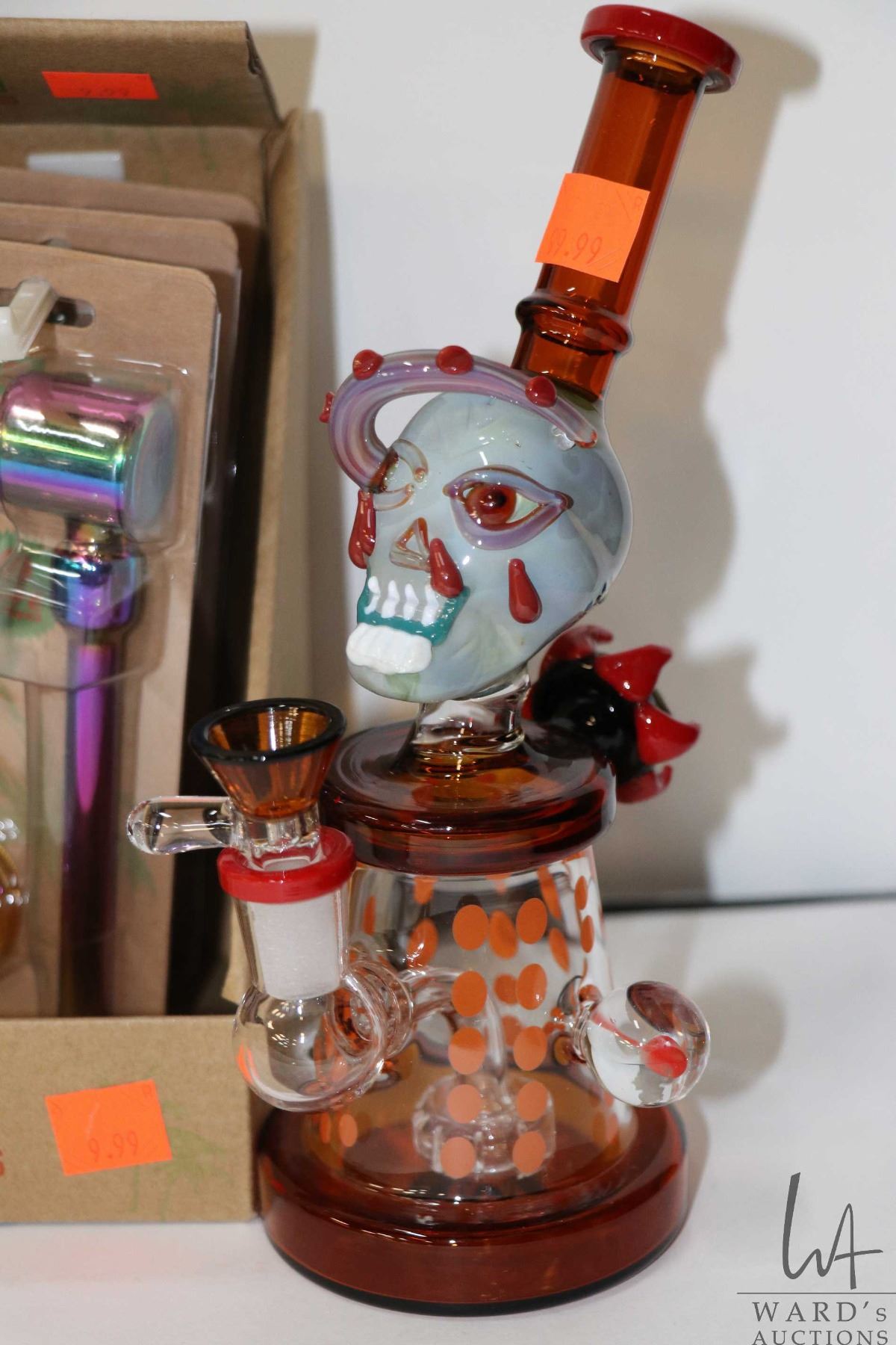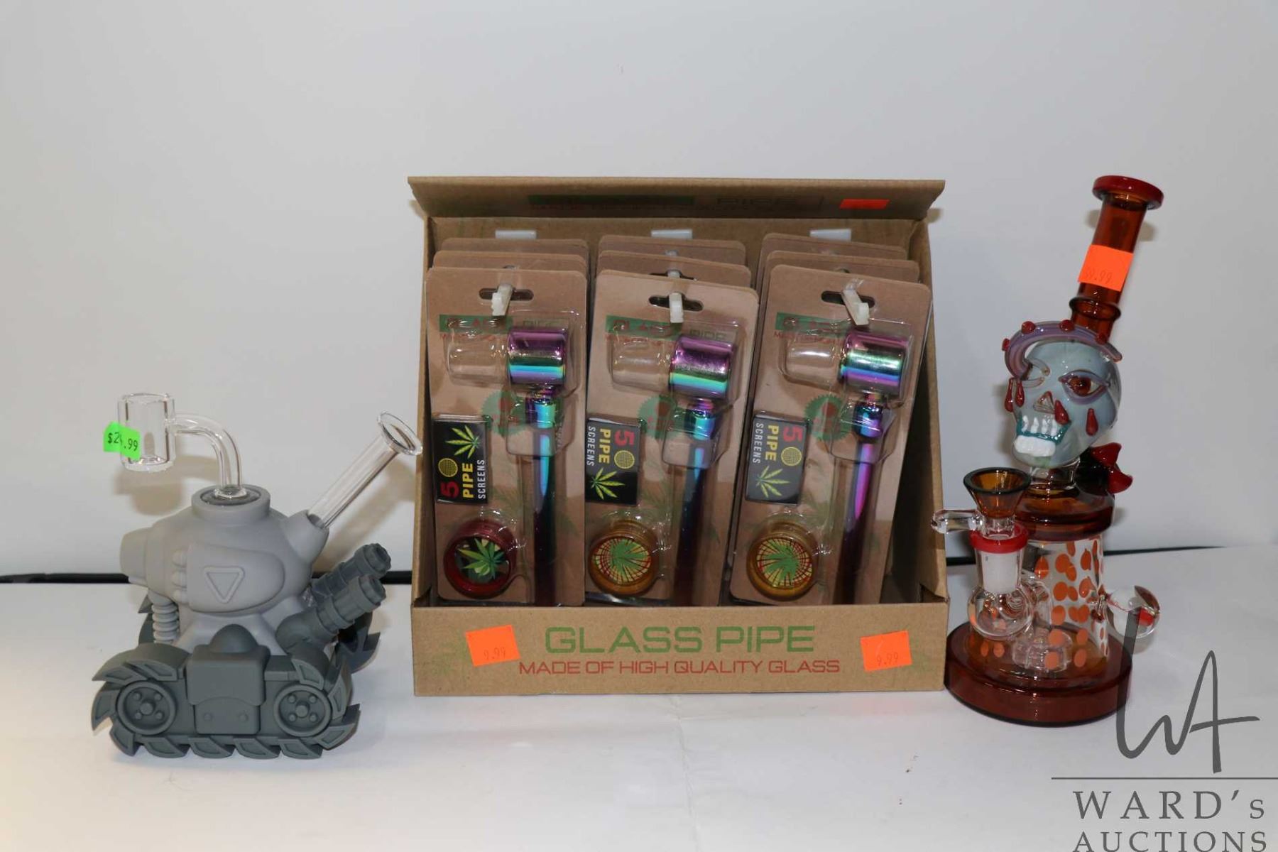 Two handmade water pipes including one glass and one plastic & glass. Plus selection of 9 glass pipes in display case Age Appropriate Canadian Buyers Only