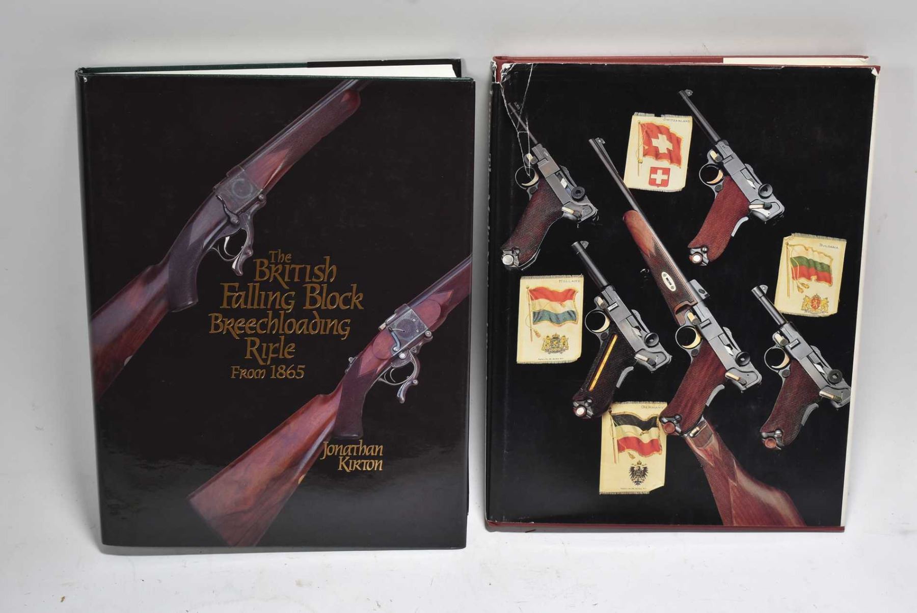 Two hardcover books including The British Falling Block Breach Loading Rifle from 1865 and Luger The Multi National Pistol