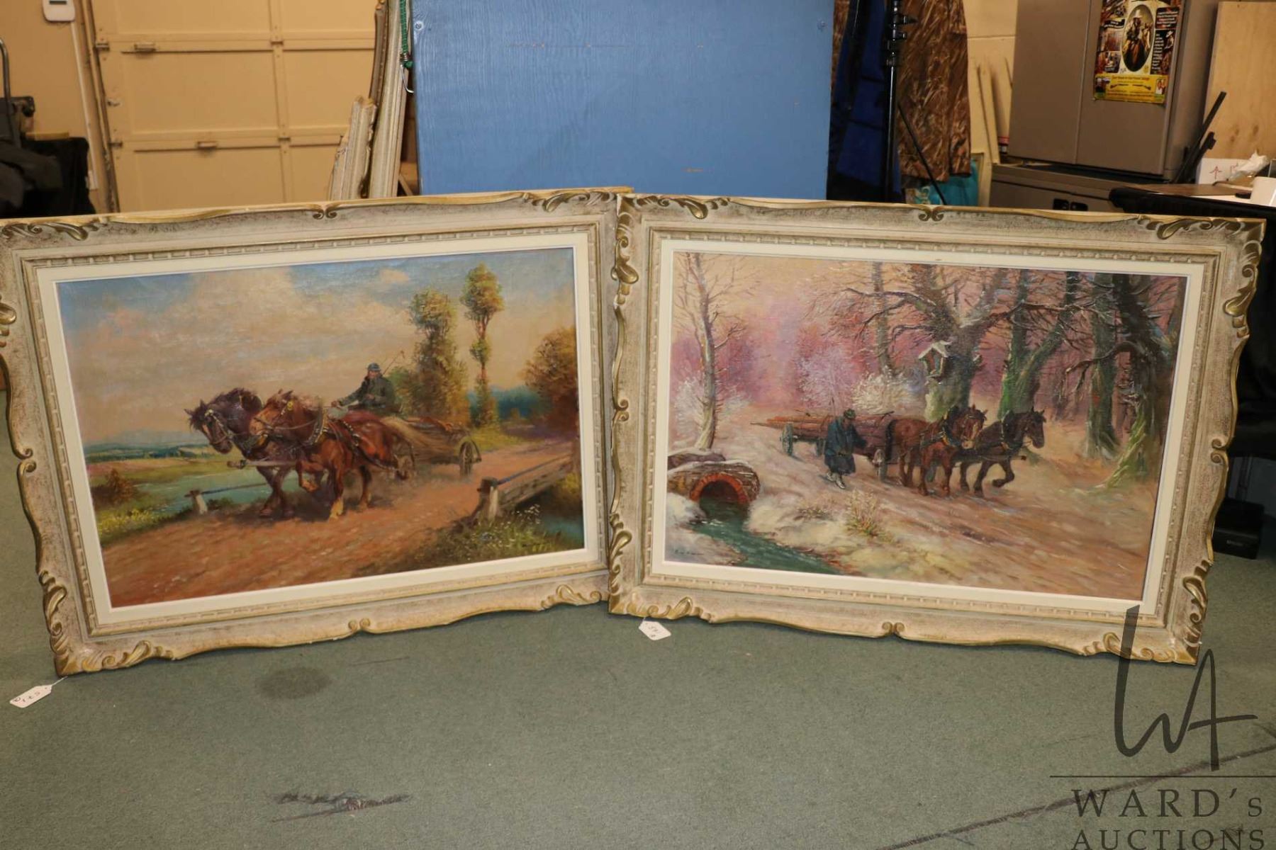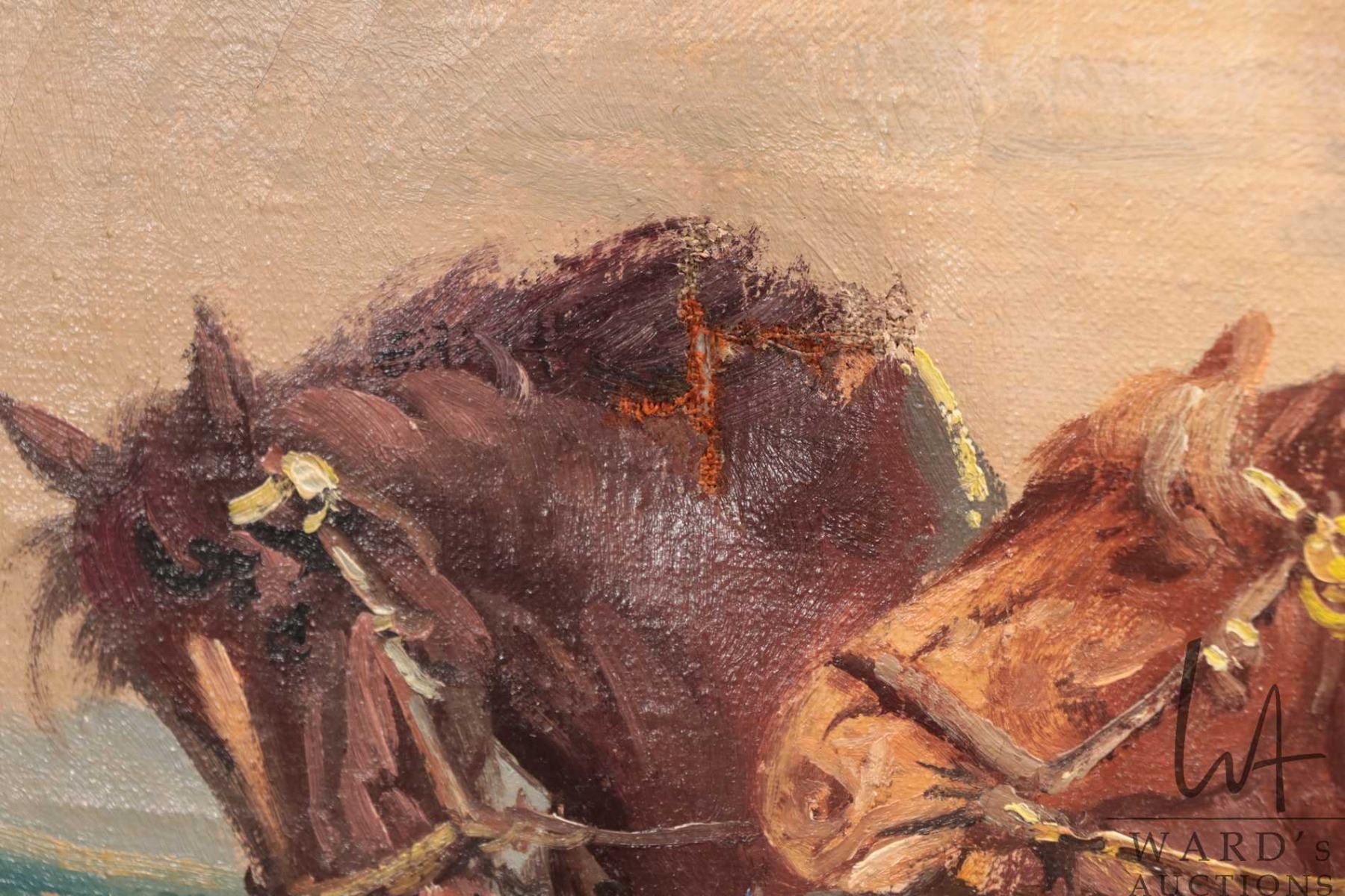 Two large framed oil on canvas paintings including one depicting horse logging, 25-1/2" X 36" and a horse drawn hay wagon, 25-3/4" X 35 1/2", note: tear in one horses neck, both art initialed by artist B--K-- --(?)